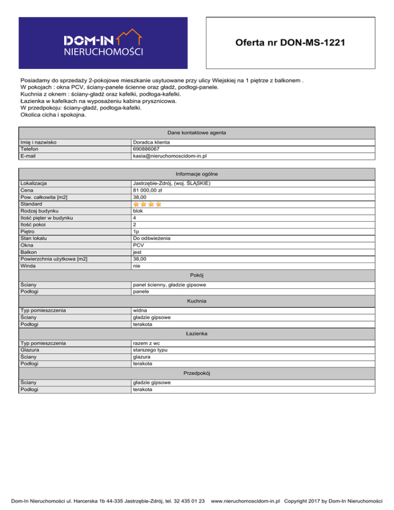 Oferta nr DON-MS-1221 Posiadamy do sprzedaży 2-pokojowe mieszkanie usytuowane przy ulicy Wiejskiej na 1 piętrze z balkonem . W pokojach : okna PCV, ściany-panele ścienne oraz gładź, podłogi-panele. Kuchnia z oknem : ściany-gładź oraz kafelki, podłoga-kafelki. Łazienka w kafelkach na wyposażeniu kabina prysznicowa. W przedpokoju: ściany-gładź, podłoga-kafelki. Okolica cicha i spokojna. Dane kontaktowe agenta Imię i nazwisko Telefon E-mail Doradca klienta 690886067 [email protected] Informacje ogólne Lokalizacja Cena Pow. całkowita [m2] Standard Rodzaj budynku Ilość pięter w budynku Ilość pokoi Piętro Stan lokalu Okna Balkon Powierzchnia użytkowa [m2] Winda Jastrzębie-Zdrój, (woj. ŚLĄSKIE) 81 000,00 zł 38,00 blok 4 2 1p Do odświeżenia PCV jest 38,00 nie Pokój Ściany Podłogi panel ścienny, gładzie gipsowe panele Kuchnia Typ pomieszczenia Ściany Podłogi widna gładzie gipsowe terakota Łazienka Typ pomieszczenia Glazura Ściany Podłogi razem z wc starszego typu glazura terakota Przedpokój Ściany Podłogi gładzie gipsowe terakota Dom-In Nieruchomości ul. Harcerska 1b 44-335 Jastrzębie-Zdrój, tel. 32 435 01 23 www.nieruchomoscidom-in.pl Copyright 2017 by Dom-In Nieruchomości