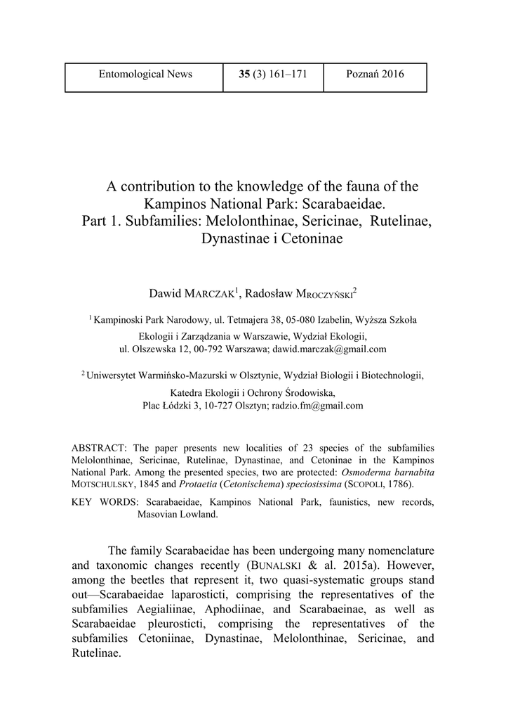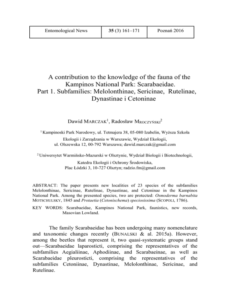 Entomological News 35 (3) 161–171 Poznań 2016 A contribution to the knowledge of the fauna of the Kampinos National Park: Scarabaeidae. Part 1. Subfamilies: Melolonthinae, Sericinae, Rutelinae, Dynastinae i Cetoninae Dawid MARCZAK1, Radosław MROCZYŃSKI2 1 Kampinoski Park Narodowy, ul. Tetmajera 38, 05-080 Izabelin, Wyższa Szkoła Ekologii i Zarządzania w Warszawie, Wydział Ekologii, ul. Olszewska 12, 00-792 Warszawa; [email protected] 2 Uniwersytet Warmińsko-Mazurski w Olsztynie, Wydział Biologii i Biotechnologii, Katedra Ekologii i Ochrony Środowiska, Plac Łódzki 3, 10-727 Olsztyn; [email protected] ABSTRACT: The paper presents new localities of 23 species of the subfamilies Melolonthinae, Sericinae, Rutelinae, Dynastinae, and Cetoninae in the Kampinos National Park. Among the presented species, two are protected: Osmoderma barnabita MOTSCHULSKY, 1845 and Protaetia (Cetonischema) speciosissima (SCOPOLI, 1786). KEY WORDS: Scarabaeidae, Kampinos National Park, faunistics, new records, Masovian Lowland. The family Scarabaeidae has been undergoing many nomenclature and taxonomic changes recently (BUNALSKI & al. 2015a). However, among the beetles that represent it, two quasi-systematic groups stand out—Scarabaeidae laparosticti, comprising the representatives of the subfamilies Aegialiinae, Aphodiinae, and Scarabaeinae, as well as Scarabaeidae pleurosticti, comprising the representatives of the subfamilies Cetoniinae, Dynastinae, Melolonthinae, Sericinae, and Rutelinae. 162 D. MARCZAK, R. MROCZYŃSKI In the Polish fauna, the group Scarabaeidae pleurosticti is represented by 39 species (BURAKOWSKI & al. 1983, LÖBL & SMETANA 2006, BUNALSKI 2004), including Melolonthinae – 15 species, Sericinae – 3, Rutelinae – 4, Dynastinae – 1, Cetoniinae – 16. From the area of the Kampinos National Park, 10 confirmed species from this group have been recorded (ZIMKA 1974; PLEWKA 1981, 2003; KUBICKA 1991; BYK 1999; KUBISZ & al. 2000, OLSZEWSKI & al. 2010, MARCZAK 2010, MARCZAK & all. 2010, 2012; SKŁODOWSKI & GRYZ 2012). Moreover, PLEWKA (1981, 2003) reported incorrectly the Omaloplia (Omaloplia) ruricola (FABRICIUS 175) from the area of the park; however, the species was expelled from the Polish fauna (BUNALSKI 1994), and any data on its occurrence should be ascribed to Omaloplia (Omaloplia) nigromarginata (HERBST, 1786). The aim of the following study is to supplement the data concerning the occurrence of the representatives of the subfamilies discussed from the area of the Kampinos National Park. The data come from the authors’ observations and field researches, which have intensified in recent years. The evidence specimens are stored in the authors’ collections and naturalistic collections of the Kampinos National Park. In the study, the following abbreviations have been used: SPA – Strict Protection Area, KNP – the Kampinos National Park, IBL-2 – a screen trap, IBL-5 – a barrier trap. Each locality has been supplemented with a code of the corresponding UTM grid net. The taxa nomenclature has been adopted after LÖBL and SMETANA (2006). Melolonthinae SAMOUELLE, 1819 Amphimallon solstitiale solstitiale (LINNAEUS, 1758) Within the area of the Kampinos National Park, the species encountered and collected numerously across the whole area in open, half-open, and ecotonal habitats, as well as on over-growing meadows and grasses; recorded in the UTM square grids: DC59, DC69, DC79, DC89, DC99, DD70 and DD80. The most common and the most widely distributed species of Amphimallon in Poland (BUNALSKI & al. 2015c). The species new to the Kampinos National Park. Hoplia (Hoplia) graminicola (FABRICIUS, 1792) – DC59 Famułki Królewskie, 28 VI 2010, 1 ex., on a sandy road; DC69 Granica, 28 V 2010, 2 exx., on sand; DC69 Korfowe, 26 V 2011, 1 ex., A CONTRIBUTION TO THE KNOWLERDGE OF THE FAUNA OF KAMPINOS N.P. […] 163 on the ground; DC79 Brzozówka, 17 VI 2010, 1 ex., on the ground; DC89 Izabelin, 30 V 2010, 1 ex., by the building of the directorate of the KNP; DC89 Niepust, 19 VI 2014, 1 ex., on the ground; DC89 Pociecha, 10 V 2015, 1 ex., in flight; DC89 Truskaw, 5 V 2015, 1 ex., on the ground; 7 VI 2015, 2 exx., on the ground. It is the most common species of the genus in Poland (BUNALSKI & al. 2015b). It certainly inhabits the whole area of the park, though it has not been reported yet in all UTM square grids that superimpose on the area of the park. The species already recorded earlier from the area of the park, though with no precise locality, by KUBICKA (1981). Hoplia (Decamera) philanthus philanthus (FÜSSLIN, 1775) – DC89 SPA Sieraków, 10 VI 2009, 1 ex., into a butterfly net from the side of a road in the habitat of a subcontinental deciduous forest, near a small hay meadow. The species not common, preferring humid areas (BUNALSKI & al. 2015b). From the area of the park, it has been collected only once. The species new to the Kampinos National Park. Melolontha (Melolontha) hippocastani hippocastani FABRICIUS, 1801 – DC89 Pociecha: 8 VI 2009, 2 exx., to a light source; 18 V 2010, 1 ex., to a light source; 22 V 2012, 12 exx., to a light source; 1 VI 2015, 3 exx., to a light source. A species of the forest cockchafer considered as rare and encountered locally (BUNALSKI & all. 2015c). Within the area of the KNP, it is encountered more numerously in the eastern part of the park; captured mainly during its night activity near light sources. The species new to the Kampinos National Park. Melolontha (Melolontha) melolontha (LINNAEUS, 1758) From the area of the Kampinos National Park, the species encountered and captured numerously within the whole park in different habitats; recorded from the UTM squares: DC59, DC69, DC79, DC89, DC99, DD70 and DD80. The most common cockchafer species in Poland (BUNALSKI & al. 2015c). The species recorded earlier from the area of the park, with no precise locality; recorded in pellets of a tawny owl (Strix aluco) (SKŁODOWSKI & GRYZ 2012). 164