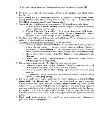 Tworzenie warstw tematycznych/tworzenie nowego projektu w systemie GIS 1. Utwórz nowy projekt jako pusty projekt - Create a new project – as a blank project lub Ctrl+N. 2. Utwórz nowy widok w oknie projektu (Untitled) – Wybierz z menu po lewej Views i kliknij przycisk New. Zmień nazwę widoku View1 na Mapa – w oknie projektu Ctrl+R lub Menu rozwijane Project/Rename View1. 3. Wprowadzenie podkładu mapowego do systemu GIS. Przejdź do widoku Mapa: a. Wybierz polecenie File/Extensions, zaznacz wszystkie dostępne rozszerzenia plików + kliknij na przycisk OK. b. Wybierz View/Add Theme (Ctrl + T), w oknie dialogowym Add theme – wybierz typ źródła danych (Data Source Types) – Image data source. Następnie wskaż ścieżkę dostępu do pliku podkład.jpg + OK. 4. W oknie mapa uaktywnij dodaną warstwę Podkład.jpg. W polu roboczym powinno pojawić się zdjęcie podkładu mapowego. 5. Tworzenie nowych warstw tematycznych. W widoku Mapa: a. Wybierz polecenie View/New theme. W kolejnym oknie dialogowym do wyboru jest typ warstwy – możemy wybrać warstwy punktowe, liniowe i poligonowe. Wybierz Polygon + OK. Następnie wskaż miejsce, gdzie ma zostać zapisana utworzona warstwa i zapisz warstwę pod nazwą Budynki.shp. b. Utwórz nową warstwę Ulice – View/New theme, wybierz Line, zapisz jako Ulice.shp . c. Utwórz nową warstwę Zagospodarowanie – View/New theme, wybierz Polygon, zapisz jako Polygon.shp . 6. Edycja warstw tematycznych. Aby edytować nowe warstwy należy: a. Uaktywnić warstwę, która ma być edytowana (kliknąć w nazwę warstwy – tak aby uwypukliła się ona na liście warstw w widoku Mapa). b. Wybierz polecenie Theme/Start editing. Spowoduje ono otwarcie edycji warstwy. c. Po wykonaniu edycji (rysowania na warstwie) należy zamknąć edycję warstwy: Theme/Stop editing. 7. Edycja tabeli atrybutów warstw tematycznych . Należy skorzystać z przycisku Open theme table (lub Theme/table). Otworzy się okno tabeli atrybutów wskazanej warstwy tematycznej. Tabela zawiera 2 kolumny: Shape oraz ID. Aby dodać kolumnę należy wybrać polecenie Edit/Add field. Następnie w kolejnym oknie nadajemy nazwę pola, typ danych, które będą zawarte w polu oraz szerokość pola. Typ danych do wyboru pole liczbowe/ciąg znaków/Wartości logiczne (true/false)/data. Aby wprowadzić dane do pola tabeli – korzystamy z polecenia Edit – symbol strzałki nad polem. 8. Zapisywanie projektu mapy. Aby zapisać cały projekt mapy należy skorzystać z polecenia: File/Save Project as...