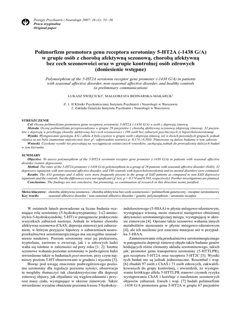Postêpy Psychiatrii i Neurologii 2007; 16 (1): 5356 Praca oryginalna Original paper Polimorfizm promotora genu receptora serotoniny 5-HT2A (-1438 G/A) w grupie osób z chorob¹ afektywn¹ sezonow¹, chorob¹ afektywn¹ bez cech sezonowoci oraz w grupie kontrolnej osób zdrowych (doniesienie wstêpne) Polymorphism of the 5-HT2A serotonin receptor gene promoter (-1438 G/A) in patients with seasonal affective disorder, non-seasonal affective disorder, and healthy controls (a preliminary communication) £UKASZ WIÊCICKI1, MA£GORZATA BEDNARSKA-MAKARUK2 Z: 1. II Kliniki Psychiatrycznej Instytutu Psychiatrii i Neurologii w Warszawie 2. Zak³adu Genetyki Instytutu Psychiatrii i Neurologii w Warszawie STRESZCZENIE Cel. Ocena polimorfizmu promotora genu receptora serotoniny 5-HT2A (-1438 G/A) u osób z depresj¹ zimow¹. Metoda. Ocenê polimorfizmu przeprowadzono w grupie 29 pacjentów z chorob¹ afektywn¹ sezonow¹ (depresj¹ zimow¹), 32 pacjentów z depresj¹ w przebiegu choroby afektywnej bez cech sezonowoci i 198 osób bez zaburzeñ psychicznych (z hipercholesterolemi¹). Wyniki. Wystêpowanie genotypu A/G i allela A by³o czêstsze w grupie osób z depresj¹ zimow¹, ni¿ w dwóch pozosta³ych grupach, jednak ró¿nica ta nie by³a znamienna statystycznie (test P2; odpowiednie wartoci p: 0,174 i 0,503). Planowane s¹ dalsze badania w tym zakresie. Wnioski. Uzyskane wyniki nie pozwalaj¹ na wyci¹gniêcia ostatecznych wniosków, zachêcaj¹ jednak do prowadzenia dalszych badañ w tym kierunku. SUMMARY Objective. To assess polymorphism of the 5-HT2A serotonin receptor gene promoter (-1438 G/A) in patients with seasonal affective disorder (winter depression). Method. The rates of the 5-HT2A promoter (-1438 G/A) polymorphism in a group of 29 patients with seasonal affective disorder (SAD), 32 depressive inpatients with non-seasonal affective disorder, and 198 controls with hypercholesterolemia and no mental disorders were estimated. Results. The A/G genotype and A allele were more frequently present in the group of SAD patients as compared to non-SAD depressive inpatients and the controls, but the differences were not significant (P2 test; p = 0.174 and 0.503, respectively). Further investigations are planned. Conclusions. The findings are not conclusive, but promising, so continuation of research in this direction seems justified. S³owa kluczowe: choroba afektywna sezonowa / choroba afektywna bez cech sezonowoci / polimorfizm genetyczny / receptor serotoninowy Key words: seasonal affective disorder / non-seasonal affective disorder / genetic polymorphism / serotonin receptor W ostatnich latach prowadzone s¹ liczne badania oceniaj¹ce rolê serotoniny (5-hydroksytryptaminy; 3-(2-aminoetylo)-5-hydroksyindolu; 5-HT) w patogenezie praktycznie wszystkich zaburzeñ nastroju. Jednak to w³anie choroba afektywna sezonowa (ChAS; depresja zimowa) jest zaburzeniem, w którym przyjêcie hipotezy o zaburzeniach neuroprzekanictwa serotoninergicznego ma szczególne uzasadnienie naukowe. Poziom serotoniny oraz jej prekursora, tryptofanu, zarówno u zwierz¹t, jak i u zdrowych ludzi waha siê istotnie w zale¿noci od pory roku [1, 2]. Istotne sezonowe wahania poziomu serotoniny w podwzgórzu ludzi stwierdzono tak¿e w badaniach post-mortem, przy czym najni¿szy poziom 5-HT obserwowano w grudniu i styczniu [3]. Bior¹c pod uwagê znaczenie podwzgórzowego poziomu serotoniny dla regulacji poziomu sytoci, obserwacja ta mog³aby t³umaczyæ tak charakterystyczne dla depresji zimowej objawy, jak objadanie siê wêglowodanami i przyrost masy cia³a, wystêpuj¹ce w okresie zimowym. Tak¿e stwierdzone wyrane obni¿enie poziomu kwasu 5-hydroksy- indolooctowego (5-HIAA) w p³ynie mózgowo-rdzeniowym, wystêpuj¹ce wiosn¹, mo¿e stanowiæ nastêpstwo obni¿onej aktywnoci serotoninergicznej mózgu, wystêpuj¹cej w okresie zimowym [4]. Opisano tak¿e sezonowe wahania innych metabolitów monoamin w p³ynie mózgowo-rdzeniowym [4], ale ich nasilenie jest znacznie mniejsze ni¿ w przypadku 5-HIAA. Zainteresowanie rol¹ przekanictwa serotoninergicznego w patogenezie depresji zimowej objê³o tak¿e badanie genów koduj¹cych ró¿ne elementy uk³adu serotoninowego, takich jak: promotor genu transportera serotoniny (5-HTTLPR), gen receptora 5-HT2A oraz receptora 5-HT2C [5]. Wyniki tych badañ nie s¹ jednak jednoznaczne. Rosenthal i wsp. [6] zbadali 97 osób z ChAS i 71 osób zdrowych, zakwalifikowanych do grupy kontrolnej, i stwierdzili, ¿e wystêpowanie krótkiego allela 5-HTTLPR stanowi czynnik ryzyka wystêpowania ChAS i koreluje z nasileniem sezonowych objawów zaburzeñ. Enoch i wsp. [7] badali polimorfizm -1438 G/A promotora genu 5-HT2A w grupie 67 pacjentów 54 z ChAS i 69 zdrowych ochotników. Autorzy nie stwierdzili zwi¹zku miêdzy polimorfizmem -1438 G/A a nasileniem sezonowoci. Stwierdzili natomiast istotnie czêstsze wystêpowanie wariantu -1438 A w grupie osób z ChAS w porównaniu z grup¹ osób zdrowych (p<0,01). Zdaniem autorów uzyskany przez nich wynik oznacza, ¿e wystêpowanie wariantu promotora genu 5-HT2A wi¹¿e siê co prawda z wystêpowaniem ChAS, choæ nie z wystêpowaniem nasilenia sezonowych zaburzeñ nastroju. Polimorfizm -1438 G/A zlokalizowany jest w promotorze genu receptora 5-HT2A, badania Spurlock i wsp. [8] nie wykaza³y jednak wp³ywu tego polimorfizmu na poziom transkrypcji tego genu. Arias i wsp. [9] badali polimorfizm 102-T/C genu receptora 5-HT2A i stwierdzili, ¿e czêstoæ wystêpowania allela 102-C u osób z ChAS jest istotnie czêstsza ni¿ w grupie nChAS (p = 0,004). Wyników tych nie potwierdzi³y jednak inne prace. Johansson i wsp. [10] porównywali polimorfizm promotora genu transportera serotoniny 5-HTTLPR w grupie 82 pacjentów z ChAS i 82 osób zdrowych i nie stwierdzili zwi¹zku miêdzy polimorfizmem tego genu a czêstoci¹ wystêpowania ChAS lub nasileniem sezonowych zmian nastroju. Wyniki innego badania przeprowadzonego przez Johanssona i wsp. [11], z udzia³em 316