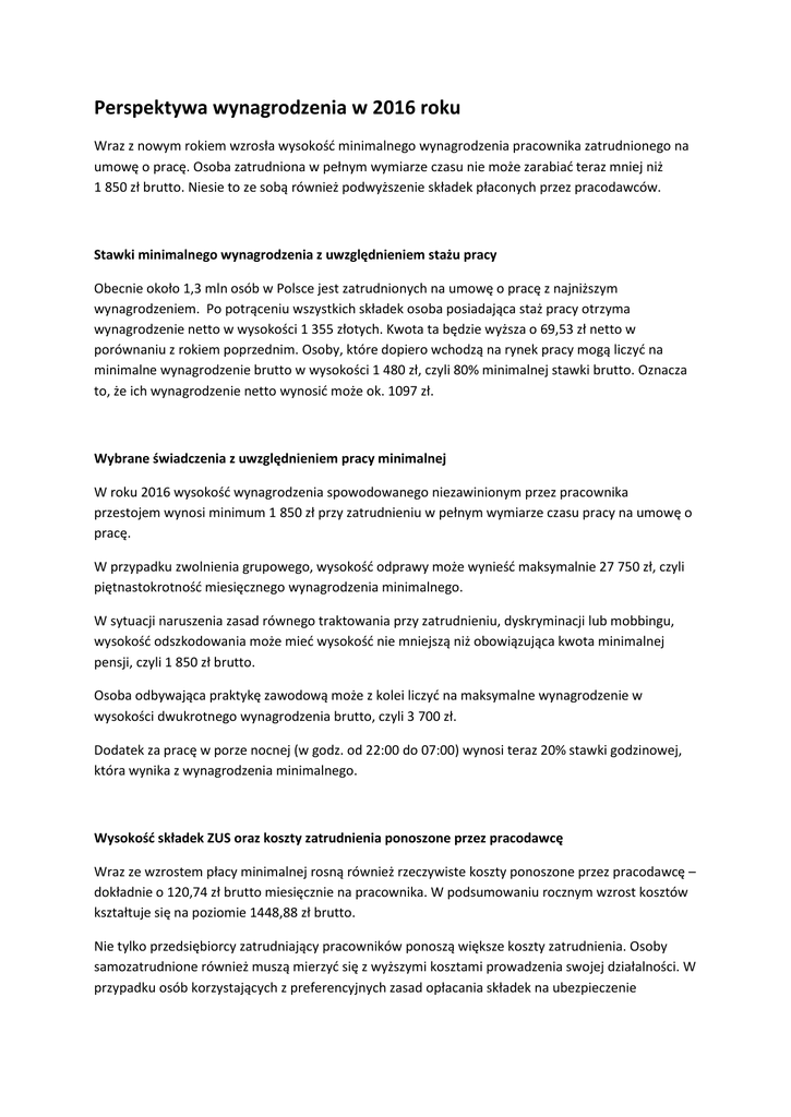 Perspektywa wynagrodzenia w 2016 roku Wraz z nowym rokiem wzrosła wysokość minimalnego wynagrodzenia pracownika zatrudnionego na umowę o pracę. Osoba zatrudniona w pełnym wymiarze czasu nie może zarabiać teraz mniej niż 1 850 zł brutto. Niesie to ze sobą również podwyższenie składek płaconych przez pracodawców. Stawki minimalnego wynagrodzenia z uwzględnieniem stażu pracy Obecnie około 1,3 mln osób w Polsce jest zatrudnionych na umowę o pracę z najniższym wynagrodzeniem. Po potrąceniu wszystkich składek osoba posiadająca staż pracy otrzyma wynagrodzenie netto w wysokości 1 355 złotych. Kwota ta będzie wyższa o 69,53 zł netto w porównaniu z rokiem poprzednim. Osoby, które dopiero wchodzą na rynek pracy mogą liczyć na minimalne wynagrodzenie brutto w wysokości 1 480 zł, czyli 80% minimalnej stawki brutto. Oznacza to, że ich wynagrodzenie netto wynosić może ok. 1097 zł. Wybrane świadczenia z uwzględnieniem pracy minimalnej W roku 2016 wysokość wynagrodzenia spowodowanego niezawinionym przez pracownika przestojem wynosi minimum 1 850 zł przy zatrudnieniu w pełnym wymiarze czasu pracy na umowę o pracę. W przypadku zwolnienia grupowego, wysokość odprawy może wynieść maksymalnie 27 750 zł, czyli piętnastokrotność miesięcznego wynagrodzenia minimalnego. W sytuacji naruszenia zasad równego traktowania przy zatrudnieniu, dyskryminacji lub mobbingu, wysokość odszkodowania może mieć wysokość nie mniejszą niż obowiązująca kwota minimalnej pensji, czyli 1 850 zł brutto. Osoba odbywająca praktykę zawodową może z kolei liczyć na maksymalne wynagrodzenie w wysokości dwukrotnego wynagrodzenia brutto, czyli 3 700 zł. Dodatek za pracę w porze nocnej (w godz. od 22:00 do 07:00) wynosi teraz 20% stawki godzinowej, która wynika z wynagrodzenia minimalnego. Wysokość składek ZUS oraz koszty zatrudnienia ponoszone przez pracodawcę Wraz ze wzrostem płacy minimalnej rosną również rzeczywiste koszty ponoszone przez pracodawcę – dokładnie o 120,74 zł brutto miesięcznie na pracownika. W podsumowaniu rocznym wzrost kosztów kształtuje się na poziomie 1448,88 zł brutto. Nie tylko przedsiębiorcy zatrudniający pracowników ponoszą większe koszty zatrudnienia. Osoby samozatrudnione również muszą mierzyć się z wyższymi kosztami prowadzenia swojej działalności. W przypadku osób korzystających z preferencyjnych zasad opłacania składek na ubezpieczenie społeczne, podstawą ich składek jest 30% minimalnego wynagrodzenia o pracę, czyli 555 zł. W tej sytuacji wysokość płaconych przez nie składek przedstawia się następująco: Składka emerytalna – 108, 34 zł (102,48 zł w roku 2015) Składka rentowa – 44,40 zł (42,00 zł w roku 2015) Składka chorobowa – 13,60 zł (12,86 zł w roku 2015) Składka zdrowotna – 279,41 zł (179, 41 w roku 2015) Składka wypadkowa – 9,99 zł (9,45 zł w roku 2015) Podsumowując, miesięczne składki wynoszą teraz 455,74 zł. Są wyższe o 9,54 zł w porównaniu do roku ubiegłego. Minimalne wynagrodzenie o pracę w Polsce należy do najniższych w Europie. Nie można tego samego powiedzieć jednak o kosztach pracy, które w porównaniu do stawek obowiązujących w innych krajach należą do jednych z najwyższych. Trend ten utrzymuje się już kolejny rok i nie ma pozytywnych prognoz w tym obszarze. Źródło: pl.jobsora.com