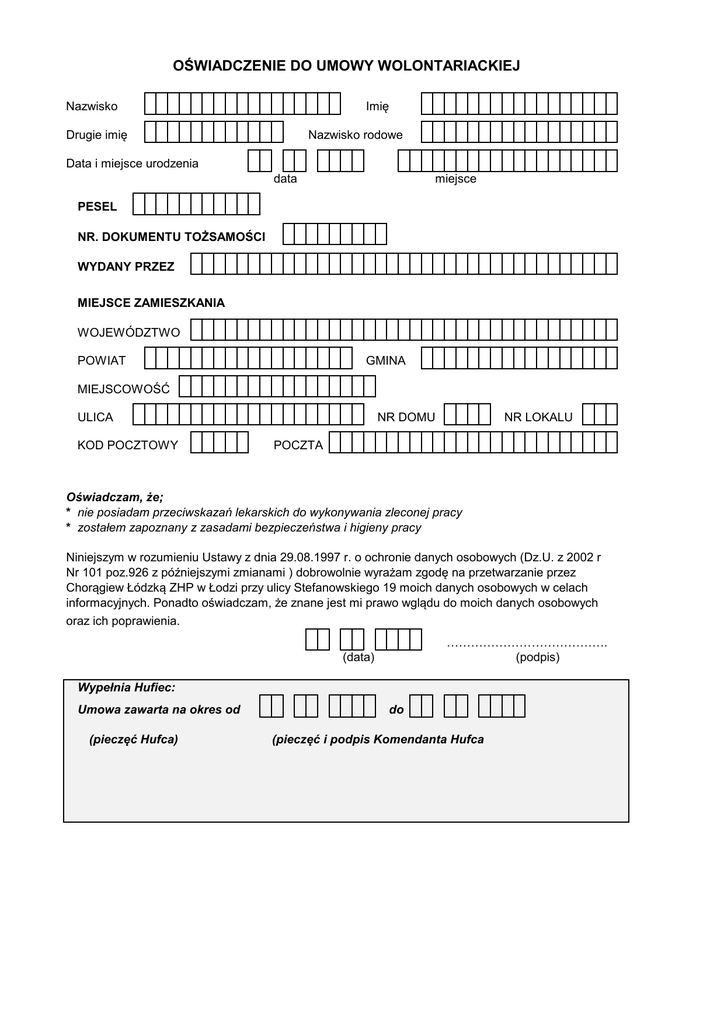 OŚWIADCZENIE DO UMOWY WOLONTARIACKIEJ Nazwisko Imię Drugie imię Nazwisko rodowe Data i miejsce urodzenia data miejsce PESEL NR. DOKUMENTU TOŻSAMOŚCI WYDANY PRZEZ MIEJSCE ZAMIESZKANIA WOJEWÓDZTWO POWIAT GMINA MIEJSCOWOŚĆ ULICA KOD POCZTOWY NR DOMU NR LOKALU POCZTA Oświadczam, że; * nie posiadam przeciwskazań lekarskich do wykonywania zleconej pracy * zostałem zapoznany z zasadami bezpieczeństwa i higieny pracy Niniejszym w rozumieniu Ustawy z dnia 29.08.1997 r. o ochronie danych osobowych (Dz.U. z 2002 r Nr 101 poz.926 z późniejszymi zmianami ) dobrowolnie wyrażam zgodę na przetwarzanie przez Chorągiew Łódzką ZHP w Łodzi przy ulicy Stefanowskiego 19 moich danych osobowych w celach informacyjnych. Ponadto oświadczam, że znane jest mi prawo wglądu do moich danych osobowych oraz ich poprawienia. …………………………………. (podpis) (data) Wypełnia Hufiec: Umowa zawarta na okres od (pieczęć Hufca) do (pieczęć i podpis Komendanta Hufca