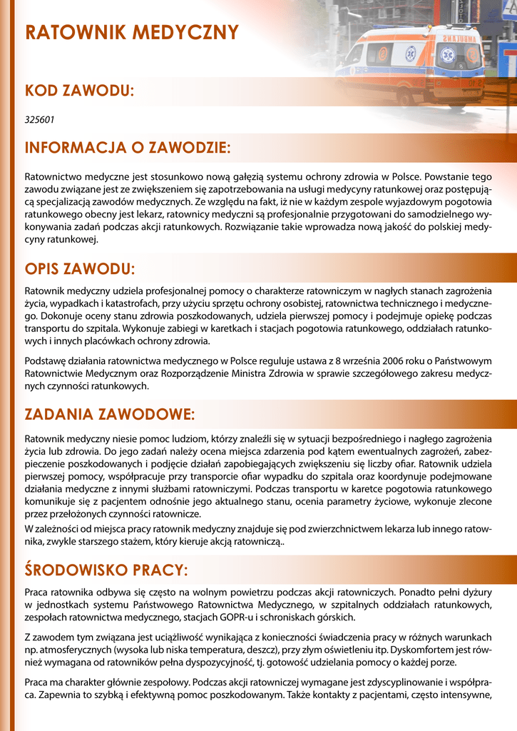 RATOWNIK MEDYCZNY KOD ZAWODU: 325601 INFORMACJA O ZAWODZIE: Ratownictwo medyczne jest stosunkowo nową gałęzią systemu ochrony zdrowia w Polsce. Powstanie tego zawodu związane jest ze zwiększeniem się zapotrzebowania na usługi medycyny ratunkowej oraz postępującą specjalizacją zawodów medycznych. Ze względu na fakt, iż nie w każdym zespole wyjazdowym pogotowia ratunkowego obecny jest lekarz, ratownicy medyczni są profesjonalnie przygotowani do samodzielnego wykonywania zadań podczas akcji ratunkowych. Rozwiązanie takie wprowadza nową jakość do polskiej medycyny ratunkowej. OPIS ZAWODU: Ratownik medyczny udziela profesjonalnej pomocy o charakterze ratowniczym w nagłych stanach zagrożenia życia, wypadkach i katastrofach, przy użyciu sprzętu ochrony osobistej, ratownictwa technicznego i medycznego. Dokonuje oceny stanu zdrowia poszkodowanych, udziela pierwszej pomocy i podejmuje opiekę podczas transportu do szpitala. Wykonuje zabiegi w karetkach i stacjach pogotowia ratunkowego, oddziałach ratunkowych i innych placówkach ochrony zdrowia. Podstawę działania ratownictwa medycznego w Polsce reguluje ustawa z 8 września 2006 roku o Państwowym Ratownictwie Medycznym oraz Rozporządzenie Ministra Zdrowia w sprawie szczegółowego zakresu medycznych czynności ratunkowych. ZADANIA ZAWODOWE: Ratownik medyczny niesie pomoc ludziom, którzy znaleźli się w sytuacji bezpośredniego i nagłego zagrożenia życia lub zdrowia. Do jego zadań należy ocena miejsca zdarzenia pod kątem ewentualnych zagrożeń, zabezpieczenie poszkodowanych i podjęcie działań zapobiegających zwiększeniu się liczby ofiar. Ratownik udziela pierwszej pomocy, współpracuje przy transporcie ofiar wypadku do szpitala oraz koordynuje podejmowane działania medyczne z innymi służbami ratowniczymi. Podczas transportu w karetce pogotowia ratunkowego komunikuje się z pacjentem odnośnie jego aktualnego stanu, ocenia parametry życiowe, wykonuje zlecone przez przełożonych czynności ratownicze. W zależności od miejsca pracy ratownik medyczny znajduje się pod zwierzchnictwem lekarza lub innego ratownika, zwykle starszego stażem, który kieruje akcją ratowniczą.. ŚRODOWISKO PRACY: Praca ratownika odbywa się często na wolnym powietrzu podczas akcji ratowniczych. Ponadto pełni dyżury w jednostkach systemu Państwowego Ratownictwa Medycznego, w szpitalnych oddziałach ratunkowych, zespołach ratownictwa medycznego, stacjach GOPR-u i schroniskach górskich. Z zawodem tym związana jest uciążliwość wynikająca z konieczności świadczenia pracy w różnych warunkach np. atmosferycznych (wysoka lub niska temperatura, deszcz), przy złym oświetleniu itp. Dyskomfortem jest również wymagana od ratowników pełna dyspozycyjność, tj. gotowość udzielania pomocy o każdej porze. Praca ma charakter głównie zespołowy. Podczas akcji ratowniczej wymagane jest zdyscyplinowanie i współpraca. Zapewnia to szybką i efektywną pomoc poszkodowanym. Także kontakty z pacjentami, często intensywne, są nieodzownym elementem podejmowanych działań, np. ratownicy niejednokrotnie narażeni są na ryzyko zachowań agresywnych i konfliktowych. Ratownik pracuje w tak zwanym systemie zmianowym, 12 - lub 24 - godzinnych dyżurów (liczba dyżurów powinna być ustalana przy uwzględnieniu czasu niezbędnego do odpoczynku oraz regeneracji). Praca odbywa się zarówno w dzień, jak i w nocy, również w dni ustawowo wolne od pracy. WYMAGANIA PSYCHOFIZYCZNE: Praca ratownika medycznego wymaga wielu specyficznych umiejętności. Przede wszystkim ratownik musi dobrze radzić sobie w sytuacjach niebezpiecznych, a nawet zagrażających życiu, niezbędne działania nie mogą bowiem być odkładane w czasie. Z tego względu musi posiadać umiejętność podejmowania szybkich i trafnych decyzji, zdolność panowania nad własnymi emocjami, odwagę, wytrwałość, cierpliwość i spostrzegawczość. Praca ta wymaga wysokiej sprawności i wydolności fizycznej, bardzo istotne jest również sprawne funkcjonowanie zmysłów wzroku i słuchu oraz poczucia równowagi. Ratownik medyczny często podejmuje działania wobec osób będących w szoku lub chorych, musi zatem charakteryzować się umiejętnością nawiązywania kontaktu i potrafić się dobrze komunikować. Także działanie zespołowe i współdziałanie z innymi służbami na miejscu katastrofy wymagają umiejętności słuchania i jasnego przekazywania komunikatów. W zawodzie tym istotne jest poczucie odpowiedzialności za innych, ich zdrowie i bezpieczeństwo. WARUNKI PODJĘCIA PRACY: Kształcenie na kierunku ratownictwo medyczne realizowane jest w wielu publicznych i prywatnych uczelniach (studia I i II stopnia, w systemie stacjonarnym i niestacjonarnym). Po ukończeniu studiów na kierunku/specjalności ratownictwo medyczne uzyskuje się tytuł zawodowy ratownika medycznego. Do uzyskania prawa do wykonywania zawodu niezbędne jest również odbycie sześciomiesięcznej praktyki oraz zdanie z wynikiem pozytywnym Państwowego Egzaminu z Ratownictwa Medycznego (PERM). Na terenie województwa świętokrzyskiego ratownictwo medyczne studiować można na Uniwersytecie Jana Kochanowskiego oraz w Wyższej Szkole Ekonomii, Prawa i Nauk Medycznych w Kielcach. Na Wydziale Nauk o Zdrowiu Uniwersytetu Jana Kochanowskiego działa Centrum Symulacji Medycznej, w którym dzięki wykorzystaniu zaawansowanych symulatorów do tworzenia warunków zbliżonych do realnych, studenci mogą ćwiczyć podejmowanie działań ratunkowych dokładnie tak, jak w przypadku realnej sytuacji i realnego pacjenta, ale bez narażania chorych. Następnie uczestnicy mają możliwość obejrzenia filmu nakręconego podczas symulacji i w trakcie debriefingu (omówienie poprawności przeprowadzonego procesu) samodzielnie ocenić poprawność swojego postępowania. MOŻLIWOŚCI ZATRUDNIENIA: Absolwent studiów jest przygotowany do pracy w publicznych i niepublicznych zakładach opieki zdr