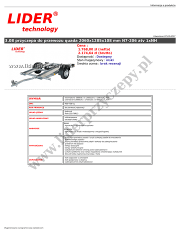Informacje o produkcie Utworzono 07-03-2017 3.08 przyczepa do przewozu quada 2060x1285x108 mm N7-206 atv 1xNH zy cz ep y. p Dostępność : Dostępny Stan magazynowy : niski Średnia ocena : brak recenzji l Cena : 1.768,00 zł (netto) 2.174,64 zł (brutto) - wewnętrzne 2060(dł.) x 1285(szer.) x 108(wys.) mm - zewnętrzne 2880(dł.) x 1750(szer.) x 660(wys.) mm DMC - 400-750 kg ROK PRODUKCJI - do pierwszej rejestracji UKŁAD JEZDNY - jedna oś - koła 155/70R13 UKŁAD HAMULCOWY - niehamowana - zaczep kulowy rp r WYMIAR PODŁOGA - wykonana ze sklejki wodoodpornej- antypoślizgowej - przyczepa posiada z przodu i z tyłu uchwyty pasów do mocowania przewożonego pojazdu - szyny posiadają przesuwne pałąki- blokady do zabezpieczenia przednich kół pojazdu - lampy pozycyjne - lampy wielofunkcyjne - zabudowane błotniki chronią przed zabrudzeniami - uchylna platforma oraz rampa najazdowa umożliwiająca rozładunek bez potrzeby wypinania przyczepy z haka w .li NADWOZIE de RAMA - konstrukcja ocynkowana ogniowo w WYPOSAŻENIE w DOPOSAŻENIE Wygenerowano w programie www.oscGold.com - koło zapasowe z uchwytem - koło podporowe z obejmą - zabezpieczenie antykradzieżowe w .li w w ep zy cz rp r de y. p l w w w .li de rp r zy cz ep y. p l Informacje o produkcie Wygenerowano w programie www.oscGold.com