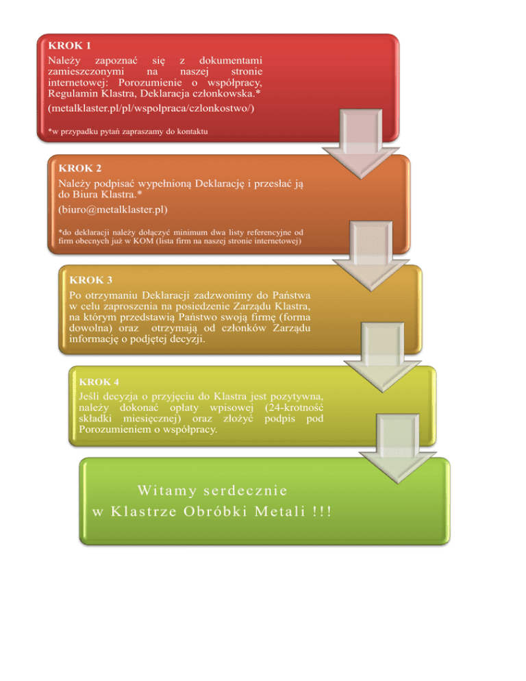 KROK 1 Należy zapoznać się z dokumentami zamieszczonymi na naszej stronie internetowej: Porozumienie o współpracy, Regulamin Klastra, Deklaracja członkowska.* (metalklaster.pl/pl/wspolpraca/czlonkostwo/) *w przypadku pytań zapraszamy do kontaktu KROK 2 Należy podpisać wypełnioną Deklarację i przesłać ją do Biura Klastra.* ([email protected]) *do deklaracji należy dołączyć minimum dwa listy referencyjne od firm obecnych już w KOM (lista firm na naszej stronie internetowej) KROK 3 Po otrzymaniu Deklaracji zadzwonimy do Państwa w celu zaproszenia na posiedzenie Zarządu Klastra, na którym przedstawią Państwo swoją firmę (forma dowolna) oraz otrzymają od członków Zarządu informację o podjętej decyzji. KROK 4 Jeśli decyzja o przyjęciu do Klastra jest pozytywna, należy dokonać opłaty wpisowej (24-krotność składki miesięcznej) oraz złożyć podpis pod Porozumieniem o współpracy. Wi t a m y s e r d e c z n i e w Klastrze Obróbki Metali !!!