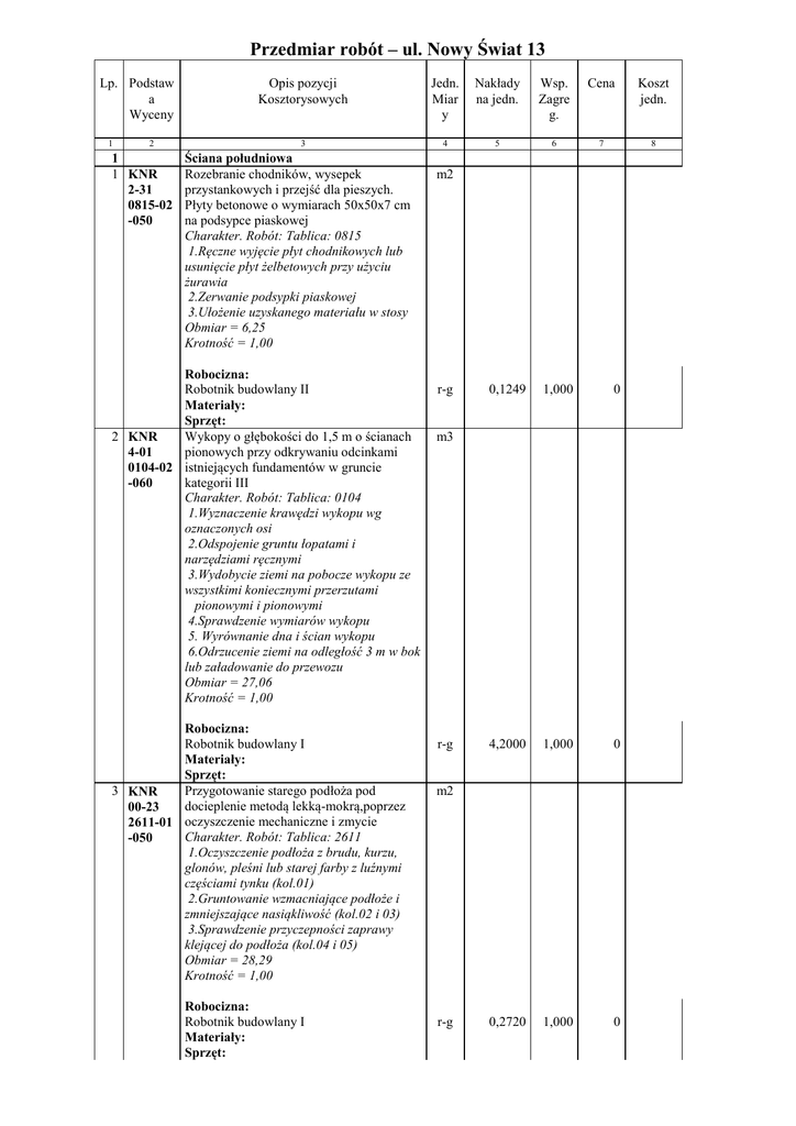 Przedmiar robót – ul. Nowy Świat 13 Lp. Podstaw a Wyceny 1 2 1 1 KNR 2-31 0815-02 -050 Opis pozycji Kosztorysowych Jedn. Miar y Nakłady na jedn. Wsp. Zagre g. Cena Koszt jedn. 3 4 5 6 7 8 Ściana południowa Rozebranie chodników, wysepek przystankowych i przejść dla pieszych. Płyty betonowe o wymiarach 50x50x7 cm na podsypce piaskowej Charakter. Robót: Tablica: 0815 1.Ręczne wyjęcie płyt chodnikowych lub usunięcie płyt żelbetowych przy użyciu żurawia 2.Zerwanie podsypki piaskowej 3.Ułożenie uzyskanego materiału w stosy Obmiar = 6,25 Krotność = 1,00 Robocizna: Robotnik budowlany II Materiały: Sprzęt: 2 KNR Wykopy o głębokości do 1,5 m o ścianach pionowych przy odkrywaniu odcinkami 4-01 0104-02 istniejących fundamentów w gruncie kategorii III -060 Charakter. Robót: Tablica: 0104 1.Wyznaczenie krawędzi wykopu wg oznaczonych osi 2.Odspojenie gruntu łopatami i narzędziami ręcznymi 3.Wydobycie ziemi na pobocze wykopu ze wszystkimi koniecznymi przerzutami pionowymi i pionowymi 4.Sprawdzenie wymiarów wykopu 5. Wyrównanie dna i ścian wykopu 6.Odrzucenie ziemi na odległość 3 m w bok lub załadowanie do przewozu Obmiar = 27,06 Krotność = 1,00 Robocizna: Robotnik budowlany I Materiały: Sprzęt: 3 KNR Przygotowanie starego podłoża pod docieplenie metodą lekką-mokrą,poprzez 00-23 2611-01 oczyszczenie mechaniczne i zmycie Charakter. Robót: Tablica: 2611 -050 1.Oczyszczenie podłoża z brudu, kurzu, glonów, pleśni lub starej farby z luźnymi częściami tynku (kol.01) 2.Gruntowanie wzmacniające podłoże i zmniejszające nasiąkliwość (kol.02 i 03) 3.Sprawdzenie przyczepności zaprawy klejącej do podłoża (kol.04 i 05) Obmiar = 28,29 Krotność = 1,00 Robocizna: Robotnik budowlany I Materiały: Sprzęt: m2 r-g 0,1249 1,000 0 4,2000 1,000 0 0,2720 1,000 0 m3 r-g m2 r-g 4 KNR Skucie nierówności betonu przy głębokości skucia do 1 cm na ścianach lub podłogach 4-01 0211-01 Charakter. Robót: Tablica: 0211 -050 1.Ręczne skucie nierówności betonu (kol.01-03) 2.Ręczne wykucie wnęk (kol.04-09) 3.Wyrównanie tylnej i bocznych ścianek wnęk (kol.04-09) 4.Ręczne wykucie gniazda na kołek (kol.10) 5.Przygotowanie i obsadze nie kołka za zaprawie (kol.10) Obmiar = 28,29 Krotność = 1,00 Robocizna: Robotnik budowlany I Materiały: Sprzęt: 5 KNR Uzupełnienie tynków zewnętrznych zwykłych kat.II /wapno gaszone/ ścian, 4-01 0725-03 loggii,balkonów,podłoże z cegły,pustaków ceram.gazo-I pianobet.w jednym miejscu do -050 5 m2 Charakter. Robót: Tablica: 0725 1.Odbicie odstających i spękanych tynków 2.Przygotowanie powierzchni podłoża do tynkowania 3.Wykonanie tynków dwuwarstwowych z zatarciem packą na ostro 4.Dokładne połączenie nowych tynków z istniejącymi Obmiar = 28,29 Krotność = 1,00 m2 r-g 0,9600 1,000 0 0,0900 0,0700 0,8100 1,000 1,000 1,000 0 0 0 0,0183 0,0038 0,0030 0,0042 1,000 1,000 1,000 1,000 0 0 0 0 0 0,0300 0,0300 1,000 1,000 0 0 m2 Robocizna: Robotnik budowlany I r-g Robotnik budowlany II r-g Tynkarz II r-g Materiały: Piasek do zapraw m3 Cement portlandzki "25" z dodatkami t Wapno gaszone (ciasto) m3 Woda m3 Materiały pomocnicze 1,50 % zł Sprzęt: Wyciąg 1-maszt.z napędem elekt m-g Betoniarka wolnospadowa 150dm3 m-g 6 KNR Przygotowanie powierzchni pionowych m2 betonowych i otynkowanych pod 00-41 0103-01 uszczelnienia w technologii Deitermann, gruntowanie ręczne EUROLANEM 3K -050 Charakter. Robót: Tablica 0103 PRZYGOTOWANIE POWIERZCHNI PIONOWYCH BETONOWYCH I OTYNKOWANYCH POD USZCZELNIENIA W TECHNOLOGII DEITERMANN Wyszczególnienie robót: 1. Oczyszczenie podłoża z kurzu, smoły i innych zanieczyszczeń. 2. Przygotowanie roztworu do gruntowania (Eurolan 3 K rozcieńczony wodą w stosunku 1:10, Eurolan TG 2 nierozcieńczony). 3. Zagruntowanie podłoża. Obmiar = 28,29 Krotność = 1,00 Robocizna: Robotnik budowlany I Materiały: Środek gruntujący EUROLAN 3K Sprzęt: Środek transportowy (1) 7 KNR Uszczelnienie masą SUPERFLEX 10 powierzchni pionowych poddanych 00-41 0107-03 działaniu wody działającej bez ciśnienia Charakter. Robót: Tablica 0107 -050 WYSOKOELASTYCZNA IZOLACJA POWIERZCHNI PIONOWYCH W TECHNOLOGII SUPERFLEX-10 Wyszczególnienie robót: 1. Przygotowanie powierzchni przez szpachlowanie drapane (kol. 01). 2. Obrobienie przebić i naroży (kol. 02-04). 3. Przygotowanie masy uszczelniającej. 4. Wykonanie uszczelnienia (kol. 02-04). 5. Wykonanie wyobleń (kol. 05). Obmiar = 28,29 Krotność = 1,00 Robocizna: Robotnik budowlany II Robotnik budowlany I Materiały: Masa uszczelniająca SUPERFLEX 10 Sprzęt: Środek transportowy (1) 8 KNR Wysokoelastyczna, natryskiwana izolacja powierzchni poziomych w technologii 00-41 0112-05 SUPERFLEX 100 S. Wkładka wzmacniająca z tkaniny technicznej -050 Charakter. Robót: Tablica 0112 WYSOKOELASTYCZNA, NATRYSKIWANA IZOLACJA POWIERZCHNI POZIOMYCH W TECHNOLOGII SUPERFLEX-100S Wyszczególnienie robót: 1. Przygotowanie powierzchni przez szpachlowanie drapane (kol. 01). 2. Obrobienie przebić i naroży (kol. 02-04). 3 Przygotowanie masy szpachlującej. 4. Wykonanie uszczelnienia (kol. 02-04). Obmiar = 28,29 Krotność = 1,00 Robocizna: Robotnik budowlany II Robotnik budowlany I Materiały: Tkanina nr 2 z włókna szklanego Sprzęt: Środek transportowy (1) r-g 0,0567 1,000 0 dm3 0,0557 1,000 0 m-g m2 0,00007 1,000 0 r-g r-g 0,1680 0,0394 1,000 1,000 0 0 dm3 3,6500 1,000 0 m-g m2 0,00347 1,000 0 r-g r-g 0,0175 0,0024 1,000 1,000 0 0 m2 1,0500 1,000 0 m-g 0,00008 1,000 0 9 KNR 00-41 0107-05 -040 Wysokoelastyczna izolacja powierzchni pionowych w technologii SUPERFLEX 10. Wykonanie wyobleń (faset) Charakter. Robót: Tablica 0107 WYSOKOELASTYCZNA IZOLACJA POWIERZCHNI PIONOWYCH W TECHNOLOGII SUPERFLEX-10 Wyszczególnienie robót: 1. Przygotowanie powierzchni przez szpachlowanie drapane (kol. 01). 2. Obrobienie przebić i naroży (kol. 02-04). 3. Przygotowanie masy uszczelniającej. 4. Wykonanie uszczelnienia (kol. 02-04). 5. Wykonanie wyobleń (kol. 05). Obmiar = 12,