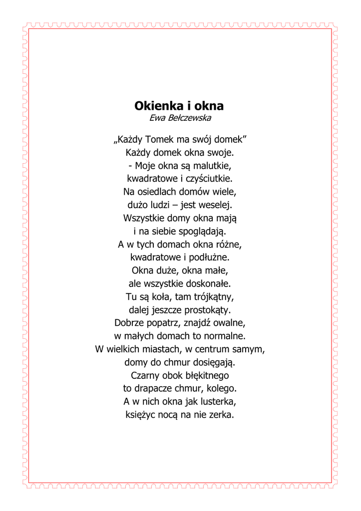 Okienka i okna Ewa Bełczewska „Każdy Tomek ma swój domek” Każdy domek okna swoje. - Moje okna są malutkie, kwadratowe i czyściutkie. Na osiedlach domów wiele, dużo ludzi – jest weselej. Wszystkie domy okna mają i na siebie spoglądają. A w tych domach okna różne, kwadratowe i podłużne. Okna duże, okna małe, ale wszystkie doskonałe. Tu są koła, tam trójkątny, dalej jeszcze prostokąty. Dobrze popatrz, znajdź owalne, w małych domach to normalne. W wielkich miastach, w centrum samym, domy do chmur dosięgają. Czarny obok błękitnego to drapacze chmur, kolego. A w nich okna jak lusterka, księżyc nocą na nie zerka.