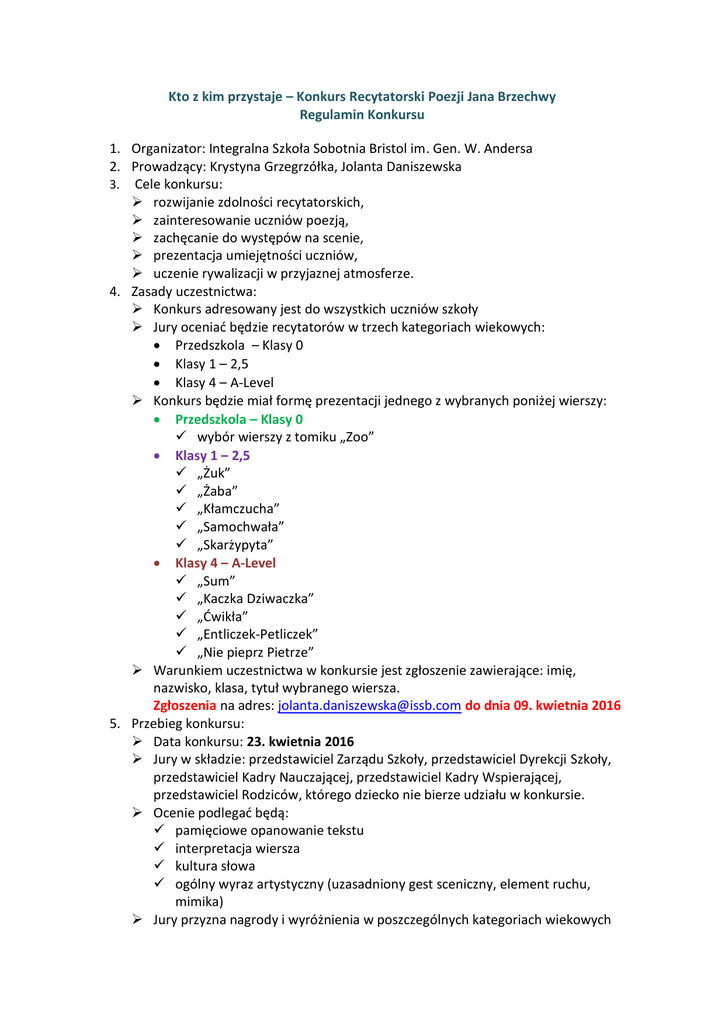 Kto z kim przystaje – Konkurs Recytatorski Poezji Jana Brzechwy Regulamin Konkursu 1. Organizator: Integralna Szkoła Sobotnia Bristol im. Gen. W. Andersa 2. Prowadzący: Krystyna Grzegrzółka, Jolanta Daniszewska 3. Cele konkursu: rozwijanie zdolności recytatorskich, zainteresowanie uczniów poezją, zachęcanie do występów na scenie, prezentacja umiejętności uczniów, uczenie rywalizacji w przyjaznej atmosferze. 4. Zasady uczestnictwa: Konkurs adresowany jest do wszystkich uczniów szkoły Jury oceniać będzie recytatorów w trzech kategoriach wiekowych: Przedszkola – Klasy 0 Klasy 1 – 2,5 Klasy 4 – A-Level Konkurs będzie miał formę prezentacji jednego z wybranych poniżej wierszy: Przedszkola – Klasy 0 wybór wierszy z tomiku „Zoo” Klasy 1 – 2,5 „Żuk” „Żaba” „Kłamczucha” „Samochwała” „Skarżypyta” Klasy 4 – A-Level „Sum” „Kaczka Dziwaczka” „Ćwikła” „Entliczek-Petliczek” „Nie pieprz Pietrze” Warunkiem uczestnictwa w konkursie jest zgłoszenie zawierające: imię, nazwisko, klasa, tytuł wybranego wiersza. Zgłoszenia na adres: [email protected] do dnia 09. kwietnia 2016 5. Przebieg konkursu: Data konkursu: 23. kwietnia 2016 Jury w składzie: przedstawiciel Zarządu Szkoły, przedstawiciel Dyrekcji Szkoły, przedstawiciel Kadry Nauczającej, przedstawiciel Kadry Wspierającej, przedstawiciel Rodziców, którego dziecko nie bierze udziału w konkursie. Ocenie podlegać będą: pamięciowe opanowanie tekstu interpretacja wiersza kultura słowa ogólny wyraz artystyczny (uzasadniony gest sceniczny, element ruchu, mimika) Jury przyzna nagrody i wyróżnienia w poszczególnych kategoriach wiekowych