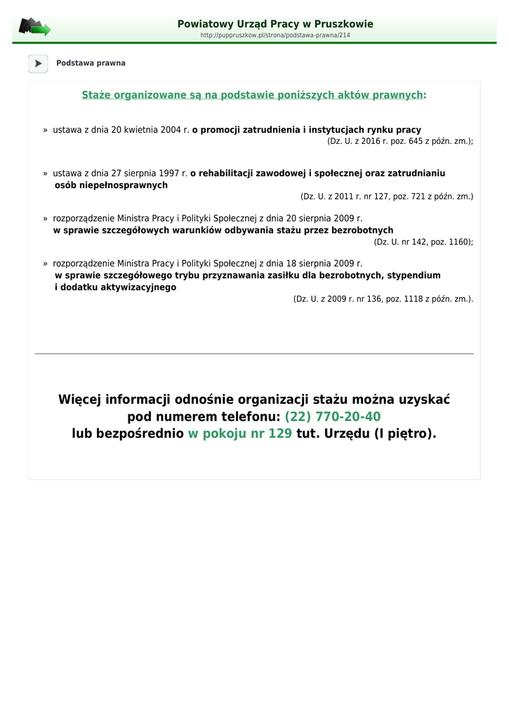 Powiatowy Urząd Pracy w Pruszkowie http://puppruszkow.pl/strona/podstawa-prawna/214 Podstawa prawna Staże organizowane są na podstawie poniższych aktów prawnych: » ustawa z dnia 20 kwietnia 2004 r. o promocji zatrudnienia i instytucjach rynku pracy (Dz. U. z 2016 r. poz. 645 z późn. zm.); » ustawa z dnia 27 sierpnia 1997 r. o rehabilitacji zawodowej i społecznej oraz zatrudnianiu osób niepełnosprawnych (Dz. U. z 2011 r. nr 127, poz. 721 z późn. zm.) » rozporządzenie Ministra Pracy i Polityki Społecznej z dnia 20 sierpnia 2009 r. w sprawie szczegółowych warunkiów odbywania stażu przez bezrobotnych (Dz. U. nr 142, poz. 1160); » rozporządzenie Ministra Pracy i Polityki Społecznej z dnia 18 sierpnia 2009 r. w sprawie szczegółowego trybu przyznawania zasiłku dla bezrobotnych, stypendium i dodatku aktywizacyjnego (Dz. U. z 2009 r. nr 136, poz. 1118 z późn. zm.). Więcej informacji odnośnie organizacji stażu można uzyskać pod numerem telefonu: (22) 770-20-40 lub bezpośrednio w pokoju nr 129 tut. Urzędu (I piętro).