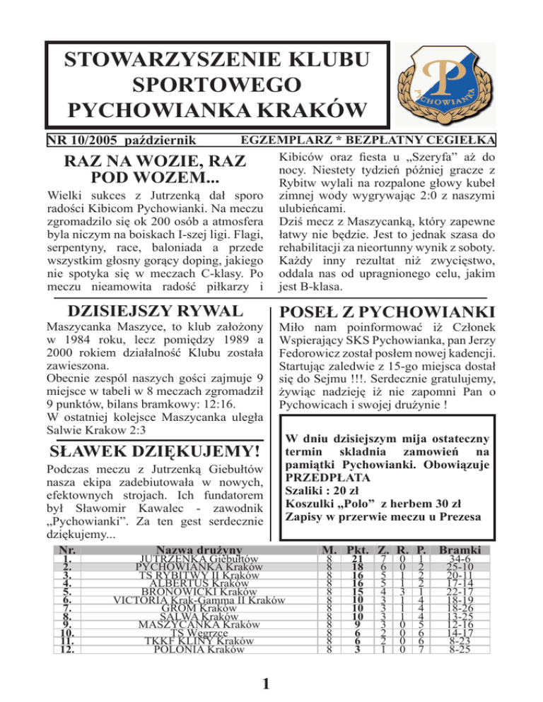 STOWARZYSZENIE KLUBU SPORTOWEGO PYCHOWIANKA KRAKÓW NR 10/2005 październik EGZEMPLARZ * BEZPŁATNY CEGIEŁKA Kibiców oraz fiesta u „Szeryfa” aż do RAZ NA WOZIE, RAZ nocy. Niestety tydzień później gracze z POD WOZEM... Rybitw wylali na rozpalone głowy kubeł Wielki sukces z Jutrzenką dał sporo zimnej wody wygrywając 2:0 z naszymi radości Kibicom Pychowianki. Na meczu ulubieńcami. zgromadzilo się ok 200 osób a atmosfera Dziś mecz z Maszycanką, który zapewne byla niczym na boiskach I-szej ligi. Flagi, łatwy nie będzie. Jest to jednak szasa do serpentyny, race, baloniada a przede rehabilitacji za nieortunny wynik z soboty. wszystkim głosny gorący doping, jakiego Każdy inny rezultat niż zwycięstwo, nie spotyka się w meczach C-klasy. Po oddala nas od upragnionego celu, jakim meczu nieamowita radość piłkarzy i jest B-klasa. DZISIEJSZY RYWAL Maszycanka Maszyce, to klub założony w 1984 roku, lecz pomiędzy 1989 a 2000 rokiem działalność Klubu została zawieszona. Obecnie zespól naszych gości zajmuje 9 miejsce w tabeli w 8 meczach zgromadził 9 punktów, bilans bramkowy: 12:16. W ostatniej kolejsce Maszycanka uległa Salwie Krakow 2:3 SŁAWEK DZIĘKUJEMY! Podczas meczu z Jutrzenką Giebułtów nasza ekipa zadebiutowała w nowych, efektownych strojach. Ich fundatorem był Sławomir Kawalec - zawodnik „Pychowianki”. Za ten gest serdecznie dziękujemy... Nr. Nazwa drużyny 1. 2. 3. 4. 5. 6. 7. 8. 9. 10. 11. 12. POSEŁ Z PYCHOWIANKI Miło nam poinformować iż Członek Wspierający SKS Pychowianka, pan Jerzy Fedorowicz został posłem nowej kadencji. Startując zaledwie z 15-go miejsca dostał się do Sejmu !!!. Serdecznie gratulujemy, żywiąc nadzieję iż nie zapomni Pan o Pychowicach i swojej drużynie ! W dniu dzisiejszym mija ostateczny termin skladnia zamowień na pamiątki Pychowianki. Obowiązuje PRZEDPŁATA Szaliki : 20 zł Koszulki „Polo” z herbem 30 zł Zapisy w przerwie meczu u Prezesa JUTRZENKA Giebułtów PYCHOWIANKA Kraków TS RYBITWY II Kraków ALBERTUS Kraków BRONOWICKI Kraków VICTORIA Krak-Gamma II Kraków GROM Kraków SALWA Kraków MASZYCANKA Kraków TS Węgrzce TKKF KLINY Kraków POLONIA Kraków 1 M. Pkt. Z. R. P. Bramki 8 8 8 8 8 8 8 8 8 8 8 8 21 18 16 16 15 10 10 10 9 6 6 3 7 6 5 5 4 3 3 3 3 2 2 1 0 0 1 1 3 1 1 1 0 0 0 0 1 2 2 2 1 4 4 4 5 6 6 7 34-6 25-10 20-11 17-14 22-17 18-19 18-26 13-25 12-16 14-17 8-23 8-25 CZŁONKOWIE WSPIERAJĄCY Klubu. Pieniądze przeznaczone są na bieżącą działalność Klubu, również pozwalają uzyskać środki niezbędne, by starac się o dowinansowanie pracy z młodzieżą od Urzędu Miasta Krakowa. Każda złotówka się liczy, tym bardziej namawiamy do wstąpienia w nasze grono. Informacje w przerwie i po meczu u prezesa. BRAK ZAWODOWSTWA, CZY CHĘCI? Na nasze nieszczęście gdzieś się jeszcze zaplątała jakaś rybitwa mała i dobitka. To jednak nie mogło nas zaskoczyć, a rzut rożny to dla nas pestka. 8 minuta sprzyjała gospodarzom. Los podarował im rzut wolny przy linii pola karnego na wysokości 8 metra, jednak Jarek miał dopasowane do swojego wzrostu bramki. W 10 minucie po faulu na „Zegarze”, piłkę w siatce dwukrotnie próbowali umieścić Piotrek Mrozek i Sławek Kawalec, lecz w polu karnym napotykali na blok. Zaczęliśmy się coraz bardziej denerwować, co zaowocowało w 13 minucie żółtą kartką dla Wojtka Borkowskiego za zagranie ręką! – Warto przypomnieć, że jest to 3 żółta kartka tego zawodnika, łobuz jeden! No i stało się… w 21 minucie Koks traci piłkę, zawodnik gospodarzy odgrywa do swojego partnera na środku, piłka odbija się od słupka bramki i GOL – Jarek nie miał żadnych szans. Po tej stracie trochę się wkurzyły nasze chłopaki. W 25 minucie po niewykorzystanym przez rywala błędzie „Zegara”, nasi wyprowadzają kontrę, Kawalec dośrodkowuje…… piłka znów w rękach bramkarza. W 30 minucie przeciwnik pochwalił się łaciną, dzięki czemu Dawid Łyś wykonuje rzut wolny pośredni. Łysiu ma jednak kopyto i piłka poleciała ponad bramką. 31 minuta budzi w naszych sercach nadzieję. Po faulu na Łukaszu Kostrzu, dośrodkowuje „Koks”, głową uderza Jacek Zegarmistrz, jednak Nadal poszukujemy chętnych do naszego grona. Jest to grupa ludzi, która zdeklaruje comiesięczne, dobrowolne wpłaty na rzecz SKS Pychowianka Miesięczna składka wynosi 10 zł. Czlonkowie wspierający mają prawo głosu doradczego. Jest to rownież funkcja honorowa - każdy z nich jest dobroczyńcą Rybitwy II Kraków – Pychowianka Kraków 2:0 PYCHOWIANKA: Wojnar - Borkowski, Szczypczyk, Zegarmistrz, Sukta Ł.Górecki (71 Poniedziałek) Mrozek, Łyś, Kawalec - Wojas, Ł Kostrz (55 M Kostrz) ŻÓŁTE KARTKI: brak WIDZÓW: 50 (w tym ok 30 z Pychowic) Od pierwszej minuty na boisku można było zaobserwować nerwowość zawodników, czego oznaką był faul w środku boiska na „Zegarze”. Nawet Jarkowi puszczały nerwy, który powinien opierając się o bramkę szpanować swoją nową koszulką, a nie krzyczeć: „Panie sędzio K…….”. 3 minuta zaskoczyła nas strzałem zawodnika gospodarzy z 20 metrów, jednak Jarek niczym dzielny rycerz łapiący swoją panią wyciągnął ręce i piłka nie mogła mu się oprzeć. Mijała minuta za minutą…a goście nie odpuszczali! Nasz Trener Wacław Jasieniak nerwowo żując gumę krzątał się wzdłuż linii bocznej boiska. W 5 minucie zaczęliśmy faulować ( 18 metr), dzięki czemu rywale dostali szanse zdobycia bramki z rzutu wolnego. Zawodnik zdecydował się na strzał, który z trudem obronił nasz dzielny rycerz Jaro!!! Jednak to nie koniec akcji gospodarzy. 2 bramkarz łapie piłkę. 32 minuta zapisuje piękną akcję Łukasza Kostrza, który na 35 metrze przyjmuje górną piłkę, obraca się z nią i jak za każdym razem piłka ląduje w rękach bramkarza. 33 minuta jest jedną z wielu, w której przeciwnik przewraca się na sznurówce! W 42 minucie wybijając piłkę z pola karnego „Ze