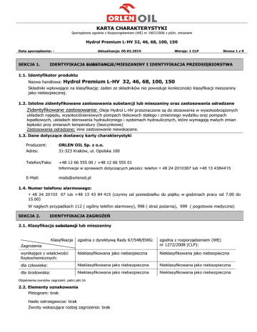 KARTA CHARAKTERYSTYKI Sporządzona zgodnie z Rozporządzeniem (WE) nr 1907/2006 z późn. zmianami Hydrol Premium L-HV 32, 46, 68, 100, 150 Data sporządzenia: - SEKCJA 1. Aktualizacja: 05.02.2015 Wersja: 1 CLP Strona 1 z 9 IDENTYFIKACJA SUBSTANCJI/MIESZANINY I IDENTYFIKACJA PRZEDSIĘBIORSTWA 1.1. Identyfikator produktu Nazwa handlowa: Hydrol Premium L-HV 32, 46, 68, 100, 150 Składniki wpływające na klasyfikację: żaden ze składników nie powoduje konieczności klasyfikacji mieszaniny jako niebezpiecznej. 1.2. Istotne zidentyfikowane zastosowania substancji lub mieszaniny oraz zastosowania odradzane Zidentyfikowane zastosowania: Oleje Hydrol L-HV przeznaczone są do stosowania w wysokoobciążonych układach napędu, wysokociśnieniowych pompach tłokowych stałego i zmiennego wydatku oraz pompach łopatkowych, układach sterowania hydraulicznego i systemach hydraulicznych, które wymagają małych zmian lepkości przy zmianach temperatury (bezcynkowe) Zastosowania odradzane: inne zastosowanie niewskazane. 1.3. Dane dotyczące dostawcy karty charakterystyki Producent: ORLEN OIL Sp. z o.o. Adres: 31-323 Kraków, ul. Opolska 100 Telefon/Faks: +48 12 66 555 00 / +48 12 66 555 01 Informacje w sprawach dotyczących jakości: telefon + 48 24 2010367 lub +48 13 4384415 E-Mail: [email protected] 1.4. Numer telefonu alarmowego: + 48 24 20103 67 lub +48 13 43 84 415 (czynny od poniedziałku do piątku w godzinach pracy od 7.00 do 15.00) W nagłych przypadkach 112 ( ogólny telefon alarmowy), 998 ( straż pożarna), 999 ( pogotowie medyczne) SEKCJA 2. IDENTYFIKACJA ZAGROŻEŃ 2.1. Klasyfikacja substancji lub mieszaniny Klasyfikacja zgodna z dyrektywą Rady 67/548/EWG: zgodna z rozporządzeniem (WE) nr 1272/2008 (CLP): wynikające z właściwości fizykochemicznych: Nieklasyfikowana jako niebezpieczna Nieklasyfikowana jako niebezpieczna dla człowieka: Nieklasyfikowana jako niebezpieczna Nieklasyfikowana jako niebezpieczna dla środowiska: Nieklasyfikowana jako niebezpieczna Nieklasyfikowana jako niebezpieczna Zagrożenia Objaśnienia zwrotów zagrożeń: patrz pkt.16 2.2. Elementy oznakowania Piktogram: brak Hasło ostrzegawcze: brak Zwroty wskazujące rodzaj zagrożenia: brak KARTA CHARAKTERYSTYKI Sporządzona zgodnie z Rozporządzeniem (WE) nr 1907/2006 z późn. zmianami Hydrol Premium L-HV 32, 46, 68, 100, 150 Data sporządzenia: - Aktualizacja: 05.02.2015 Wersja: 1 CLP Strona 2 z 9 Zwroty wskazujące środki ostrożności: brak 2.3. Inne zagrożenia Produkt nie spełnia kryteriów PBT lub vPvB zgodnie z załącznikiem XIII Rozporządzenia REACH. Produkt palny o wysokiej temperaturze zapłonu. SEKCJA 3. SKŁAD/INFORMACJA O SKŁADNIKACH 3.1. Substancje – nie dotyczy 3.2. Mieszaniny: mieszanina mineralnych olejów bazowych i dodatków uszlachetniających Niebezpieczne składniki, zakresy ich stężeń w mieszaninie: Nazwa substancji/ Nr rejestracji REACH Destylat naftowy Aryloamina Nr CAS / Nr WE % wag. Nr indeksowy 68477-31-6 <0,26 - 90-30-2/ <0,08 - 201-983-0 Klasyfikacja wg 67/548/EWG Klasyfikacja wg 1272/2008 (CLP) Xn;R65 R66 N; R51/53 Xn R22, R43 N; R50/53 Asp.Tox.1, H304 Aquatic Chronic 2, H411 Acute Tox.4, H302 Skin Sens.1; H317 Aquatic Acute 1, H400 Aquatic Chronic 1, H410 Opis zwrotów R,H oraz pełne brzmienie klasyfikacji podano w Sekcji 16. Stosowane oleje bazowe nie są klasyfikowane jako rakotwórcze. Zawartość ekstraktu DMSO (wg IP 346) < 3%. Na podstawie lepkości produkt nie stwarza zagrożenia spowodowanego aspiracją. SEKCJA 4. ŚRODKI PIERWSZEJ POMOCY 4.1. Opis środków pierwszej pomocy Wdychanie: Poszkodowanego usunąć (wyprowadzić/wynieść) z miejsca narażenia na świeże powietrze; zapewnić spokój i ciepło. Nieprzytomnego ułożyć w pozycji bocznej ustalonej, rozluźnić uciskające części ubrania; kontrolować i utrzymywać drożność dróg oddechowych. W przypadku zaburzeń w oddychaniu podawać tlen, w przypadku braku oddechu stosować sztuczne oddychanie. W przypadku utraty przytomności, zaburzeń oddychania lub utrzymującego się złego samopoczucia natychmiast zapewnić pomoc lekarską. Kontakt ze skórą: Natychmiast zdjąć zanieczyszczoną/nasiąkniętą odzież i buty. Zanieczyszczoną skórę umyć dokładnie wodą z mydłem lub łagodnym detergentem, a następnie spłukać wodą. W przypadku wystąpienia i utrzymywania się objawów podrażnienia skonsultować się z lekarzem. UWAGA: Zanieczyszczoną/nasiąkniętą odzież usunąć w bezpieczne miejsce z dala od źródeł ciepła i źródeł zapłonu. Kontakt z oczami: Zanieczyszczone oczy natychmiast płukać ciągłym strumieniem wody, usunąć szkła kontaktowe (jeśli są) i kontynuować płukanie przez ok. 15 minut. Podczas płukania trzymać powieki szeroko rozwarte i poruszać gałką oczną. W przypadku wystąpienia i utrzymywania się dolegliwości skonsultować się z lekarzem. UWAGA: Nie stosować zbyt silnego strumienia wody, aby nie uszkodzić rogówki. Połknięcie: Nie prowokować wymiotów. W przypadku wystąpienia samoistnych wymiotów trzymać poszkodowanego w pozycji nachylonej do przodu z twarzą skierowaną do ziemi. Zapewnić pomoc medyczną. 4.2. Najważniejsze ostre i opóźnione objawy oraz skutki narażenia KARTA CHARAKTERYSTYKI Sporządzona zgodnie z Rozporządzeniem (WE) nr 1907/2006 z późn. zmianami Hydrol Premium L-HV 32, 46, 68, 100, 150 Data sporządzenia: - Aktualizacja: 05.02.2015 Wersja: 1 CLP Strona 3 z 9 Nie określono. 4.3. Wskazania dotyczące wszelkiej postępowania z poszkodowanym natychmiastowej pomocy lekarskiej i szczególnego Nie prowokować wymiotów i nie podawać niczego doustnie osobie nieprzytomnej. Pokazać kartę charakterystyki lub etykietę/opakowanie personelowi medycznemu udzielającemu pomocy. Osoby udzielające pomocy w obszarze o nieznanym stężeniu par/mgły powinny być wyposażone w odpowiednie ochrony dróg oddechowych. Wskazówki dla lekarza: leczenie objawowe. SEKCJA 5. POSTĘPOWANIE W PRZYPADKU POŻARU 5.1. Środki gaśni