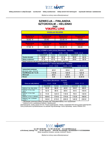 bilety promowe w całej Europie ∙ eurotunnel ∙ bilety autokarowe ∙ bilety tanich linii lotniczych ∙ wycieczki lotnicze i autokarowe Wydruk ze strony www.eSkandynawia.pl SZWECJA – FINLANDIA SZTOKHOLM – HELSINKI 2008 ROZKŁAD REJSÓW Wypłynięcie Sztokholm Przypłynięcie Mariehamn Wypłynięcie Mariehamn Przypłynięcie Helsinki 16:45 23:40 23:45 10:00 Wypłynięcie Helsinki Przypłynięcie Mariehamn Wypłynięcie Mariehamn Przypłynięcie Sztokholm 17:30 04:25 04:35 09:40 Ceny w EURO w jedną stronę (Stockholm - Helsinki) 01.01 - 15.06 CODZIENNIE (OPRÓCZ PIĄTKU) 34 € 27 € Osoba dorosła 16.06 – 17.08 18.08 - 31.12 PIĄTEK CODZIENNIE CODZIENNIE 59 € 47 € 51 € 41 € 36 € 29 € (OPRÓCZ PIĄTKU) Bilety zniżkowe* * Bilety zniżkowe dla grup ważne także dla rodzin, studentów i seniorów PIĄTEK 62 € 50 € Ceny pojazdów w 1 stronę (Stockholm - Helsinki) 01.01 - 15.06 samochód osobowy do 2,4 m wys. i 6 m dł. Van/Minibus do 7 m dł. Motocykl Rower 16.06 – 17.08 CODZIENNIE 18.08 - 31.12 40 € 65 € 42 € 116 € 20 € 6€ 134 € 34 € 6,50 € 122 € 21 € 6,50 € Ceny kabin (Stockholm - Helsinki) Cena za całą kabinę* 01.01 - 15.06 CODZIENNIE (OPRÓCZ PIĄTKU) PIĄTEK 16.06 – 17.08 CODZIENNIE 18.08 - 31.12 CODZIENNIE (OPRÓCZ PIĄTKU) PIĄTEK Q3 Kabina 3 os. bez okna 24 € 66 € 42 € 24 € 69 € Kabina 1-4 os. bez C4 42 € 96 € 68 € 44 € 100 € okna Kabina 1-4 os. bez B4/ 73 € 124 € 118 € 76 € 130 € B2 okna Kabina 1-4 os. z oknem A4/ 104 € 174 € 174 € 110 € 184 € A2 Kabina 2 os. z oknem LYX 130 € 215 € 200 € 140 € 230 € (LUX) ** * Obowiązek rezerwacji kabiny na każdy rejs. Wszystkie kabiny z wc i prysznicem ** Kabina (LUX) z podwójnym łóżkiem i telewizorem Zaokrętowanie: osoby piesze 30 min. Przed wypłynięciem. Osoby z pojazdami 60 minut przed wypłynięciem. Ceny przeliczane są każdorazowo na złotówki wg aktualnego kursu sprzedaży banku PEKAO S.A. tel. 091 48 88 958 ∙ fax 091 48 88 926 ∙ [email protected] ul.Królowej Jadwigi 11/2 ∙ 70-307 Szczecin ∙ PKO BP SA (Inteligo) 50102055581111127250200064 Bilety wysyłamy emailem, pocztą, kurierem, faxem… Wydruk ze strony www.eSkandynawia.pl