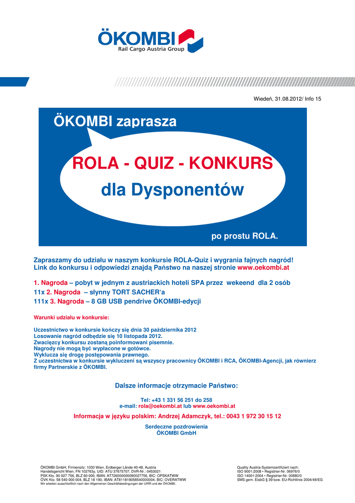 Wiedeń, 31.08.2012/ Info 15 ÖKOMBI zaprasza Innovativer Sattelauflieger Umschlag ROLA - QUIZ - KONKURS dla Dysponentów po prostu ROLA. Zapraszamy do udziału w naszym konkursie ROLA-Quiz i wygrania fajnych nagród! Link do konkursu i odpowiedzi znajdą Państwo na naszej stronie www.oekombi.at 1. Nagroda – pobyt w jednym z austriackich hoteli SPA przez wekeend dla 2 osób 11x 2. Nagroda – słynny TORT SACHER‘a 111x 3. Nagroda – 8 GB USB pendrive ÖKOMBI-edycji Warunki udziału w konkursie: Uczestnictwo w konkursie kończy się dnia 30 października 2012 Losowanie nagród odbędzie się 10 listopada 2012. Zwacięzcy konkursu zostaną poinformowani pisemnie. Nagrody nie mogą być wypłacone w gotówce. Wyklucza się drogę postępowania prawnego. Z uczestnictwa w konkursie wykluczeni są wszyscy pracownicy ÖKOMBI i RCA, ÖKOMBI-Agencji, jak równierz firmy Partnerskie z ÖKOMBI. Dalsze informacje otrzymacie Państwo: Tel: +43 1 331 56 251 do 258 e-mail: [email protected] lub www.oekombi.at Informacja w języku polskim: Andrzej Adamczyk, tel.: 0043 1 972 30 15 12 Serdeczne pozdrowienia ÖKOMBI GmbH ÖKOMBI GmbH, Firmensitz: 1030 Wien, Erdberger Lände 40-48, Austria Handelsgericht Wien, FN 102763y, UID: ATU 37675707, DVR-Nr.: 0453021 PSK Kto. 90 027 756, BLZ 60 000, IBAN: AT726000000090027756, BIC: OPSKATWW ÖVK Kto. 58 540 000 004, BLZ 18 190, IBAN: AT811819058540000004, BIC: OVERATWW Wir arbeiten ausschließlich nach den Allgemeinen Geschäftsbedingungen der UIRR und der ÖKOMBI. Quality Austria-Systemzertifiziert nach: ISO 9001:2008 • Registrier-Nr. 06976/0 ISO 14001:2004 • Registrier-Nr. 00880/0 SMS gem. EisbG § 39 bzw. EU-Richtlinie 2004/49/EG