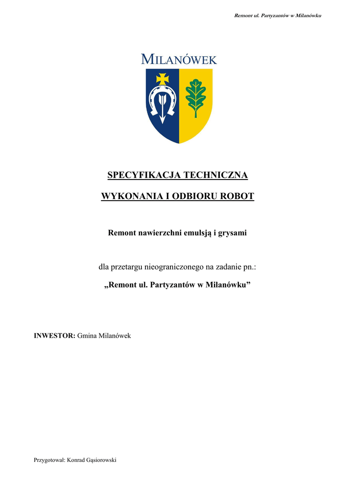 Remont ul. Partyzantów w Milanówku SPECYFIKACJA TECHNICZNA WYKONANIA I ODBIORU ROBOT Remont nawierzchni emulsją i grysami dla przetargu nieograniczonego na zadanie pn.: „Remont ul. Partyzantów w Milanówku” INWESTOR: Gmina Milanówek Przygotował: Konrad Gąsiorowski Specyfikacja Techniczna Wykonania i Odbioru Robót 1. CZĘŚĆ OGÓLNA 1.1 Przedmiot i zakres stosowania Przedmiotem SST są wymagania dotyczące wykonania i odbioru remontu nawierzchni z destruktu asfaltowego wykonanego technologią dwukrotnego powierzchniowego utrwalania. Powierzchniowe utrwalanie jako zabieg utrzymaniowy nie wpływa na poprawą nośności nawierzchni ani na jej równość. 1.2 Podstawowe określenia Remont nawierzchni – zabiegi techniczne do natychmiastowego wykonania związane z usuwaniem uszkodzeń zagrażających bezpieczeństwu ruchu jak również zabiegi hamujące proces powiększania się powstałych uszkodzeń bądź ich skutków, spowodowanych ruchem drogowym oraz czynnikami atmosferycznymi. Ubytek – wykruszenie materiału min. - bitum. na głębokość nie większą niż grubość warstwy. Wybój – wykruszenie materiału min – bitumicznego na głębokość większą niż grubość warstwy. Emulsja asfaltowa, kationowa, szybkorozpadowa, niemodyfikowana – lepiszcze asfaltowe w postaci zawiesiny rozproszonego asfaltu w wodzie. 1.3. Zakres robót objętych STWiOR Ustalenia zawarte w niniejszej specyfikacji dotyczą zasad prowadzenia robót związanych z remontem nawierzchni z destruktu asfaltowego poprzez dwukrotne powierzchniowe utrwalenie, polegające na kolejnym rozłożeniu: a) warstwy lepiszcza, b) warstwy kruszywa, c) drugiej warstwy lepiszcza, d) warstwy drobniejszego kruszywa, Do podwójnego powierzchniowego utrwalenia należy stosować kruszywo łamane o frakcjach: 2÷4mm, 6,3÷10mm lub 2÷5mm, 8÷11mm spełniające wymagania zgodnie z normą PN-EN 13043. Jako lepiszcze do powierzchniowego utrwalenia należy stosować drogową kationową emulsję asfaltową szybkorozpadową. 2 . MATERIAŁY 2.1 Kruszywo Do remontu cząstkowego nawierzchni bitumicznych należy stosować grysy płukane odpowiadające wymaganiom PN-B-11112 klasy I gat 1, z tym że wprowadza się zwiększone wymagania dotyczące czystości i zawartości ziaren nieforemnych, a/ zawartość ziaren mniejszych od 0,075 mm odsianych na mokro, nie więcej niż 0,5 % (mm) b/ zawartość ziaren nieforemnych nie więcej niż 20 % (mm) c/ do remontu należy stosować kruszywo łamane o frakcjach: - 2÷4 mm, 6,3÷10 mm lub - 2÷5mm, 8÷11 mm zgodnie z normą PN-EN 13043. Dopuszcza się stosowanie wąskich frakcji o wymiarach innych niż podane pod warunkiem, że zostaną zaakceptowane przez wyznaczonego przedstawiciela Zamawiającego. Do powierzchniowego utrwalania nie dopuszcza się kruszywa pochodzącego ze skał wapiennych. Wbudowane grysy muszą posiadać Deklaracje Zgodności. 2.2 Lepiszcze. Do remontu cząstkowego należy stosować emulsję asfaltową kationową szybkorozpadową, spełniającą wymogi zawarte w specyfikacjach technicznych „ Nawierzchnia powierzchniowo utrwalana” D-05.03.08 ; 05.03.10. Każda zakupiona przez Wykonawcę partia emulsji winna posiadać świadectwo jakości lub deklarację zgodności. 3 SPRZĘT 3.1 Ogólne wymagania dotyczące sprzętu Wykonawca przystępujący do wykonywania remontu metodą powierzchniowego utrwalani powinien wykazać się możliwością korzystania z następującego sprzętu : - piły do cięcia nawierzchni, oskardów, kilofów lub frezarki - szczotki do czyszczenia mechanicznego lub ręcznego - sprężarki z osprzętem do czyszczenia - skrapiarka lepiszcza - do rozłożenia lepiszcza na nawierzchni, 2 Przygotował: Konrad Gąsiorowski Specyfikacja Techniczna Wykonania i Odbioru Robót - rozsypywarka kruszywa - do rozłożenia kruszywa na nawierzchni, - walec ogumiony o gładkim bieżniku lub lekki walec statyczny nie powodujący kruszenia ziarn grysu – do przywałowania rozłożonego kruszywa 4. TRANSPORT Wykonawca jest zobowiązany do stosowania jedynie takich środków transportu, które nie wpłyną niekorzystnie na jakość wykonywanych robót i właściwości przewożonych materiałów. Pojazdy powinny być zgodne z STWiOR. Przy ruchu na drogach publicznych pojazdy będą spełniać wymagania dotyczące przepisów ruchu drogowego w odniesieniu do dopuszczalnych obciążeń na osie i innych parametrów technicznych. Wykonawca będzie usuwać na bieżąco, na własny koszt, wszelkie zanieczyszczenia spowodowane jego pojazdami na drogach publicznych oraz dojazdach do terenu budowy. 5. WYKONANIE ROBÓT 5.1. Ogólne zasady Do wykonania powierzchniowego utrwalenia Wykonawca może przystąpić tylko wówczas, gdy przyczepność aktywna kruszywa do wybranego rodzaju emulsji określona zgodnie z normą BN-70/8931-08 będzie większa niz 85 %. Remonty można wykonywać w okresie gdy temperatura otoczenia nie jest niższa od +10 ºC przy stosowaniu asfaltowej emulsji kationowej i nie niższa niż + 15 ºC przy stosowaniu innych lepiszczy. Okres wykonywania powierzchniowych utrwaleń : - od 01.05 – 30.09. przy asfalcie upłynnionym i polimeroasfalcie, - od 01.06 – 31.08 przy emulsji asfaltowej, W zależności od roku okresy te mogą ulec skróceniu lub wydłużeniu. Nie powinno się wykonywać remontów tą technologią przy zbyt dużych upałach, gdyż może nastąpić przyklejenie się ziaren kruszywa do opon przejeżdżających samochodów. Nie wolno przystępować do robót podczas opadów atmosferycznych. Przed przystąpieniem do robót należy wykonać i zatwierdzić projekt organizacji robót na czas remontu. Oznakowanie powinno być zgodne z rozporządzeniem Ministra Infrastruktury z dnia 23 września 2003r. Za prawidłowe oznakowanie od chwili przekazania placu budowy aż do odbioru robót objętych zleceniem, odpowiedzialny jest Wykonawca robót. 5.2 Przygotowanie nawierzchni do naprawy Przed przystąpieniem do utrwalenia nawierzchni należy wykonać prace