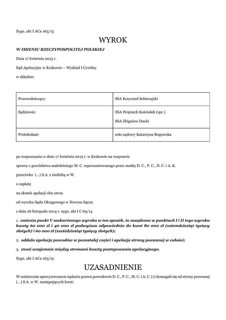 Sygn. akt I ACa 163/15 WYROK W IMIENIU RZECZYPOSPOLITEJ POLSKIEJ Dnia 17 kwietnia 2015 r. Sąd Apelacyjny w Krakowie – Wydział I Cywilny w składzie: Przewodniczący: SSA Krzysztof Sobierajski Sędziowie: SSA Wojciech Kościołek (spr.) SSA Zbigniew Ducki Protokolant: sekr.sądowy Katarzyna Rogowska po rozpoznaniu w dniu 17 kwietnia 2015 r. w Krakowie na rozprawie sprawy z powództwa małoletniego M. C. reprezentowanego przez matkę D. C., P. C., D. C. i A. K. przeciwko (...) S.A. z siedzibą w W. o zapłatę na skutek apelacji obu stron od wyroku Sądu Okręgowego w Nowym Sączu z dnia 26 listopada 2014 r. sygn. akt I C 69/14 1. zmienia punkt V zaskarżonego wyroku w ten sposób, że zasądzone w punktach I i II tego wyroku kwoty 60 000 zł i 40 000 zł podwyższa odpowiednio do kwot 80 000 zł (osiemdziesiąt tysięcy złotych) i 60 000 zł (sześćdziesiąt tysięcy złotych); 2. oddala apelację powodów w pozostałej części i apelację strony pozwanej w całości; 3. znosi wzajemnie między stronami koszty postepowania apelacyjnego. Sygn. akt I ACa 163/15 UZASADNIENIE W ostatecznie sprecyzowanym żądaniu pozwu powodowie D. C., P. C., M. C. i A. C. (1) domagali się od strony pozwanej (...) S.A. w W. następujących kwot: - na rzecz D. C. kwoty 150.000 zł tytułem zadośćuczynienia z ustawowymi odsetkami od dnia 11 czerwca 2013 r. do dnia zapłaty oraz 20.000 zł tytułem odszkodowania za znaczne pogorszenie sytuacji życiowej wraz z ustawowymi odsetkami od dnia 18 lipca 2013 r. do dnia zapłaty, - na rzecz P. C. kwoty 150.000 zł tytułem zadośćuczynienia z ustawowymi odsetkami od dnia 13 października 2013 r. do dnia zapłaty oraz 20.000 zł tytułem odszkodowania za znaczne pogorszenie sytuacji życiowej wraz z ustawowymi odsetkami od dnia 13 października 2013 r. do dnia zapłaty, - na rzecz M. C. kwoty 75.000 zł tytułem zadośćuczynienia z ustawowymi odsetkami od dnia 11 czerwca 2013 r. do dnia zapłaty, - na rzecz A. K. kwoty 50.000 zł tytułem zadośćuczynienia z ustawowymi odsetkami od dnia 11 czerwca 2013 r. do dnia zapłaty. Nadto wnieśli o zasądzenie kosztów postępowania. według załączonego spisu kosztów, przy uwzględnieniu dwukrotności stawki wynagrodzenia pełnomocnika. Strona pozwana (...) Zakład (...) w W. domagał się o oddalenia powództwa w całości oraz zasądzenie kosztów postępowania. Nie zakwestionował swojej odpowiedzialności co do zasady, ca wyjątkiem powódki A. C. (1), natomiast wskazał, że wypłacone powodom kwoty są odpowiednie i adekwatne do doznanej krzywdy i szkody. Zaskarżonym wyrokiem z dnia 26 listopada 2014 r. sygn. akt I C 69/14 Sąd Okręgowy w Krakowie zasądził od strony pozwanej na rzecz powódki D. C. kwotę 60.000 zł z ustawowymi odsetkami od kwoty 40.000 zł od dnia 11 czerwca 2013 r. do dnia zapłaty, zaś od kwoty 20.000 zł z ustawowymi odsetkami od dnia 18 lipca 2013 r. do dnia zapłaty (punkt I), zasądził od strony pozwanej na rzecz powoda P. C. kwotę 60.000 zł z ustawowymi odsetkami od dnia 13 października 2013 r. do dnia zapłaty (punkt II), zasądził od strony pozwanej na rzecz powoda M. C. kwotę 30.000 zł z ustawowymi odsetkami od dnia 11 czerwca 2013 r. do dnia zapłaty (punkt III), zasądził od strony pozwanej na rzecz powódki A. K. kwotę 30.000 zł z ustawowymi odsetkami od dnia 11 czerwca 2013 r. do dnia zapłaty (punkt IV), w pozostałym zakresie powództwa oddalił (punkt V), nakazał ściągnąć na rzecz Skarbu Państwa - Sądu Okręgowego w Nowym Sączu od strony pozwanej kwotę 9.000 zł tytułem opłaty od pozwu od uwzględnionej części roszczeń, od uiszczenia której powodowie byli zwolnieni oraz 468,42 zł tytułem części wydatków tymczasowo poniesionych przez Skarb Państwa, a od powodów D. C. i P. C. kwoty po 175,66 zł tytułem części wydatków tymczasowo poniesionych przez Skarb Państwa - z zasądzonego na rzecz każdego z nich roszczenia odpowiednio w pkt I i II (punkt VI), zasądził od strony pozwanej solidarnie na rzecz powodów D. C., P. C., A. K. i M. C. kwotę 8062,82 zł tytułem zwrotu kosztów zastępstwa procesowego (punkt VII), w pozostałym zakresie kosztami postępowania obciążył Skarb Państwa (punkt VIII). Za bezsporne Sąd Okręgowy uznał następujące okoliczności, stanowiące podstawę wydanego wyroku: W dniu 28 sierpnia 2012 r. w T. doszło do wypadku komunikacyjnego, w wyniku którego wskutek doznanych obrażeń, śmierć na miejscu poniosła A. C. (2). Sprawca wypadku K. C. został skazany prawomocnym wyrokiem Sądu Rejonowego w Nowym Sączu z dnia 3 lipca 2013 r. do sygn. II K 12/13. Odpowiedzialność za skutki wypadku w ramach umowy ubezpieczenia odpowiedzialności cywilnej przejął ubezpieczyciel sprawcy (...) S.A. z siedzibą w W.. Pismem z dnia 7 maja 2013 r. powodowie reprezentowani przez pełnomocnika, zwrócili się do ubezpieczyciela o przyznanie tytułem zadośćuczynienia: na rzecz D. C. kwoty 200.000 zł, M. C. 100.000 zł, zaś A. K. 50.000 zł. Wraz z pismem z dnia 11 czerwca 2013 r., strona pozwana przyznała tytułem zadośćuczynienia 40.000 zł na rzecz D. C. i 25.000 zł na rzecz M. C., odmawiając zarazem wypłaty na rzecz A. K.. W częściowym uwzględnieniu wniosku D. C. z dnia 14 czerwca 2013 r. o przyznanie 30.000 zł tytułem odszkodowania za pogorszenie sytuacji życiowej po śmierci córki, strona pozwana wypłaciła wnioskującej kwotę 10.000 zł. Z kolei pismem z dnia 9 września 2013 r. P. C. zwrócił się do ubezpieczyciela o wypłatę, pozostałej z dobrowolnie wypłaconych do 40.000 zł, sumy 160.000 zł tytułem zadośćuczynienia, a także dalszych 20.000 zł (z uwzględnionych 10.000 zł) odszkodowania z tytułu pogorszenia sytuacji życiowej po śmierci córki Podstawą zapadłego wyroku były również następujące ustalenia faktyczne. Zmarła A. C. (2) była starszą z dwojga dzieci powodów D. i P. C., siostrą M.. Wszyscy zamieszkiwali wspólnie w Ś. i tworzyli zgodną, opartą o trad