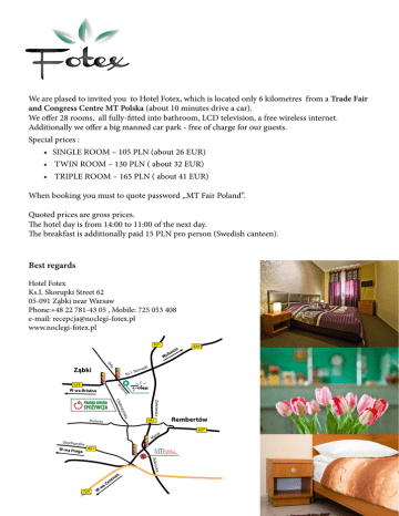 We are plased to invited you to Hotel Fotex, which is located only 6 kilometres from a Trade Fair and Congress Centre MT Polska (about 10 minutes drive a car). We offer 28 rooms, all fully-fitted into bathroom, LCD television, a free wireless internet. Additionally we offer a big manned car park - free of charge for our guests. Special prices : • SINGLE ROOM – 105 PLN (about 26 EUR) • TWIN ROOM – 130 PLN ( about 32 EUR) • TRIPLE ROOM – 165 PLN ( about 41 EUR) When booking you must to quote password „MT Fair Poland”. Quoted prices are gross prices. The hotel day is from 14:00 to 11:00 of the next day. The breakfast is additionally paid 15 PLN pro person (Swedish canteen). Best regards Hotel Fotex Ks.I. Skorupki Street 62 05-091 Ząbki near Warsaw Phone:+48 22 781-43 05 , Mobile: 725 053 408 e-mail: [email protected] www.noclegi-fotex.pl 631 in 634 łom Wo Or la Ząbki a ow iat Kw 634 W-wa Bródno ka yńs W-wa Prag a Żołnierska łmż Che Strażacka Grochowsk a pki oru . Sk Ks. I 631 M sa ar 631 Rekru cka m 724 ru nt Ce a -w W Rembertów 637