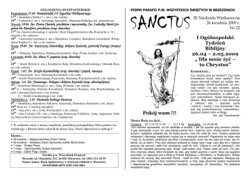OGŁOSZENIA DUSZPASTERSKIE Poniedziałek 27.04 Poniedziałek III Tygodnia Wielkanocnego 1730 + Stanisława Bedlę (7 r. śm.) z int. rodziny 1800 + Tadeusza (r. śm.), Antoniego Januszków, Mariannę Kubicką z int. Januszkowej Wtorek 28.04 Św. Piotra Chanela, prezbitera prezbitera i męczennika; Św. Ludwika Marii GriGri- gnion De Mont Montfort, prezbitera (wsp. dowolne) 1730 Do Zmartwychwstałego o zdrowie i Boże błogosławieństwo dla Wojciecha w 18 r. urodzin z int. rodziców 1800 + Genowefę Lużyńską (r. śm.), Bolesława, Czesława, Stanisława Lużyńskich, Władysława Krążka (2 r. śm.) z int. rodziny Środa 29.04 Św. Katarzyny Sieneńskiej, doktora Kościoła, patronki Euro Europy (święto) 700 1800 + Wiktorię, Stanisława, Stefanię Kuciembów, Jana i Piotra Sochów z int. Sochowej Czwartek 30.04 Św. Piusa V, papieża (wsp. dowolne) 700 1800 + Józefa Brzozę (r. śm.), Kazimierza Bałę, Mirosława Kozłowskiego, Edwarda Brzozę z int. rodziny Piątek 1.05 Św. Józefa Rzemieślnika (wsp. dowolne) I piątek miesiąca 700 + Franciszka(r. śm.), Mariannę Kowalskich z int. córki 1800 + Józefa Wojciechowskiego, Franciszka, Mariannę Wojciechowskich z int. rodziny Sobota 2.05 Św. Atanazego , biskupa i doktora Kościoła (wsp. obowiązkowe) 700 + Stanisława Malickiego (r. śm.), Annę Woźniak z int. rodziny 1800 1) + Franciszkę, Henryka Kowalskich, Stanisława Rozparę, Jana Więcławskiego, Józefa i Antoninę Kutrysiów z int. rodziny 2) + Józefa Gosudarskiego z int. córki NIEDZIELA 3.05 Niedziela Dobrego Pasterza 800 + Stanisławę, Stanisława Sołtysów, Genowefę, Stanisława Stachurów z int. dzieci 1000 Msza św. w intencji strażaków 1200 + Jana (16 r. śm.), Zofię Woźniczków z int. rodziny 1600 + Jana Cudzika (38 r. śm.), Antoniego, Katarzynę Cudzików, Annę, Augustyna, Juliana, Mieczysława Gruszczyńskich z int. Cudzikowej PISMO PARAFII P.W. WSZYSTKICH ŚWIĘTYCH W BRZEZINACH SANC SANCTUS III Niedziela Wielkanocna 26 kwietnia 2009 r. Nr 22 I Ogólnopolski Tydzień Biblijny 26.04 – 2.05.2009 „ Dla mnie żyć – to Chrystus” Komentarz… Pokój wam !!! Czy można jeść po śmierci? Czy ciało chwalebne może mieć apetyt? Pan Jezus dokonał czegoś po ludzku nielogicznego. Chciał przekonać, ze chociaż umarł, nie jest cieniem, zjawą, duchem, który straszy na drogach, ale jest zmartwychwstałym, w pełni żyjącym człowiekiem, nawet łaknącym jedzenia. Bóg każdego z nas powołuje z niebytu, aby – poprzez życie i śmierć – każdy z nas dojrzewał i stawał się przemienionym człowiekiem, żyjącym potem tylko w Bogu. /ks. Jan Twardowski/ Słowo Boże na dziś… † W ostatnim czasie z naszej wspólnoty parafialnej pożegnaliśmy Mieczysława Lurzyńskiego z Brzezin który odszedł do domu Ojca. Niech odpoczywa w pokoju † Ekstra… × 29 kwietnia – Międzynarodowy Dzień Tańca × 30 kwietnia – Światowy Dzień Sprzeciwu wobec Bicia Dzieci × 1 maja – Święto Pracy × 1 maja – Ogólnopolskie Święto Kaszanki × 2 maja – Dzień Flagi i Godła Parafia p.w. Wszystkich Świętych Brzeziny ul. Chęcińska 312, 26-026 Morawica, tel. (041) 311 42 59 Numer konta: Bank Spółdzielczy w Kielcach Oddział w Morawicy 08 84930004 0070 0205 4104 0001 Czytania: Dz 3,13-15.17-19 / 1J 2,1-5a Ewangelia: Łk 24,35-48 „Oni również opowiadali, co ich spotkało w drodze, i jak Go poznali przy łamaniu chleba. A gdy rozmawiali o tym, On sam stanął pośród nich i rzekł do nich: «Pokój wam!» Zatrwożonym i wylękłym zdawało się, że widzą ducha. Lecz On rzekł do nich: «Czemu jesteście zmieszani i dlaczego wątpliwości budzą się w waszych sercach? Popatrzcie na moje ręce i nogi: to Ja jestem. Dotknijcie się Mnie i przekonajcie: duch nie ma ciała ani kości, jak widzicie, że Ja mam». Przy tych słowach pokazał im swoje ręce i nogi. Lecz gdy oni z radości jeszcze nie wierzyli i pełni byli zdumienia, rzekł do nich: «Macie tu coś do jedzenia?» Oni podali Mu kawałek pieczonej ryby. Wziął i jadł wobec nich. Potem rzekł do nich: «To właśnie znaczyły słowa, które mówiłem do was, gdy byłem jeszcze z wami: Musi się wypełnić wszystko, co napisane jest o Mnie w Prawie Mojżesza, u Proroków i w Psalmach». Wtedy oświecił ich umysły, aby rozumieli Pisma, i rzekł do nich: «Tak jest napisane: Mesjasz będzie cierpiał i trzeciego dnia zmartwychwstanie, w imię Jego głoszone będzie nawrócenie i odpuszczenie grzechów wszystkim narodom, począwszy od Jerozolimy. Wy jesteście świadkami tego.” A w parafii… Boży człowiek… - św. Katarzyna Sieneńska (29 kwietnia) ▪ Na spotkaniu Komitetu Odnowy naszego Kościoła, została podpisana umowa, dotycząca renowacji ołtarzy bocznych. Koniec prac przewidziano na 15 października 2009 r. ▪ W miniony wtorek rozpoczęły się prace konserwatorskie przy ołtarzu „Św. Antoniego”. Został on zdemontowany przewieziony do pracowni konserwatorskiej. ▪ Zapraszamy wszystkich na nabożeństwa majowe, które odbywać się będą w dni powszednie po ostatniej mszy popołudniowej, a w niedziele po mszy św. o godz. 16.00. ▪ W piątek 1 maja po mszy św. popołudniowej w organistówce odbędzie się spotkanie kręgu biblijnego. Zapraszamy młodzież, dzieci i ministrantów. Dorastała w licznej rodzinie - jej rodzice mieli 25 dzieci. Ojciec zajęty był zarabianiem na życie rodziny, matka obowiązkami domowymi – do których niekoniecznie należało kształcenie dzieci – Katarzyna nie umiała pisać .Katarzyna więc od najmłodszych lat poszukiwała samotności poza rodziną. W każdym razie trochę odstające od rodziny dzieci przestają z przyjaciółmi z wyobraźnie – przyjacielem malej Katarzyny został sam Jezus. Nic też dziwnego, że oparła się rodzinnym projektem małżeńskim i została tercjarką dominikańską. Od tej pory oddawała się praktykom ascetycznym, opiece nad ubogimi i chorymi. Jej ekstazy i wizje, a następnie otrz