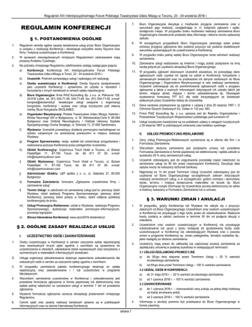 Regulamin XIV Interdyscyplinarnego Forum Polskiego Towarzystwa Udaru Mózgu w Toruniu, 23 - 24 września 2016 r. REGULAMIN KONFERENCJI 7. Biuro Organizacyjne decyduje o możliwości przyjęcia zamówienia oraz o warunkach jego realizacji, uwzględniając m. in. kolejność zgłoszeń i wpłat, dostępność miejsc. W przypadku braku możliwości realizacji zamówienia Biuro Organizacyjne niezwłocznie przekaże taką informację i dokona zwrotu wpłaconej zaliczki. 8. W szczególnych przypadkach Biuro Organizacyjne zastrzega sobie prawo odmowy przyjęcia zgłoszenia bez podania przyczyn lub podania dodatkowych warunków uprawniających do uczestniczenia w Konferencji. 9. W przypadku braku pełnej wpłaty Biuro Organizacyjne może odmówić realizacji zamówienia. 10. Zamawiane usługi realizowane są imiennie i mogą zostać przepisane na inną osobę jedynie po uzyskaniu akceptacji Biura Organizacyjnego. § 1. POSTANOWIENIA OGÓLNE 1. Regulamin określa ogólne zasady świadczenia usług przez Biuro Organizacyjne w związku z realizacją Konferencji i obowiązuje wszystkie osoby fizyczne oraz firmy / instytucji uczestniczące w Konferencji. 2. W sprawach nieuregulowanych niniejszym Regulaminem zastosowanie mają przepisy Kodeksu Cywilnego. 3. Na potrzeby niniejszego Regulaminu zdefiniowane zostają następujące pojęcia: a) Konferencja: Konferencja XIV Interdyscyplinarne Forum Polskiego Towarzystwa Udaru Mózgu w Toruń, 23 - 24 września 2016 r. b) Uczestnik: Podmiot zamawiający usługi i opłacający ich realizację. c) Osoba uczestnicząca w Konferencji: Osoba fizyczna zarejestrowana jako uczestnik Konferencji i uprawniona do udziału w obradach i korzystania z innych świadczeń w ramach opłaty rejestracyjnej. d) Biuro Organizacyjne: firma PAIZ Konsulting Sp. z o.o. ul. Północna 129, 20-818 Lublin, tel. (81) 534-71-49, 534-71-48, fax. (81) 534-71-50, e-mail: [email protected]. świadczące usługi związane z organizacją kongresów, konferencji i wystaw oraz usługi turystyczne pod własną marką: Biuro Kongresów SKOLAMED. e) f) 11. W przypadku zgłoszeń zbiorowych Uczestnik oświadcza, że przesyłając dane zgłaszanych osób uzyskał ich zgodę na udział w Konferencji, korzystanie z zamawianych świadczeń oraz na przekazanie ich danych osobowych do Biura Organizacyjnego i Organizatora Merytorycznego w celu realizacji zamówienia. Uczestnik zobowiązuje się do poinformowania zgłoszonych osób o przyjęciu zgłoszenia a także o ważnych informacjach dotyczących ich udziału takich jak termin, miejsce obrad, miejsce i termin zakwaterowania itp. Obowiązek wystawienia formularzy PIT 8-C dla osób korzystających ze świadczeń opłaconych przez Uczestnika należy do Uczestnika. Organizator Merytoryczny: Polskie Towarzystwo Udaru Mózgu, Katedra i Klinika Neurologii UM w Bydgoszczy, ul. M. Skłodowskiej-Curie 9, 85-094 Bydgoszcz oraz Oddział Neurologiczny i Oddział Udarowy Szpitala Specjalistycznego Ducha Świętego, ul. Schinzla 13, 27-600 Sandomierz. Wystawca: Uczestnik prowadzący działania promocyjno-marketingowe na stoisku ustawionym na zamówionej powierzchni w miejscu realizacji Wystawy. g) Program Sponsorowany: sesja, wykład lub prezentacja przygotowana i realizowana podczas Konferencji przez prelegentów Uczestnika. h) Obiekt Konferencyjny: Copernicus Toruń Hotel w Toruniu, ul. Bulwar Filadelfijski 11, 87-100 Toruń, tel. 56 611 57 00, e-mail: [email protected]. i) Obiekt Wystawowy: Copernicus Toruń Hotel w Toruniu, ul. Bulwar Filadelfijski 11, 87-100 Toruń, tel. 56 611 57 00, e-mail: [email protected]. j) Administrator Obiektu: L&P spółka z o. o., ul. Gdańska 27, 85-005 Bydgoszcz. k) Formularz Zamówienia: formularz „Zgłoszenie uczestnictwa firmy – zamówienie usług”. l) Termin Usługi: w zależności od zamawianej usługi jest to: pierwszy dzień Wystawy, dzień realizacji Programu Sponsorowanego, pierwszy dzień Konferencji, pierwszy dzień pobytu w hotelu, dzień oddania publikacji konferencyjnej do druku. m) Usługi Promocyjno-Reklamowe: udział w Wystawie, realizacja Programu Sponsorowanego, dystrybucja materiałów promocyjno-informacyjnych, promocja logotypów. n) Strona Internetowa Konferencji: www.ptum2016.skolamed.pl. 1. Firma PAIZ Konsulting Sp. z o.o. wpisana jest do Rejestru Organizatorów i Pośredników Turystycznych Województwa Lubelskiego pod numerem 47. 14. Usługi turystyczne świadczone są na podstawie ustawy o usługach turystycznych z 29 sierpnia 1997 (z późniejszymi zmianami) oraz kodeksu cywilnego. USŁUGI PROMOCYJNO-REKLAMOWE 1. Ceny Usług Promocyjno-Reklamowych wymienione są w ofercie dla firm i w Formularzu Zamówienia. 2. Warunkiem złożenia zamówienia jest podpisanie umowy lub przesłanie Formularza Zamówienia w formie papierowej lub elektronicznej i wpłata zaliczki w wysokości 20 % ceny zamówionych usług. 3. Uczestnik zobowiązany jest do uregulowania pozostałej części należności za zamówione usługi na 90 dni przed rozpoczęciem Konferencji. Decyduje data wpływu kwoty na wskazany rachunek bankowy. 4. Najpóźniej na 14 dni przed Terminem Usługi Uczestnik zobowiązany jest do uzyskania od Biura Organizacyjnego szczegółowych zaleceń dotyczących realizacji zamówionych usług, a w szczególności: godzin montażu i demontażu stoisk, terminu i miejsca dostarczenia materiałów do teczek itp. Biuro Organizacyjne rozsyła informacje do Uczestników pocztą elektroniczną na adres e-mailowy wskazany w Formularzu Zamówienia lub w umowie. § 3. WARUNKI ZMIAN I ANULACJI Osoby uczestniczące w Konferencji w zamian uiszczenie opłaty rejestracyjnej oraz ewentualnych innych opłat zgodnie z cennikiem są uprawnione do uczestniczenia w obradach, odwiedzania stoisk wystawowych oraz korzystania z wymienionych w materiałach informacyjnych świadczeń. 1. W przypadku, gdyby Konferencja lub Wystawa nie odbyła się z przyczyn zależnych od Biura Organizacyjnego Uczestnikom oraz osobom uczestniczącym w 