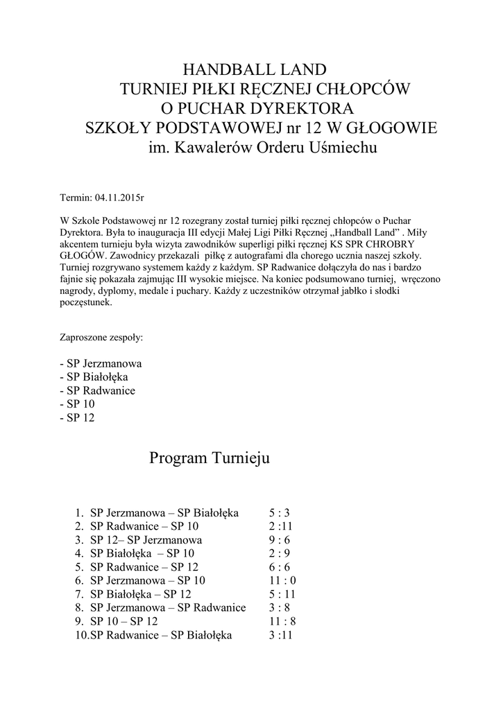 HANDBALL LAND TURNIEJ PIŁKI RĘCZNEJ CHŁOPCÓW O PUCHAR DYREKTORA SZKOŁY PODSTAWOWEJ nr 12 W GŁOGOWIE im. Kawalerów Orderu Uśmiechu Termin: 04.11.2015r W Szkole Podstawowej nr 12 rozegrany został turniej piłki ręcznej chłopców o Puchar Dyrektora. Była to inauguracja III edycji Małej Ligi Piłki Ręcznej „Handball Land” . Miły akcentem turnieju była wizyta zawodników superligi piłki ręcznej KS SPR CHROBRY GŁOGÓW. Zawodnicy przekazali piłkę z autografami dla chorego ucznia naszej szkoły. Turniej rozgrywano systemem każdy z każdym. SP Radwanice dołączyła do nas i bardzo fajnie się pokazała zajmując III wysokie miejsce. Na koniec podsumowano turniej, wręczono nagrody, dyplomy, medale i puchary. Każdy z uczestników otrzymał jabłko i słodki poczęstunek. Zaproszone zespoły: - SP Jerzmanowa - SP Białołęka - SP Radwanice - SP 10 - SP 12 Program Turnieju 1. SP Jerzmanowa – SP Białołęka 2. SP Radwanice – SP 10 3. SP 12– SP Jerzmanowa 4. SP Białołęka – SP 10 5. SP Radwanice – SP 12 6. SP Jerzmanowa – SP 10 7. SP Białołęka – SP 12 8. SP Jerzmanowa – SP Radwanice 9. SP 10 – SP 12 10.SP Radwanice – SP Białołęka 5:3 2 :11 9:6 2:9 6:6 11 : 0 5 : 11 3:8 11 : 8 3 :11 Klasyfikacja końcowa : 1 miejsce SP 10 2 miejsce SP 12 3 miejsce SP Radwanice 4 miejsce SP Jerzmanowa 5 miejsce SP Białołęka NAJLEPSZY ZAWODNIK TURNIEJU : Marcel Śmietana SP Radwanice NAJLEPSZY STRZELEC TURNIEJU : Bartosz Chmielnicki SP 12 NAJLEPSZY BRAMKARZ TURNIEJU : Kornel Sulimierski SP 10 Wybrano najlepszych zawodników w poszczególnych zespołach : SP Jerzmanowa : Wojciech Królak SP Białołęka : Dominik Jankowski SP Radwanice : Kasjan Frankowski SP 10 : Bartosz Urbanowicz SP 12 : Tymek Majcher Sponsorzy : Szkoła Podstawowa nr 12 w Głogowie im. Kawalerów Orderu Uśmiechu KS SPR Chrobry Głogów Sp. z.oo Fundacja Robotniczo Edukacyjna w Polkowicach Opracował: Wojciech Łuczyk