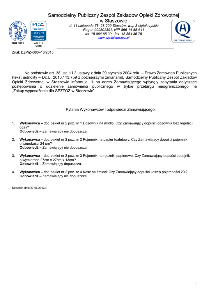 Samodzielny Publiczny Zespół Zakładów Opieki Zdrowotnej w Staszowie ul. 11 Listopada 78, 28-200 Staszów, woj. Świętokrzyskie Regon 000302391, NIP 866-14-55-641 tel. 15 864 85 39 , fax. 15 864 36 75 www.szpitalstaszow.pl Znak DZPiZ–380–16/2013 Na podstawie art. 38 ust. 1 i 2 ustawy z dnia 29 stycznia 2004 roku – Prawo Zamówień Publicznych (tekst jednolity – Dz.U. 2010.113.759 z późniejszymi zmianami), Samodzielny Publiczny Zespół Zakładów Opieki Zdrowotnej w Staszowie informuje, iŜ na adres Zamawiającego wpłynęły zapytania dotyczące postępowania o udzielenie zamówienia publicznego w trybie przetargu nieograniczonego na „Zakup wyposaŜenia dla SPZZOZ w Staszowie”. Pytania Wykonawców i odpowiedzi Zamawiającego: 1. Wykonawca – dot. pakiet nr 2 poz. nr 1 Dozownik na mydło: Czy Zamawiający dopuści dozownik bez regulacji dozy? Odpowiedź – Zamawiający nie dopuszcza. 2. Wykonawca – dot. pakiet nr 2 poz. nr 2 Pojemnik na papier toaletowy: Czy Zamawiający dopuści pojemnik o szerokości 24 cm? Odpowiedź – Zamawiający nie dopuszcza. 3. Wykonawca – dot. pakiet nr 2 poz. nr 3 Pojemnik na ręczniki papierowe: Czy Zamawiający dopuści podajnik o wymiarach 27cm x 27cm x 13cm? Odpowiedź – Zamawiający dopuszcza. 4. Wykonawca – dot. pakiet nr 2 poz. nr 4 Kosz na śmieci: Czy Zamawiający dopuści kosz o pojemności 20l? Odpowiedź – Zamawiający nie dopuszcza. Staszów, dnia 27.06.2013 r. 1