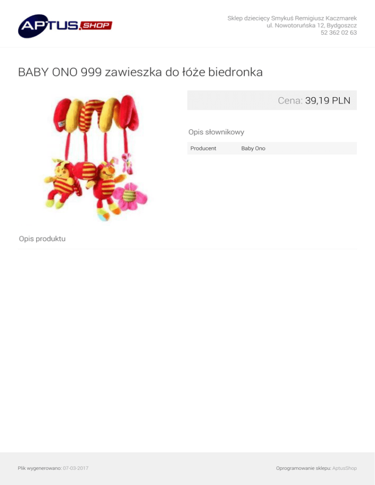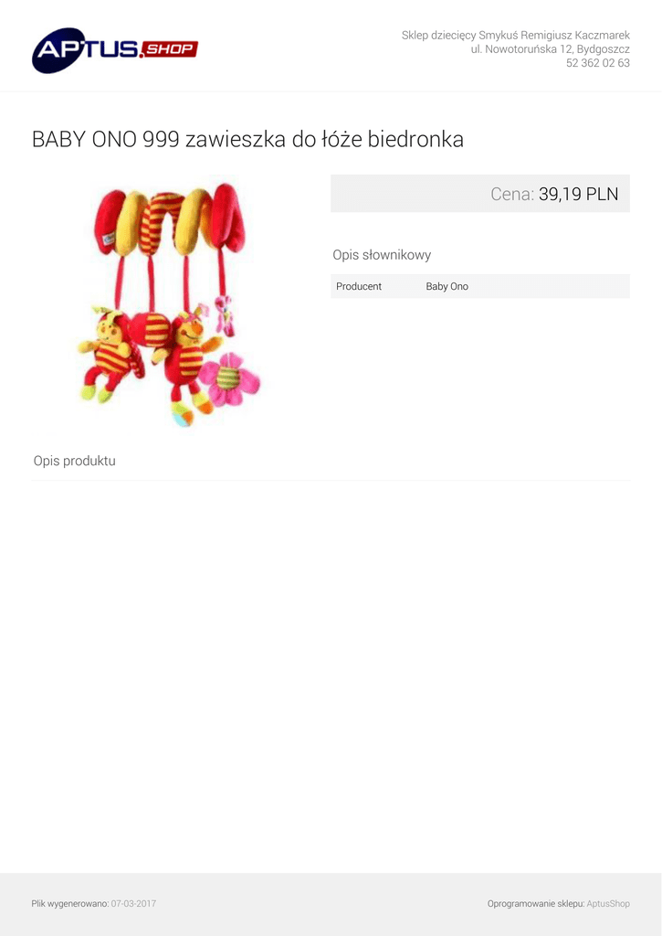Sklep dziecięcy Smykuś Remigiusz Kaczmarek ul. Nowotoruńska 12, Bydgoszcz 52 362 02 63 BABY ONO 999 zawieszka do łóże biedronka Cena: 39,19 PLN Opis słownikowy Producent Baby Ono Opis produktu Plik wygenerowano: 07-03-2017 Powered by TCPDF (www.tcpdf.org) Oprogramowanie sklepu: AptusShop