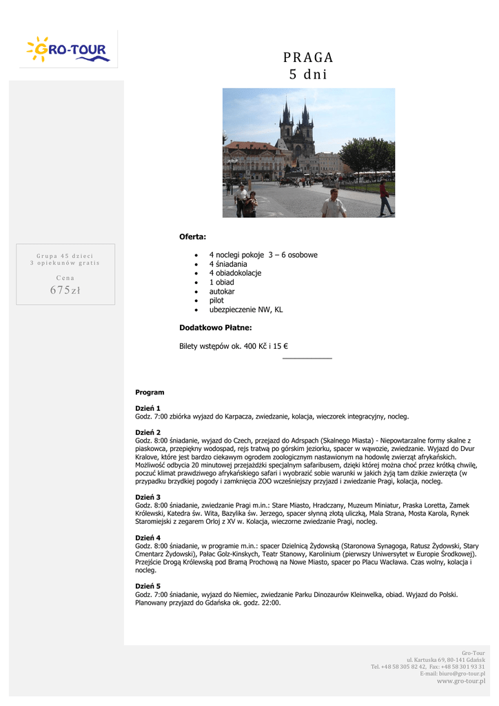 PRAGA 5 dni Oferta: Grupa 45 dzieci 3 opiekunów gratis Cena 6 75 z ł 4 noclegi pokoje 3 – 6 osobowe 4 śniadania 4 obiadokolacje 1 obiad autokar pilot ubezpieczenie NW, KL Dodatkowo Płatne: Bilety wstępów ok. 400 Kč i 15 € ____________ Program Dzień 1 Godz. 7:00 zbiórka wyjazd do Karpacza, zwiedzanie, kolacja, wieczorek integracyjny, nocleg. Dzień 2 Godz. 8:00 śniadanie, wyjazd do Czech, przejazd do Adrspach (Skalnego Miasta) - Niepowtarzalne formy skalne z piaskowca, przepiękny wodospad, rejs tratwą po górskim jeziorku, spacer w wąwozie, zwiedzanie. Wyjazd do Dvur Kralove, które jest bardzo ciekawym ogrodem zoologicznym nastawionym na hodowlę zwierząt afrykańskich. Możliwość odbycia 20 minutowej przejażdżki specjalnym safaribusem, dzięki której można choć przez krótką chwilę, poczuć klimat prawdziwego afrykańskiego safari i wyobrazić sobie warunki w jakich żyją tam dzikie zwierzęta (w przypadku brzydkiej pogody i zamknięcia ZOO wcześniejszy przyjazd i zwiedzanie Pragi, kolacja, nocleg. Dzień 3 Godz. 8:00 śniadanie, zwiedzanie Pragi m.in.: Stare Miasto, Hradczany, Muzeum Miniatur, Praska Loretta, Zamek Królewski, Katedra św. Wita, Bazylika św. Jerzego, spacer słynną złotą uliczką, Mala Strana, Mosta Karola, Rynek Staromiejski z zegarem Orloj z XV w. Kolacja, wieczorne zwiedzanie Pragi, nocleg. Dzień 4 Godz. 8:00 śniadanie, w programie m.in.: spacer Dzielnicą Żydowską (Staronowa Synagoga, Ratusz Żydowski, Stary Cmentarz Żydowski), Pałac Golz-Kinskych, Teatr Stanowy, Karolinium (pierwszy Uniwersytet w Europie Środkowej). Przejście Drogą Królewską pod Bramą Prochową na Nowe Miasto, spacer po Placu Wacława. Czas wolny, kolacja i nocleg. Dzień 5 Godz. 7:00 śniadanie, wyjazd do Niemiec, zwiedzanie Parku Dinozaurów Kleinwelka, obiad. Wyjazd do Polski. Planowany przyjazd do Gdańska ok. godz. 22:00. Gro-Tourm ul. Kartuska 69, 80-141 Gdańskm Tel. +48 58 305 82 42, Fax: +48 58 301 93 31m E-mail: [email protected] www.gro-tour.plm
