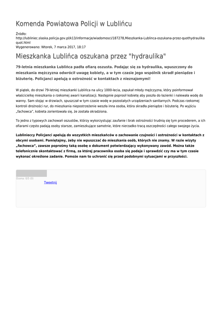 Komenda Powiatowa Policji w Lublińcu Źródło: http://lubliniec.slaska.policja.gov.pl/k13/informacje/wiadomosci/187278,Mieszkanka-Lublinca-oszukana-przez-quothydraulika quot.html Wygenerowano: Wtorek, 7 marca 2017, 18:17 Mieszkanka Lublińca oszukana przez "hydraulika" 79-letnia mieszkanka Lublińca padła ofiarą oszusta. Podając się za hydraulika, wpuszczony do mieszkania mężczyzna odwrócił uwagę kobiety, a w tym czasie jego wspólnik skradł pieniądze i biżuterię. Policjanci apelują o ostrożność w kontaktach z nieznajomymi! W piątek, do drzwi 79-letniej mieszkanki Lublińca na ulicy 1000-lecia, zapukał młody mężczyzna, który poinformował właścicielkę mieszkania o rzekomej awarii kanalizacji. Następnie poprosił kobietę aby poszła do łazienki i nalewała wodę do wanny. Sam stojąc w drzwiach, spuszczał w tym czasie wodę w pozostałych urządzeniach sanitarnych. Podczas rzekomej kontroli drożności rur, do mieszkania niepostrzeżenie weszła inna osoba, która skradła pieniądze i biżuterię. Po wyjściu „fachowca”, kobieta zorientowała się, że została okradziona. To jedno z typowych zachowań oszustów, którzy wykorzystując zaufanie i brak ostrożności trudnią się tym procederem, a ich ofiarami często padają osoby starsze, zamieszkujące samotnie, które nierzadko tracą oszczędności całego swojego życia. Lublinieccy Policjanci apelują do wszystkich mieszkańców o zachowanie czujności i ostrożności w kontaktach z obcymi osobami. Pamiętajmy, żeby nie wpuszczać do mieszkania osób, których nie znamy. W razie wizyty „fachowca”, zawsze poprośmy taką osobę o dokument potwierdzający wykonywany zawód. Można także telefonicznie skontaktować z firmą, za której pracownika osoba się podaje i sprawdzić czy ma w tym czasie wykonać określone zadanie. Pomoże nam to uchronić się przed podobnymi sytuacjami w przyszłości. Ocena: 0/5 (0) Tweetnij