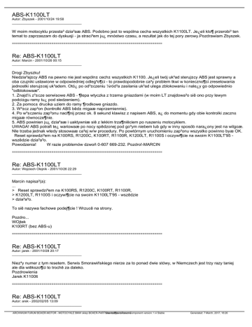 ABS-K1100LT Autor: Zbyszek - 2001/10/24 19:58 _____________________________________ W moim motocyklu przesta³ dzia³aæ ABS. Podobno jest to wspólna cecha wszystkich K1100LT. Je¿eli kto¶ przerobi³ ten temat to zaprzaszam do dyskusji - ja straci³em ju¿ mnóstwo czasu, a rezultat jak do tej pory zerowy.Pozdrawiam Zbyszek. ============================================================================ Re: ABS-K1100LT Autor: Marcin - 2001/10/26 00:15 _____________________________________ Drogi Zbyszku! Niedzia³aj±cy ABS na pewno nie jest wspóln± cech± wszystkich K1100. Je¿eli twój uk³ad steruj±cy ABS jest sprawny a oba czujniki ustawione w odpowiedniej odleg³o¶ci - to prawdopodobnie ca³y problem tkwi w konieczno¶ci zresetowania jednostki steruj±cej uk³adem. Otó¿ po od³±czeniu ¼ród³a zasilania uk³ad ulega zblokowaniu i nale¿y go odpowiednio "odblokowaæ". 1. Znajd¼ z³±cze serwisowe ABS - ¶lepa wtyczka z trzema gniazdami (w moim LT znajdowa³o siê ono przy lewym podci±gu ramy tu¿ pod siedzeniem). 2. Za pomoc± drucika uziem do ramy ¶rodkowe gniazdo. 3. W³±cz zap³on (kontrolki ABS bêd± migaæ naprzemiennie). 4. Po w³±czeniu zap³onu naci¶nij przez ok. 8 sekund klawisz z napisem ABS, a¿ do momentu gdy obie kontrolki zaczn± migaæ równocze¶nie. 5. ABS powinien ju¿ dzia³aæ i uaktywniæ siê z lekkim trza¶niêciem po ruszeniu motocyklem. UWAGA! ABS potrafi te¿ wariowaæ po nocy spêdzonej pod go³ym niebem lub gdy w inny sposób nara¿ony jest na wilgoæ. NIe trzeba jednak wtedy stosowaæ ca³ej w/w procedury. Po powtórnym uruchomieniu zap³onu wszystko powinno byæ OK. Reset sprawdzi³em na K100RS, R1200C, K100RT, R1100R, K1200LT, R1100S i oczywi¶cie na swoim K1100LT'95 wszêdzie dzia³a³o. Powodzenia! W razie problemów dzwoñ 0-607 669-232. Pozdro!-MARCIN ============================================================================ Re: ABS-K1100LT Autor: Wojciech Olejnik - 2001/10/26 22:29 _____________________________________ Marcin napisa³(a): ... > Reset sprawdzi³em na K100RS, R1200C, K100RT, R1100R, > K1200LT, R1100S i oczywi¶cie na swoim K1100LT'95 - wszêdzie > dzia³a³o. To siê nazywa fachowe podej¶cie ! Wrzucê na strony. Pozdro... WOjtek K100RT (bez ABS-u) ============================================================================ Re: ABS-K1100LT Autor: jarek - 2001/10/28 20:17 _____________________________________ Niez³y numer z tym resetem. Serwis Smorawiñskiego nierze za to ponad dwie stówy, w Niemczech jest trzy razy taniej ale dla wiêkszo¶ci to trochê za daleko. Pozdrowienia Jarek K1100lt ============================================================================ Re: ABS-K1100LT Autor: arek - 2002/02/05 13:09 _____________________________________ ARCHIWUM FoRUM BOXER-MOTOR - MOTOCYKLE BMW sklep BOXER-PARTS.eu MamboBoard czê¶ci i akcesoria Forum Component version: 1.4 Stable Generated: 7 March, 2017, 18:26 Powitac kolege z Lublina. Rada dobra, ale nie dotyczy R1100S - Nie ma przycisku do wylaczania ABS'u. A ze Smorawinskim nie jest az tak zle, wzial za to 150 zl ArekK ============================================================================ ARCHIWUM FoRUM BOXER-MOTOR - MOTOCYKLE BMW sklep BOXER-PARTS.eu MamboBoard czê¶ci i akcesoria Forum Component version: 1.4 Stable Generated: 7 March, 2017, 18:26
