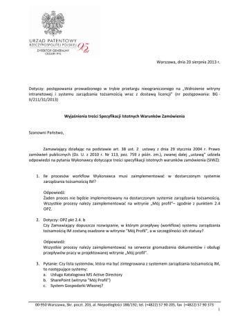 Warszawa, dnia 20 sierpnia 2013 r. Dotyczy: postępowania prowadzonego w trybie przetargu nieograniczonego na „Wdrożenie witryny intranetowej i systemu zarządzania tożsamością wraz z dostawą licencji" (nr postępowania: BG II/211/31/2013) Wyjaśnienia treści Specyfikacji Istotnych Warunków Zamówienia Szanowni Państwo, Zamawiający działając na podstawie art. 38 ust. 2 ustawy z dnia 29 stycznia 2004 r. Prawo zamówień publicznych (Dz. U. z 2010 r. Nr 113, poz. 759 z późn. zm.), zwanej dalej „ustawą” udziela odpowiedzi na pytania Wykonawcy dotyczące treści specyfikacji istotnych warunków zamówienia (SIWZ): 1. Ile procesów workflow Wykonawca musi zaimplementować w dostarczonym systemie zarządzania tożsamością IM? Odpowiedź: Żaden proces nie będzie implementowany na dostarczonym systemie zarządzania tożsamością. Wszystkie procesy należy zaimplementować na witrynie „Mój profil”– zgodnie z punktem 2.4 OPZ. 2. Dotyczy: OPZ pkt 2.4. b Czy Zamawiający dopuszcza rozwiązanie, w którym przepływy (workflow) systemu zarządzania tożsamością IM zostaną osadzone w witrynie "Mój Profil", a w szczególności ich statusy? Odpowiedź: Wszystkie procesy należy zaimplementować na serwerze gromadzenia dokumentów i obsługi przepływów pracy w projektowanej witrynie „Mój profil”. 3. Pytanie: Czy lista systemów, która ma być zintegrowana z systemem zarządzania tożsamością IM, to następujące systemy: a. Usługa Katalogowa MS Active Directory b. SharePoint (witryna "Mój Profil") c. System Gospodarki Własnej? 00-950 Warszawa, Skr. poczt. 203, al. Niepodległości 188/192; tel. (+4822) 57 90 205, fax (+4822) 57 90 373 1 Odpowiedź: Tak – zgodnie z punktem 2.4.1 OPZ. 4. Ile domen Active Directory należy zintegrować z systemem zarządzania tożsamością IM? Odpowiedź: Jedną domenę AD. 5. Jakie API (baza danych, widok, inne...) umożliwia integrację z System Gospodarki Własnej? Odpowiedź: W Systemie Gospodarki Własnej zostaną na potrzeby integracji z INTRANETEM przygotowane cztery widoki do wymiany informacji. Trzy z tych widoków zostały opisane w pkt. 3.4 OPZ. Czwarty z widoków pobierający informację o kalendarzach pracowników, a także mechanizm przesyłający informację zawartą w nowych wnioskach urlopowych do Systemu Gospodarki Własnej zostanie przygotowany przez Zamawiającego na etapie analizy. 6. Jaka baza danych jest wykorzystywana przez System Gospodarki Własnej? Odpowiedź: System Gospodarki własnej oparty jest na relacyjnej bazie danych Oracle Enterprise Edition 10.2.0.3.0 w wersji 64 bitowej. 7. Kto jest producentem Systemu Gospodarki Własnej? Odpowiedź: COMP Soft Sp. z o.o. ul. Wojska Polskiego 3, 39-300 Mielec. 8. Dotyczy: OPZ pkt 2.4. b Czy Zamawiający dopuszcza rozwiązanie, w którym w witrynie "Mój Profil" jest osadzona funkcjonalność modułu IdM w jego natywnej postaci? Odpowiedź: Nie. Do interakcji z użytkownikiem wykorzystane mają być formatki i workflow zbudowany w witrynie „Mój profil”. Żądania modyfikacji uprawnień, będących wynikiem procesu workflow, zostaną przekazanie do systemu zarządzania tożsamością – zgodnie z punktem 2.4 OPZ. 9. Dotyczy: OPZ pkt 2.4.1 ppkt. ee. Czy Zamawiający dopuszcza rozwiązanie, w którym role budowane są z wykorzystaniem mechanizmów w katalogu Active Directory ? Odpowiedź: Tak, Zamawiający dopuszcza to rozwiązanie. 10. Dotyczy: OPZ pkt 2.4.1 ppkt. ff: a. Czy Zamawiający dopuszcza rozwiązanie, w którym implementacja reguł rozdzielania uprawnień zrealizowana zostanie poprzez określenie na poziomie atrybutu roli listy ról, które nie mogą być łączone z daną rolą? Odpowiedź: Tak, Zamawiający dopuszcza to rozwiązanie. 2 b. Czy Zamawiający posiada wykonaną analizę separacji uprawnień? Odpowiedź: Zamawiający nie posiada wykonanej analizy separacji uprawnień. c. Jeżeli analiza separacji uprawnień nie jest wykonana (jest to długi i kosztowny proces dla wielu ról i zasobów w organizacji znacząco zwiększający budżet projektu), to czy Zamawiający dopuszcza rozwiązanie, w którym zostanie tylko uruchomiony mechanizm pozwalający na późniejszą implementację reguł rozdzielności uprawnień? Odpowiedź: Tak, Zamawiający dopuszcza to rozwiązanie. 11. Dotyczy: OPZ pkt 2.4.1. ppkt. kk: Czy Zamawiający dopuszcza rozwiązanie, w którym definiowanie ryzyka realizowane jest poprzez przypisanie wartości określającej poziom ryzyka do ról związanych z uprawnieniami w danym zasobie? Opisany mechanizm pozwala osobie występującej o przydzielenie danego zasobu na wystarczające oszacowanie ryzyka z tym związanego poprzez podgląd wartości określającej poziom tego ryzyka. Wartość ryzyka definiowana jest na poziomie roli i związana może być również z zasobem. Dzięki temu w bardzo szybki i jednocześnie prosty sposób uruchomiona zostanie pożądana funkcjonalność. Odpowiedź: System musi zapewniać funkcjonalność nadawania ryzyka na poziomie roli i uprawnienia w celu zapewnienia większej szczegółowości podczas oceny ryzyka. Dyrektor Generalny Urzędu Patentowego RP /-/ Cezary Pyl (podpis na oryginale) 3