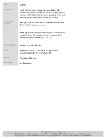 HASŁO kod QR DEFINICJA «kod, którego zapis składa się z kwadratowych ciemnych i jasnych modułów, zwykle odczytywany za pomocą telefonu komórkowego z aparatem cyfrowym, wyposażonego w specjalną aplikację; fotokod» PRZYKŁADY UŻYCIA Kod QR, w przeciwieństwie do kodu kreskowego, jest dwuwymiarowy (komputerswiat.pl). Kody QR obecnie najczęściej stosuje się w reklamach i gazetach, bo za ich pomocą można przekazać dużo więcej ciekawych informacji (carrefour.pl). WIZUALIZACJE Zobacz w grafice Google DATA Rejestracja hasła: 17.12.2015, 10.40, ostatnia aktualizacja hasła: 21.12.2015, 23.16 AUTOR Patrycjusz Pilawski REDAKTOR Jan Burzyński Copyright © Uniwersytet Warszawski Wszelkie prawa zastrzeżone zgodnie z art.17 ustawy z dnia 4 lutego 1994 r. o prawie autorskim i prawach pokrewnych. Teksty oraz zdjęcia zawarte w tym dokumencie nie mogą być publikowane bez wiedzy i zgody właściciela praw autorskich. Powered by TCPDF (www.tcpdf.org)