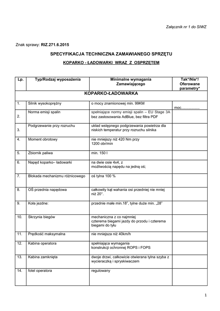 Załącznik nr 1 do SIWZ Znak sprawy: RIZ.271.6.2015 SPECYFIKACJA TECHNICZNA ZAMAWIANEGO SPRZĘTU KOPARKO - ŁADOWARKI WRAZ Z OSPRZĘTEM Lp. Typ/Rodzaj wyposażenia Minimalne wymagania Zamawiającego Tak*/Nie*/ Oferowane parametry* KOPARKO-ŁADOWARKA 1. Silnik wysokoprężny o mocy znamionowej min. 99KM Norma emisji spalin spełniające normy emisji spalin – EU Stage 3A bez zastosowania AdBlue, bez filtra PDF Podgrzewanie przy rozruchu układ wstępnego podgrzewania powietrza dla niskich temperatur przy rozruchu silnika 4. Moment obrotowy nie mniejszy niż 420 Nm przy 1200 obr/min 5. Zbiornik paliwa min. 150 l 6. Napęd koparko– ładowarki na dwie osie 4x4, z możliwością napędu na jedną oś; 7. Blokada mechanizmu różnicowego oś tylna 100 % 8. OŚ przednia napędowa całkowity kąt wahania osi przedniej nie mniej niż 20°. 9. Koła jezdne: przednie małe min.18”, tylne duże min. „28” 10. Skrzynia biegów mechaniczna z co najmniej czterema biegami jazdy do przodu i czterema biegami do tyłu 11. Prędkość maksymalna nie mniejsza niż 40km/h 12. Kabina operatora spełniająca wymagania konstrukcji ochronnej ROPS i FOPS 13. Kabina zamknięta dwoje drzwi, całkowicie otwierana tylna szyba z wycieraczką i spryskiwaczem 14. fotel operatora regulowany moc.................. 2. 3. 1 15. System wentylacji i ogrzewania otwierany wywietrznik dachowy, nagrzewnica 16. Układ hydrauliczny zasilany pompą wielotłoczkową o wydajności nie mniejszej niż 160 litr/min 17. System sterowania pomp - tensometryczny 18. Ciśnienie robocze układu hydraulicznego nie mniejsze niż 250bar 19. Stabilizatory tylne niezależne wysuwane hydraulicznie, sterowane niskim ciśnieniem 20 Głębokość kopania min. 5,90m 21. Maksymalna wysokość załadunku ładowarki min 3,00m i powyżej 22. Wysokość załadunku koparką min. 4.70m i powyżej 23. Sterowanie ramienia koparkowego za pomocą dźwigni mechanicznych 24. Ramię koparkowe o zmiennej długości, rozsuwane hydraulicznie (teleskopowe) 25. Sterowanie układem ładowarkowym 26. Siła skrawania łyżki koparkowej elementy sterownicze układu serwosterowania PPC 57kN i powyżej 27. Udźwig łyżki ładowarkowej na maksymalnej wysokości /......................... ......... 3000 kg i powyżej OSPRZĘT KOPARKO-ŁADOWARKI 28. Hydrauliczna linia 29. Łyżki koparki: pod młot i inne urządzenia robocze - jednokierunkowa szerokości 600 mm ± 20 mm skarpowa o szerokości 1500 mm ± 20mm trapezowa do rowów o kacie 60° 30. Szybkozłącze koparki i ładowarki min. mechaniczne 31. 08. 201 5 32. Łyżka ładowarkowa Wieloczynnościowa (możliwość spychania, ładowania, chwytania) min. 1m3 z widłami do palet Bezpieczeństwo układ stabilizujący załadowaną łyżkę/widły podczas jazdy 33. zawory bezpieczeństwa wysięgnika i ramienia, sygnalizacja przeciążenia 2 WYPOSAŻENIE DODATKOWE 34. Lampa sygnalizacyjna tzw. kogut pojedyncza pomarańczowa 35. Światła drogowe i wyposażenie zgodne z KRD 36. światła robocze halogenowe 2 przednie i 2 tylne 37. gaśnica, apteczka, trójkąt ostrzegawczy 38. Monitoring maszyny, bezprzewodowy niepłatny Dostawa maszyny do siedziby zamawiającego *w odpowiedniej pozycji należy postawić znak X - Okres gwarancji................................................................................................... - Częstotliwość przeglądów................................................................................... − Rok produkcji koparko-ładowarki ….................................................................... − Marka sprzętu …................................................................................................. ......................................... (miejscowość, data) ................................................................................. (podpis przedstawiciela Wykonawcy) 3