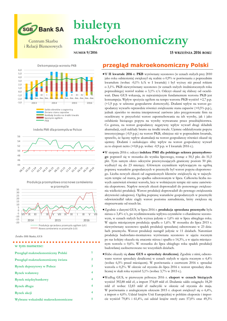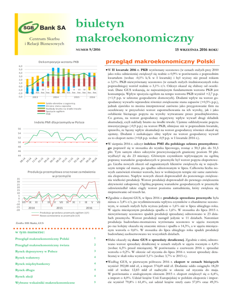 biuletyn makroekonomiczny Centrum Skarbu i Relacji Biznesowych NUMER 9/2016 przegląd makroekonomiczny Polski Dekompozycja wzrostu PKB 6,0 5,0 4,0 3,0 2,0 1,0 0,0 -1,0 -2,0 -3,0 W II kwartale 2016 r. PKB wyrównany sezonowo (w cenach stałych przy 2010 I II III IV I II III IV I II III IV I II kw. kw. kw. kw. kw. kw. kw. kw. kw. kw. kw. kw. kw. kw. 2013 2014 2015 2016 Saldo obrotów z zagranicą Zmiana stanu zapasów Nakłady brutto na środk i trwałe Spożycie ogółem PKB Indeks PMI dla przemysłu w Polsce 56 54 52 50 jako roku odniesienia) zwiększył się realnie o 0,9% w porównaniu z poprzednim kwartałem (wobec -0,1% k/k w I kwartale) i był wyższy niż przed rokiem o 3,1%. PKB niewyrównany sezonowo (w cenach stałych średniorocznych roku poprzedniego) wzrósł realnie o 3,1% r/r. Odczyt okazał się słabszy od oczekiwań. Dane GUS wskazują, że najważniejszym fundamentem wzrostu PKB jest konsumpcja. Wpływ spożycia ogółem na tempo wzrostu PKB wyniósł +2,7 p.p. (+1,9 p.p. w sektorze gospodarstw domowych). Dodatni wpływ na wzrost gospodarczy wywarło wprawdzie również zwiększenie stanu zapasów (+0,5% p.p.), jednak zjawisko to można interpretować zarówno jako przygotowanie firm na oczekiwany w przyszłości wzrost zapotrzebowania na ich wyroby, jak i jako osłabienie bieżącego popytu na wyroby wytwarzane przez przedsiębiorstwa. Co gorsza, na wzrost gospodarczy negatywny wpływ wywarł drugi składnik akumulacji, czyli nakłady brutto na środki trwałe. Ujemne oddziaływanie popytu inwestycyjnego (-0,9 p.p.) na wzrost PKB, silniejsze niż w poprzednim kwartale, sprawiło, że łączny wpływ akumulacji na wzrost gospodarczy również okazał się ujemny. Dodatni i zaskakująco silny wpływ na wzrost gospodarczy wywarł za to eksport netto (+0,8 p.p. wobec -0,9 p.p. w I kwartale 2016 r.). W sierpniu 2016 r. odczyt indeksu PMI dla polskiego sektora przemysłowe- 48 go poprawił się w stosunku do wyniku lipcowego, rosnąc z 50,3 pkt. do 51,5 pkt. Tym samym okres odczytów przewyższających graniczny poziom 50 pkt. wydłużył się do 23 miesięcy. Głównym czynnikiem wpływającym na ogólną poprawę warunków gospodarczych w przemyśle był wzrost popytu eksportowego. Liczba nowych zleceń od zagranicznych klientów zwiększyła się w najszybszym tempie od marca, po spadku odnotowanym w lipcu. Całkowita liczba nowych zamówień również wzrosła, lecz w wolniejszym tempie niż same zamówienia eksportowe. Napływ nowych zleceń doprowadził do ponownego zwiększenia wielkości produkcji. Wzrost produkcji doprowadził do pewnego zwiększenia aktywności zakupowej. Ogólną poprawę warunków gospodarczych w przemyśle odzwierciedlał także ciągły wzrost poziomu zatrudnienia, który zwiększa się nieprzerwanie od trzech lat. 46 44 35 30 25 20 15 10 5 0 -5 -10 -15 -20 15 WRZEŚNIA 2016 ROKU Produkcja przemysłowa oraz nowe zamówienia w przemyś le Zgodnie z danymi GUS, w lipcu 2016 r. produkcja sprzedana przemysłu była VII IX XI I III 2014 V VII IX XI 2015 I III V VII 2016 Produkcja sprzedana przemysłu ogółem (r/r) Nowe zamówienia w przemyśle (r/r) Źródło: IHS Markit, GUS w tym numerze: niższa o 3,4% r/r, po wyeliminowaniu wpływu czynników o charakterze sezonowym, w cenach stałych była wyższa jedynie o 1,6% niż w lipcu ubiegłego roku. W ujęciu miesięcznym produkcja spadła o 1,6%. W stosunku do lipca 2015 r. niewyrównany sezonowo spadek produkcji sprzedanej odnotowano w 23 działach przemysłu. Wzrost produkcji nastąpił jedynie w 11 działach. Natomiast produkcja budowlano-montażowa wyrównana sezonowo w ujęciu rocznym po raz kolejny okazała się znacznie niższa i spadła o 14,3%, a w ujęciu miesięcznym wzrosła o 0,6%. W stosunku do lipca ubiegłego roku spadek produkcji budowlanej zaobserwowano we wszystkich działach. Przegląd makroekonomiczny Polski 1 Słabe okazały się dane GUS o sprzedaży detalicznej. Zgodnie z nimi, odnoto- Przegląd makroekonomiczny świata 2 Rynek depozytowy w Polsce 3 Rynek walutowy 4 wano wzrost sprzedaży detalicznej w cenach stałych w ujęciu rocznym o 4,4% (wobec 6,5% przed miesiącem). W porównaniu z czerwcem 2016 r. sprzedaż wzrosła o 0,2%. W okresie od stycznia do lipca 2016 r. wzrost sprzedaży detalicznej w skali roku wyniósł 5,1% (wobec 3,7% w 2015 r.). Rynek międzybankowy 4 Rynek długu 4 Rynek akcji 4 Wybrane wskaźniki makroekonomiczne 5 Według GUS, w pierwszym półroczu 2016 r. eksport w cenach bieżących wyniósł 392,88 mld zł, a import 374,69 mld zł. Dodatnie saldo osiągnęło 18,20 mld zł wobec 12,83 mld zł nadwyżki w okresie od stycznia do maja. W porównaniu z analogicznym okresem 2015 r. eksport zwiększył się o 6,4%, a import o 4,0%. Udział krajów Unii Europejskiej w polskim eksporcie i imporcie wyniósł 79,8% i 61,4%, zaś udział krajów strefy euro 57,0% oraz 49,3% STR. 2 BIULETYN MAKROEKONOMICZNY Centrum Skarbu i Relacji Biznesowych (w tym udział Niemiec osiągnął odpowiednio są stabilne i rekordowo niskie. publicznych do PKB ma wynieść 53,5% 27,2% i 23,5%). W pierwszym półroczu 2016 na koniec 2016 r. oraz 54,9% w 2017 r. Defi Na wrześniowym posiedzeniu RPP zdecyr. wśród głównych partnerów handlowych cyt budżetowy może przekroczyć poziom 3% dowała o pozostawieniu podstawowych stóp Polski odnotowano wzrost eksportu PKB, jednak nastąpi to w warunkach prognoprocentowych NBP bez zmian. Rada podtrzydo wszystkich krajów z pierwszej dziesiątki. zowanej nadwyżki w jednostkach samorządu mała ocenę, że w świetle dostępnych danych terytorialnego. Deficyt sektora finansów pu Miesięczne dane NBP za lipiec wskazują i prognoz obecny poziom stóp procentowych blicznych ma wynieść w 2017 r. 2,9% PKB. jednak na pogorszenie sytuacji w handlu sprzyja utrzymaniu polskiej gospodarki Projekt budżetu sporządzono przyjmując, że zagranicznym. Deficyt wymiany handlowej na ścieżce zrównoważonego wzrostu tempo wzrostu gospodarczego wyni