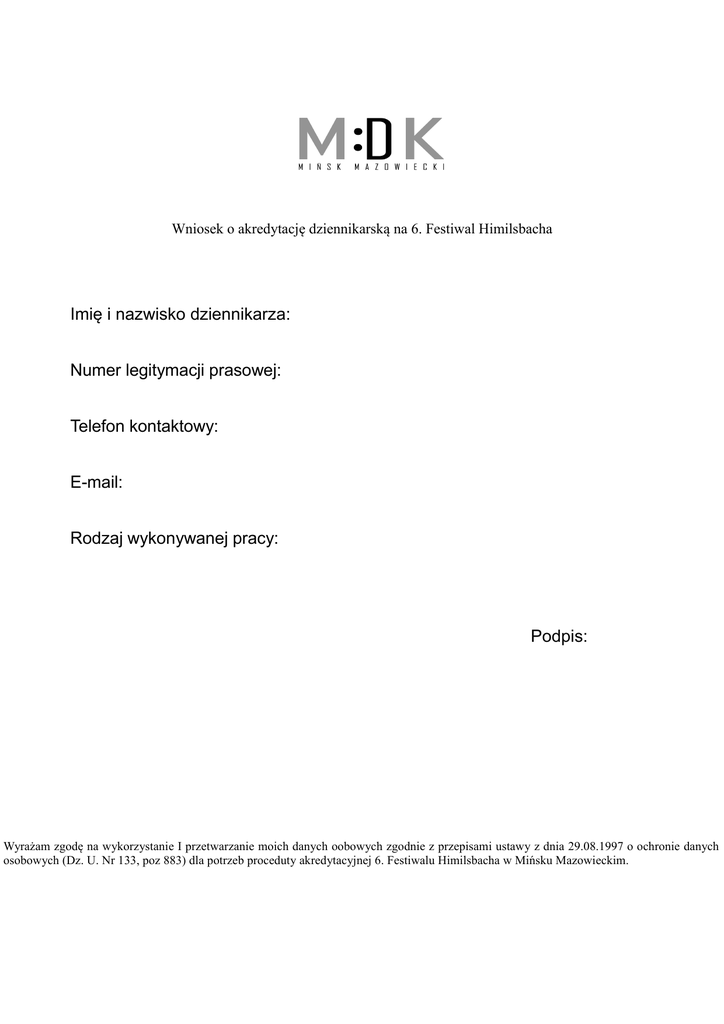 Wniosek o akredytację dziennikarską na 6. Festiwal Himilsbacha Imię i nazwisko dziennikarza: Numer legitymacji prasowej: Telefon kontaktowy: E-mail: Rodzaj wykonywanej pracy: Podpis: Wyrażam zgodę na wykorzystanie I przetwarzanie moich danych oobowych zgodnie z przepisami ustawy z dnia 29.08.1997 o ochronie danych osobowych (Dz. U. Nr 133, poz 883) dla potrzeb proceduty akredytacyjnej 6. Festiwalu Himilsbacha w Mińsku Mazowieckim.