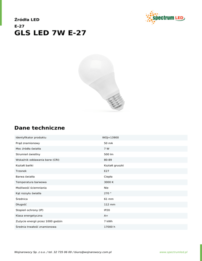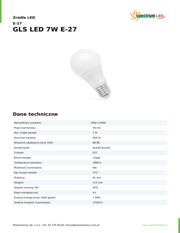Źródła LED E-27 GLS LED 7W E-27 Dane techniczne Identyfikator produktu WOJ+13900 Prąd znamionowy 50 mA Moc źródła światła 7W Strumień świetlny 500 lm Wskaźnik oddawania barw (CRI) 80-89 Kształt bańki Kształt gruszki Trzonek E27 Barwa światła Ciepła Temperatura barwowa 3000 K Możliwość ściemniania Nie Kąt rozsyłu światła 270 ° Średnica 61 mm Długość 112 mm Stopień ochrony (IP) IP20 Klasa energetyczna A+ Zużycie energii przez 1000 godzin 7 kWh Średnia trwałość znamionowa 17000 h Wojnarowscy Sp. z o.o. / tel. 32 735 06 00 / [email protected] www.spectrumled.pl Źródła LED E-27 GLS LED 7W E-27 Pozostałe zdjęcia: Wojnarowscy Sp. z o.o. / tel. 32 735 06 00 / [email protected] Powered by TCPDF (www.tcpdf.org) www.spectrumled.pl