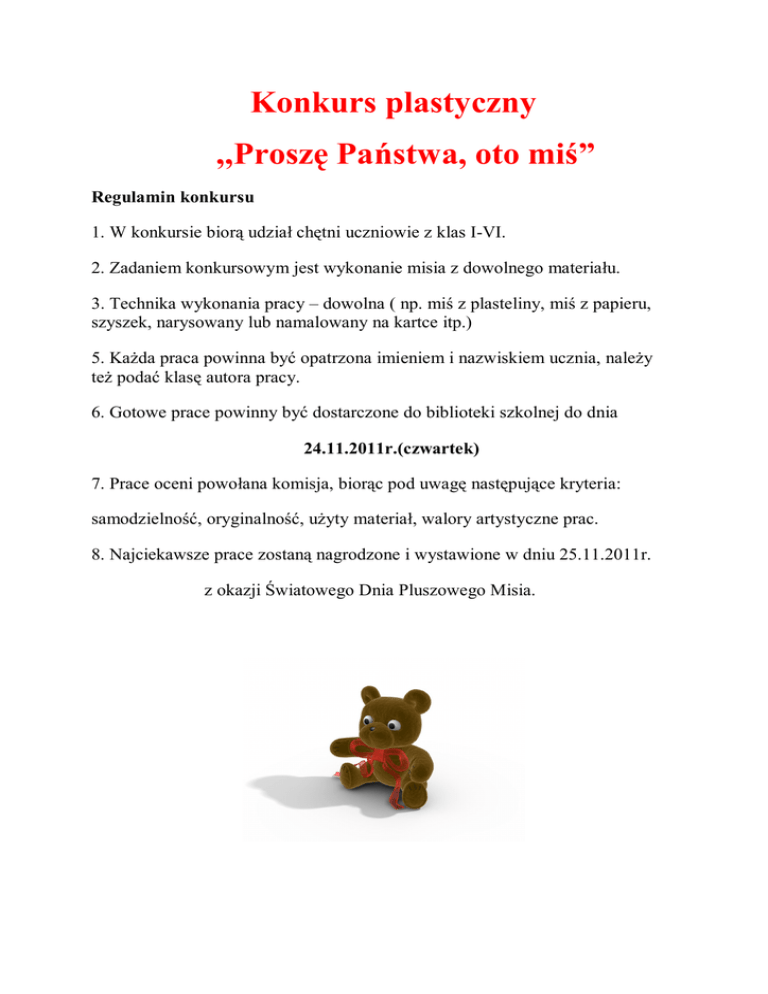 Konkurs plastyczny ,,Proszę Państwa, oto miś” Regulamin konkursu 1. W konkursie biorą udział chętni uczniowie z klas I-VI. 2. Zadaniem konkursowym jest wykonanie misia z dowolnego materiału. 3. Technika wykonania pracy – dowolna ( np. miś z plasteliny, miś z papieru, szyszek, narysowany lub namalowany na kartce itp.) 5. Każda praca powinna być opatrzona imieniem i nazwiskiem ucznia, należy też podać klasę autora pracy. 6. Gotowe prace powinny być dostarczone do biblioteki szkolnej do dnia 24.11.2011r.(czwartek) 7. Prace oceni powołana komisja, biorąc pod uwagę następujące kryteria: samodzielność, oryginalność, użyty materiał, walory artystyczne prac. 8. Najciekawsze prace zostaną nagrodzone i wystawione w dniu 25.11.2011r. z okazji Światowego Dnia Pluszowego Misia.