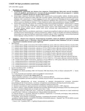 CZĘŚĆ III Opis przedmiotu zamówienia CPV 29221980 krążniki I. Przedmiot zamówienia: Przedmiotem zamówienia jest dostawa loco magazyny Zamawiającego fabrycznie nowych krążników stalowych gładkich, pierścieniowych i tarczowych do przenośników taśmowych pracujących w ciężkich warunkach w zakładzie górniczym wg specyfikacji SIWZ, 2. Zamawiający dopuszcza możliwość składania ofert częściowych na poszczególne zadania, określone poniżej. Każda oferta może obejmować jedno, kilka albo wszystkie zadania. Zamawiający dopuszcza ponadto możliwość składania ofert częściowych w ramach Zadania 4 (to jest ofert częściowych obejmujących poszczególne grupy krążników w ramach Zadania 4). Zamawiający nie dopuszcza składania ofert częściowych w ramach Zadań 1-3 (oferta częściowa składana na Zadania 1-3 musi obejmować pełny zakres przedmiotowy danego Zadania). 3. Zamawiający zastrzega sobie prawo do swobodnego wyboru poszczególnych krążników zamówionych w ramach umowy w ramach danego zadania, przy czym minimalna wartość netto krążników zamawianych w ramach umowy nie może być niższa, niż 30% maksymalnej wartości umowy netto (maksymalną wartość umowy netto w ramach danego zadania stanowi wartość netto oferty wybranej jako najkorzystniejsza w tym zadaniu) (dotyczy zadań 1-3). 4. Podany zakres ilościowy przedmiotu zamówienia w ramach poszczególnych zadań jest zakresem szacunkowym, określonym przez Zamawiającego z należytą starannością, jednak z uwagi na charakter prowadzonej działalności Zamawiający nie zapewnia realizacji zamówienia w pełnym zakresie. Ilości wynikające z rzeczywistych potrzeb Zamawiającego zostaną określone w zamówieniach okresowych -(dotyczy zadań 1-4). 1. II. 1. 2. 3. Zadanie 1 - Dostawa loco magazyny Zamawiającego krążników stalowych gładkich i pierścieniowych dla ciężkich warunków pracy w otoczeniu o dużym zapyleniu i prędkości taśmy minimum 3,15 m/s w strefach zagrożonych wybuchem metanu i pyłu węglowego Specyfikacja: 1.1. krążnik stalowy gładki wzmocniony Ø133x465x14xØ20 mm, piasty odlewane (żeliwne) lub kute, łożyska 6305, 1.2. krążnik stalowy gładki wzmocniony Ø133x670x14xØ20 mm, piasty odlewane (żeliwne) lub kute, łożyska 6305, 1.3. krążnik stalowy gładki wzmocniony, odciskowy ∅133x1150x14, piasty odlewane (żeliwne) lub kute 1.4. krążnik stalowy gładki wzmocniony, odciskowy ∅133x1400x14, piasty odlewane (żeliwne) lub kute, 1.5. krążnik stalowy gładki wzmocniony, odciskowy ∅133x850x20, piasty odlewane (żeliwne) lub kute, 1.6. krążnik stalowy gładki wzmocniony, odciskowy ∅133x1600x14, piasty odlewane (żeliwne) lub kute, 1.7. krążnik stalowy gładki wzmocniony, odciskowy ∅133x1050x22, piasty odlewane (żeliwne) lub kute, 1.8. krążnik stalowy gładki wzmocniony, odciskowy ∅133x1150x22 Lc 1260 piasty odlewane (żeliwne) lub kute, 1.9. krążnik stalowy gładki wzmocniony, odciskowy ∅133x1150x22 Lc 1310, piasty odlewane (żeliwne) lub kute, 1.10. krążnik stalowy gładki wzmocniony, odciskowy ∅133x1400x22 Lc 1450, piasty odlewane (żeliwne) lub kute 1.11. krążnik pierścieniowy wzmocniony Ø133x465x14xØ20 mm, 1.12. krążnik pierścieniowy wzmocniony Ø133x530x14xØ20 mm, 1.13. krążnik pierścieniowy wzmocniony Ø159x600x18xØ25 mm, 1.14. krążnik pierścieniowy wzmocniony Ø159x1800x18xØ25 mm. Łączna szacunkowa ilość - 22 800 szt. Wymagania techniczne: 3.1. Łożyska nie zakryte produkcji: SKF, FŁT Kraśnik, NSK Iskra Kielce, FAG, (w klasie wykonania PO z luzem C3 lub C4), 3.2. Cechy konstrukcyjne krążników stalowych gładkich wzmocnionych: - klasa dokładności wyważenia nie większa niż G 16, - płaszcz krążnika wykonany z rury o grubości płaszcza minimum 4,0 mm, - konstrukcja krążników powinna umożliwiać wymianę zużytych łożysk i uszczelnień poza zakładem wytwórcy, 3.3. Łożyska zabezpieczone od strony zewnętrznej co najmniej dwustopniowym systemem elementów uszczelniających lub równoważnym, a od strony wewnętrznej uszczelnieniem chroniącym przed utratą smaru, 3.4. Komory łożyskowe i komory uszczelnienia wypełnione smarem na bazie litu, 3.5. Komory uszczelnienia i puste przestrzenie uszczelnienia wypełnione smarem w 100% objętości, 3.6. Płaszcz stalowy i piasta krążnika zabezpieczone powłoką antykorozyjną gwarantującą skuteczną ochronę przed korozją w warunkach składowania na zewnątrz przez okres 1 roku, 3.7. Krążniki muszą być fabrycznie nowe i oznaczone na piastach (pierścieniowe oznaczone na części metalowej) w sposób trwały i widoczny, cechą producenta i datą produkcji (miesiąc/rok), 3.8. Sposób dostawy: w paczkach, foliowane na paletach, zaopatrzone w wywieszkę zawierającą: dane producenta, oznaczenie wyrobu oraz ilość asortymentu, 3.9. Krążniki muszą spełniać wymagania określone w następujących normach i aktach prawnych: - produkcja i badanie zgodnie z normą PN 91/M-46606 „Przenośniki taśmowe – Krążniki” lub PN-M-46606 wrzesień 2010 Przenośniki taśmowe Krążniki, - Ustawy z dn. 12 grudnia 2003 r. o ogólnym bezpieczeństwie produktów, 4. 5. 6. 7. 8. - Ustawy z dnia 9 czerwca 2011 r. ,,Prawo Geologiczne i górnicze” wraz z późniejszymi zmianami oraz wymagania zawarte w aktach wykonawczych wydanych z delegacji tej ustawy. Dostawa na podstawie zamówień okresowych, wymagany termin realizacji każdorazowego zamówienia okresowego: do 30 dni od otrzymania zamówienia. Wymagany okres gwarancji jakości: minimum 30 miesięcy od daty dostawy, przy czym dostarczany wyrób musi być wyprodukowany nie wcześniej niż 3 miesiące przed datą dostawy. Okres dostaw 12 miesięcy od dnia zawarcia umowy. Dostawca (producent) powinien posiadać wdrożony i stosowany system zapewnienia jakości zapewniający stały poziom jakości wyrobów potwierdzony odpowiednimi dokumentami. W celu potwierdzenia, że oferowane krążniki spe