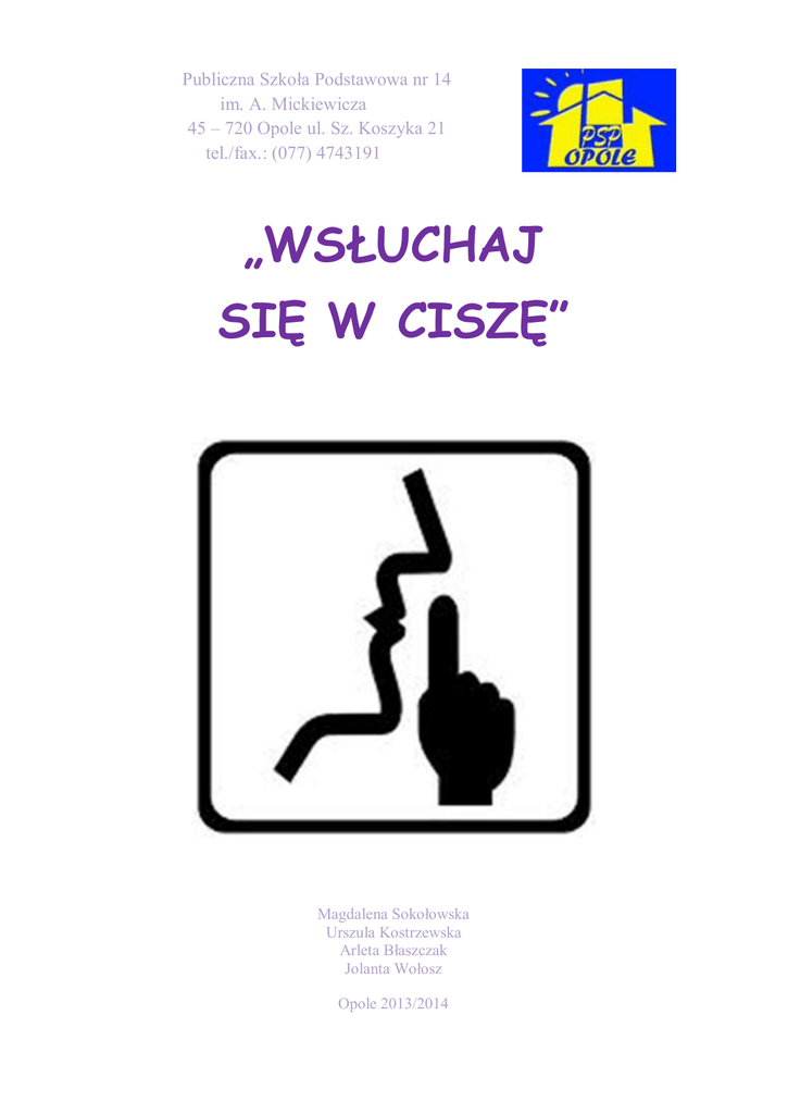 Publiczna Szkoła Podstawowa nr 14 im. A. Mickiewicza 45 – 720 Opole ul. Sz. Koszyka 21 tel./fax.: (077) 4743191 „WSŁUCHAJ SIĘ W CISZĘ” Magdalena Sokołowska Urszula Kostrzewska Arleta Błaszczak Jolanta Wołosz Opole 2013/2014 Zespół projektowy: Magdalena Sokołowska Urszula Kostrzewska Arletta Błaszczak Jolanta Wołosz Jolanta Pytlik Miejsce realizacji projektu: Publiczna Szkoła Podstawowa nr 14 im. Adama Mickiewicz 45-720 Opole ul. Koszyka 21 tel./fax (077) 474-31-91 zadania projektowe będą się koncentrowały wokół najbliższego otoczenia szkoły, Okres realizacji projektu: rok szkolny 2013/2014 Odbiorcy projektu: uczniowie z klas I-III uczęszczający do świetlicy szkolnej Sekcje projektu: Wsłuchaj się w siebie (zajęcia z elementami jogi, relaksacji, medytacji oraz kinezjologii edukacyjnej) – Magdalena Sokołowska Malownicza cisza (zajęcia plastyczne z elementami arteterapii) – Jolanta Kuliś Relaks z muzyką – (zajęcia muzyczno – ruchowe) Arletta Błaszczak, Jolanta Pytlik Bajko relaks – (zajęcia bajko terapii) Urszula Kostrzewska WSTĘP Hałas ma ogromny wpływ na zdrowie. W hałasie nauka jest bardzo trudna, niekiedy wręcz niemożliwa. Hałas przyczynia się do znacznego zmniejszenia koncentracji uwagi podczas nauki, a także do zmęczenia umysłowego dziecka. Zmęczenie to spowodowane jest przede wszystkim wzrostem napięcia nerwowego podczas nauki w hałasie. Dzieci przebywające w hałasie, nie potrafią skupić się na nauce. Mają ogromne trudności ze zrozumieniem oraz zapamiętaniem tego co przeczytali. Postanowiliśmy temu zapobiec realizując w świetlicy projekt edukacyjny „Wsłuchaj się w ciszę”. CELE PROJEKTU Głównym celem projektu jest relaksacja pozwalająca na odreagowanie napięć, niepowodzeń i agresji. W ramach celu głównego wyodrębniono następujące cele szczegółowe: integracja grupy podczas zabaw relaksacyjnych, wspólne spędzanie czasu wolnego w cichy sposób podczas pracy twórczej i zabawy, kształtowanie zdolności manualnych i ruchowych, wyobraźni i twórczego myślenia, wykorzystanie form plastycznych w celu wyrażenia uczuć własnych, podnoszenie poziomu samoakceptacji, wspomaganie dziecka mającego problemy z nawiązywaniem kontaktów interpersonalnych, wszechstronny rozwój ucznia, przyczynianie się do zmiany niepożądanych zachowań, rozwijanie wyobraźni dzieci, rozwijanie umiejętności słuchania języka literackiego i posługiwania się nim. METODY I FORMY Elementem decydującym o efektywności realizowanego projektu jest odpowiedni dobór metod i technik pracy, umożliwiający dzieciom aktywne uczestnictwo w życiu grupy. W związku z tym zastosowane w trakcie zajęć metody będą zindywidualizowane i dostosowane do: grupy wiekowej dzieci, ich możliwości i zdolności, celów danej pracy, rodzaju zajęć. Efektywności podjętych działań sprzyja zastosowanie metod pobudzających do ekspresji twórczej, opierających się na obserwacji i specyficznych czynnościach praktycznych. W pracy świetlicy dominują metody czynne (oparte na działaniach dziecka), słowne (np. objaśnienie, instrukcje, polecenia, pochwały) oraz oglądowe (np. pokazy, prezentacje, widowiska). Dobór metod został oparty na doświadczeniu wynikającym z pracy pedagogiczno- wychowawczej oraz wiadomościach i umiejętnościach pozyskanych w drodze doskonalenia zawodowego. W trakcie zajęć zostaną wykorzystane następujące metody i techniki: wykład, jako podstawa metoda pokazu angażująca wzrok, dotyk, i inne zmysły, obserwacja angażująca wzrok, wyobraźnię, spostrzegawczość, pogadanka umożliwiająca kontakt informacyjny nauczyciela z uczniem, eksperyment umożliwiający poszukiwanie różnorodnych rozwiązań plastycznych, praktyczne działania polegające na projektowaniu, modelowaniu, kopiowaniu, filmy, prezentacje multimedialne, masaż relaksacyjny, muzyka relaksacyjna, słuchowiska, bajki relaksacyjne, opowiadania, metoda aktywnego słuchania muzyki według Batii Strauss, małe formy teatralne (scenki dramowe, pantomima, teatrzyk cieni, teatr lalek – pacynki) trening autogenny wg. Anny Polender, techniki relaksacji wg. Jacobsona, joga Formy pracy: indywidualna, zbiorowa, grupowa. EWALUACJA PROJEKTU: Podstawą do oceny efektów pracy w trakcie projektu „Wsłuchajmy się w ciszę” będzie obserwowanie zachowań uczniów. Szczególną uwagą zostaną otoczeni uczniowie nadpobudliwi, nieśmiali i lękliwi. Ewaluacja zostanie dokonana na podstawie wniosków z wywiadów i ankiet przeprowadzonych wśród uczniów i rodziców. Zostaną one przeprowadzone na początku i na zakończenie realizacji niniejszego projektu. Zainteresowanie dzieci będzie stanowiło istotną informację zwrotną dotyczącą atrakcyjności zajęć. Realizacja projektu „Wsłuchajmy się w ciszę” będzie na bieżąco dokumentowana poprzez: publikację zdjęć na stronie internetowej szkoły i w kronice świetlicy, zapisy w dziennikach wychowawców, wystawę prac plastycznych, informacje w gablocie na holu szkoły. Wnioski oraz spostrzeżenia pomogą w planowaniu dalszych działań, zostaną opracowane w formie sprawozdania. PRZEWIDYWANE EFEKTY: Realizacja projektu ma przynieść pozytywne zmiany w zakresie wyciszenia organizmu oraz umiejętności stosowania ćwiczeń relaksacyjnych oraz oddechowych pozwalających na odreagowanie napięć, niepowodzeń i agresji. Dzięki różnorodnym działaniom, nastąpi: wzrost własnej kreatywności; obniżenie napięcia nerwowego, wyciszenie; tworzenie pozytywnych nawyków i relacji w grupie; podwyższenie samooceny i samoakceptacji; rozwinięcie wrażliwości na potrzeby innych ludzi; poznanie różnorodnych technik relaksacyjnych; integracja grupy podczas zabaw relaksacyjnych; wspólne spędzanie czasu wolnego w cichy sposób podczas pracy twórczej i zabawy; DOKUMENTOWANIE DZIAŁAŃ: Działania podejmowane w ramach projektu „Wsłuchaj się w ciszę” będą nieustannie dokumentowane,
