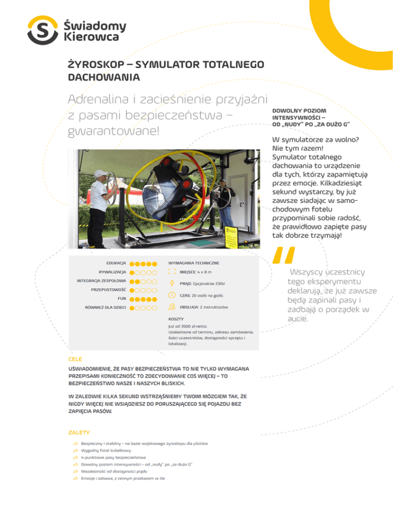 ŻYROSKOP – SYMULATOR TOTALNEGO DACHOWANIA Adrenalina i zacieśnienie przyjaźni z pasami bezpieczeństwa – gwarantowane! DOWOLNY POZIOM INTENSYWNOŚCI – OD „NUDY” PO „ZA DUŻO G” W symulatorze za wolno? Nie tym razem! Symulator totalnego dachowania to urządzenie dla tych, którzy zapamiętują przez emocje. Kilkadziesiąt sekund wystarczy, by już zawsze siadając w samochodowym fotelu przypominali sobie radość, że prawidłowo zapięte pasy tak dobrze trzymają! Wszyscy uczestnicy tego eksperymentu deklarują, że już zawsze będą zapinali pasy i zadbają o porządek w aucie.