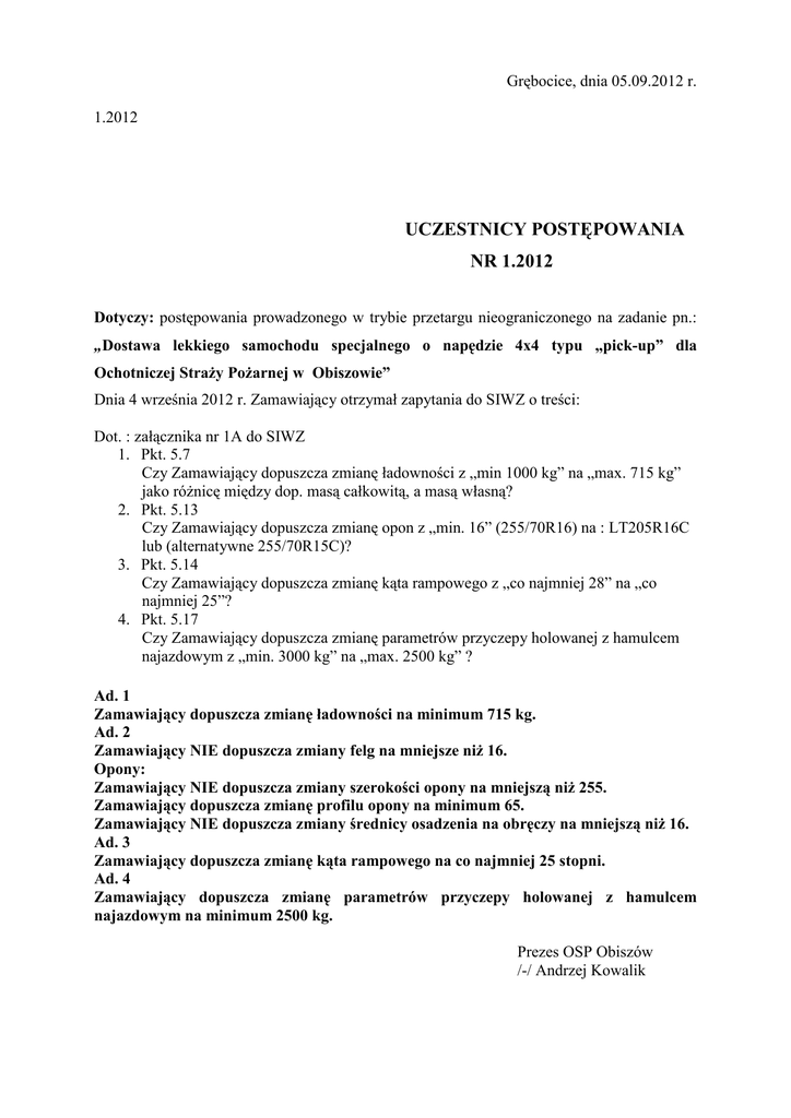 Grębocice, dnia 05.09.2012 r. 1.2012 UCZESTNICY POSTĘPOWANIA NR 1.2012 Dotyczy: postępowania prowadzonego w trybie przetargu nieograniczonego na zadanie pn.: „Dostawa lekkiego samochodu specjalnego o napędzie 4x4 typu „pick-up” dla Ochotniczej Straży Pożarnej w Obiszowie” Dnia 4 września 2012 r. Zamawiający otrzymał zapytania do SIWZ o treści: Dot. : załącznika nr 1A do SIWZ 1. Pkt. 5.7 Czy Zamawiający dopuszcza zmianę ładowności z „min 1000 kg” na „max. 715 kg” jako różnicę między dop. masą całkowitą, a masą własną? 2. Pkt. 5.13 Czy Zamawiający dopuszcza zmianę opon z „min. 16” (255/70R16) na : LT205R16C lub (alternatywne 255/70R15C)? 3. Pkt. 5.14 Czy Zamawiający dopuszcza zmianę kąta rampowego z „co najmniej 28” na „co najmniej 25”? 4. Pkt. 5.17 Czy Zamawiający dopuszcza zmianę parametrów przyczepy holowanej z hamulcem najazdowym z „min. 3000 kg” na „max. 2500 kg” ? Ad. 1 Zamawiający dopuszcza zmianę ładowności na minimum 715 kg. Ad. 2 Zamawiający NIE dopuszcza zmiany felg na mniejsze niż 16. Opony: Zamawiający NIE dopuszcza zmiany szerokości opony na mniejszą niż 255. Zamawiający dopuszcza zmianę profilu opony na minimum 65. Zamawiający NIE dopuszcza zmiany średnicy osadzenia na obręczy na mniejszą niż 16. Ad. 3 Zamawiający dopuszcza zmianę kąta rampowego na co najmniej 25 stopni. Ad. 4 Zamawiający dopuszcza zmianę parametrów przyczepy holowanej z hamulcem najazdowym na minimum 2500 kg. Prezes OSP Obiszów /-/ Andrzej Kowalik