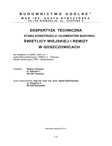 B U D O W N I C T W O M G R I N ś . A G A T A 49-100 NIEMODLIN O G Ó L N E ” R Y B C Z Y Ń S K A UL. CHOPINA 9 EKSPERTYZA TECHNICZNA STANU KONSTRUKCJI I ELEMENTÓW BUDYNKU ŚWIETLICY WIEJSKIEJ I REMIZY W GOSZCZOWICACH Na działkach nr 248/8 i 249 k.m. 1 Jednostka ewidencyjna: 160912_2 , Tułowice Obręb ewidencyjny: 0001- Goszczowice Inwestor: Gmina Tułowice ul. Szkolna 1 49-130 Tułowice Autor opracowania: mgr inŜ. bud. inŜ. arch. Agata Rybczyńska, ul. Chopina 9, 49-100 Niemodlin Niemodlin sierpień 2013 r. 2.13 EKSPERTYZA TECHNICZNA STANU KONSTRUKCJI I ELEMENTÓW BUDYNKU ŚWIETLICY WIEJSKIEJ I REMIZY W GOSZCZOWICACH Na działkach nr 248/8 i 249 k.m. 1 Jednostka ewidencyjna: 160912_2 , Tułowice Obręb ewidencyjny: 0001- Goszczowice Inwestor: Gmina Tułowice ul. Szkolna 1 49-130 Tułowice Autor opracowania: mgr inŜ. bud. inŜ. arch. Agata Rybczyńska, ul. Chopina 9, 49-100 Niemodlin 1. Przedmiot ekspertyzy Przedmiotem ekspertyzy jest niepodpiwniczony, parterowy budynek świetlicy wiejskiej i remizy straŜackiej na działkach nr 248/8 i 249 w Goszczowicach. Pomieszczenia były przeznaczone na pomieszczenie świetlicy z zapleczem i węzłem sanitarnym oraz garaŜowym pomieszczeniem remizy. Pomieszczenia te funkcjonowały wspólnie. Istniejący budynek powstał w latach 70-tych XX wieku wg projektu typowego na planie prostokąta, jednokondygnacyjny, w konstrukcji Ŝelbetowej słupowo- ryglowej poddawanej wcześniej przebudowie. Planowane jest przywrócenie funkcji garaŜu pomieszczeniu parteru oraz rozbudowa budynku o klatkę schodową i pomieszczenie dla OSP oraz nadbudowa części budynku poddaszem uŜytkowym, w którym będzie się znajdowała sala świetlicy z zapleczem. Budynek został zbudowany w konstrukcji Ŝelbetowej, prefabrykowanej ze stropodachem płaskim z płyt korytkowych. Wypełnienie szkieletu murem. Pierwotnie z 2 garaŜami, z których jeden został przekształcony na świetlicę, a drugi wydłuŜony. 2. Cel ekspertyzy Ekspertyzę sporządza się w celu stwierdzenia moŜliwości przeprowadzenia przebudowy, rozbudowy i nadbudowy budynku oraz zmiany sposobu uŜytkowania istniejących pomieszczeń. 3. Podstawa opracowania Oceny dokonano na podstawie wizji lokalnej oraz pomiarów inwentaryzacyjnych. 4. Ocena Stwierdza się co następuje: • Ściany fundamentowe bez rys i spękań • Mury zewnętrzne pokryte w dobrym stanie, bez widocznych rys. 2.14 • Ściany nośne wewnętrzne w dobrym stanie, bez widocznych rys, pęknięć oraz odchyleń od pionu • Strop nad piwnicą w dobrym stanie- bez widocznych rys, pęknięć i ugięć • Stropodach płaski Ŝelbetowy z płyt korytkowych w dobrym stanie bez widocznych rys, pęknięć i ugięć • Pokrycie dachowe z papy w stanie dobrym, • Obróbki blacharskie, rynny i rury spustowe- w stanie dobrym, • Kominy spalinowe i wentylacyjne w części ponad dachem w stanie dobrym • Obróbki blacharskie, rynny i rury spustowe -w stanie złym. • Stolarka okienna plastikowa – w stanie dobrym, • Drzwi zewnętrzne i bramy w stanie dobrym. • W pomieszczeniu świetlicy stwierdza się ślady zawilgocenia na ścianach zewnętrznych. 5. Wnioski Na podstawie przeprowadzonych obserwacji i pomiarów inwentaryzacyjnych sformułowano następujące wnioski: • Stan podłoŜa gruntowego, fundamentów oraz elementów konstrukcyjnych i nośnych budynku jest dobry zgodnie z opinią geotechniczną. • Posadowienie budynku na warstwach piasków średnich, brak stwierdzonej obecności wód gruntowych do głębokości 3,0 m • Pokrycie dachowe i obróbki blacharskie w stanie dobrym. • Istniejąca konstrukcja słupowo-ryglowa budynku, po wzmocnieniu jest w stanie przenieść dodatkowe obciąŜenie uŜytkowe na poddaszu • Istniejąca konstrukcja stropodachu z płytek korytkowych nie jest w stanie przenieść projektowanych obciąŜeń uŜytkowych na poddaszu. • Zniszczenie tynków i cegieł ściany zewnętrznej zabudowanego balkonu na • Izolacyjność cieplna ścian budynku jest wystarczająca, • Wentylacja grawitacyjna pomieszczeń parteru nie działa prawidłowo, szczelne okna plastikowe nie zapewniają dopływu wystarczającej ilości powietrza. W wyniku przeprowadzonych analiz stwierdza się co następuje: • Nośność elementów konstrukcji fundamentów, słupów, rygli, ścian nośnych oraz stan podłoŜa gruntowego są wystarczające, a projektowane zmiany wynikające z przebudowy, nadbudowy i rozbudowy budynku są moŜliwe po wzmocnieniu istniejącej konstrukcji. • Istniejący stropodach nie moŜe być wykorzystany konstrukcyjnie na planowane obciąŜenia uŜytkowe • Rozbudowę naleŜy zdylatować od istniejącego obiektu, a łączące elementy konstrukcyjne montować na warstwach poślizgowych, 2.15 • Zaleca się usprawnienie wentylacji pomieszczeń parteru i poddasza przez montaŜ higronawiewników w istniejących i projektowanych oknach oraz montaŜ wentylacji grawitacyjnej w pomieszczeniach z oknami oraz mechanicznej w pomieszczeniach bez okien • Budynek nadaje się do przeprowadzenia w nim planowanych robót budowlanych. 2.16