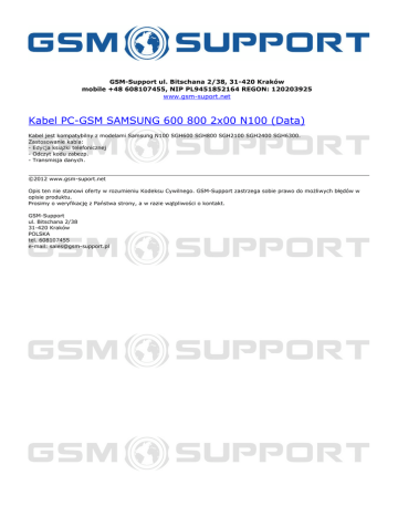GSM-Support ul. Bitschana 2/38, 31-420 Kraków mobile +48 608107455, NIP PL9451852164 REGON: 120203925 www.gsm-suport.net Kabel PC-GSM SAMSUNG 600 800 2x00 N100 (Data) Kabel jest kompatybilny z modelami Samsung N100 SGH600 SGH800 SGH2100 SGH2400 SGH6300. Zastosowanie kabla: - Edycja książki telefonicznej - Odczyt kodu zabezp. - Transmisja danych. ©2012 www.gsm-suport.net Opis ten nie stanowi oferty w rozumieniu Kodeksu Cywilnego. GSM-Support zastrzega sobie prawo do możliwych błędów w opisie produktu. Prosimy o weryfikację z Państwa strony, a w razie wątpliwości o kontakt. GSM-Support ul. Bitschana 2/38 31-420 Kraków POLSKA tel. 608107455 e-mail: [email protected] Powered by TCPDF (www.tcpdf.org)