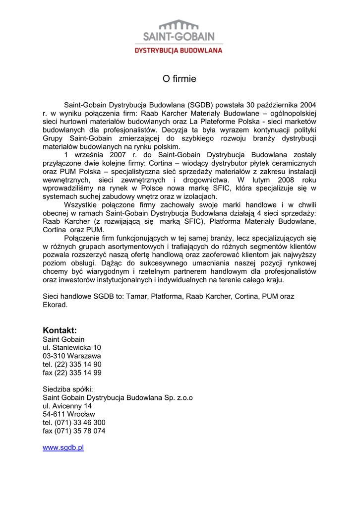 O firmie Saint-Gobain Dystrybucja Budowlana (SGDB) powstała 30 października 2004 r. w wyniku połączenia firm: Raab Karcher Materiały Budowlane – ogólnopolskiej sieci hurtowni materiałów budowlanych oraz La Plateforme Polska - sieci marketów budowlanych dla profesjonalistów. Decyzja ta była wyrazem kontynuacji polityki Grupy Saint-Gobain zmierzającej do szybkiego rozwoju branŜy dystrybucji materiałów budowlanych na rynku polskim. 1 września 2007 r. do Saint-Gobain Dystrybucja Budowlana zostały przyłączone dwie kolejne firmy: Cortina – wiodący dystrybutor płytek ceramicznych oraz PUM Polska – specjalistyczna sieć sprzedaŜy materiałów z zakresu instalacji wewnętrznych, sieci zewnętrznych i drogownictwa. W lutym 2008 roku wprowadziliśmy na rynek w Polsce nowa markę SFIC, która specjalizuje się w systemach suchej zabudowy wnętrz oraz w izolacjach. Wszystkie połączone firmy zachowały swoje marki handlowe i w chwili obecnej w ramach Saint-Gobain Dystrybucja Budowlana działają 4 sieci sprzedaŜy: Raab Karcher (z rozwijającą się marką SFIC), Platforma Materiały Budowlane, Cortina oraz PUM. Połączenie firm funkcjonujących w tej samej branŜy, lecz specjalizujących się w róŜnych grupach asortymentowych i trafiających do róŜnych segmentów klientów pozwala rozszerzyć naszą ofertę handlową oraz zaoferować klientom jak najwyŜszy poziom obsługi. DąŜąc do sukcesywnego umacniania naszej pozycji rynkowej chcemy być wiarygodnym i rzetelnym partnerem handlowym dla profesjonalistów oraz inwestorów instytucjonalnych i indywidualnych na terenie całego kraju. Sieci handlowe SGDB to: Tamar, Platforma, Raab Karcher, Cortina, PUM oraz Ekorad. Kontakt: Saint Gobain ul. Staniewicka 10 03-310 Warszawa tel. (22) 335 14 90 fax (22) 335 14 99 Siedziba spółki: Saint Gobain Dystrybucja Budowlana Sp. z.o.o ul. Avicenny 14 54-611 Wrocław tel. (071) 33 46 300 fax (071) 35 78 074 www.sgdb.pl