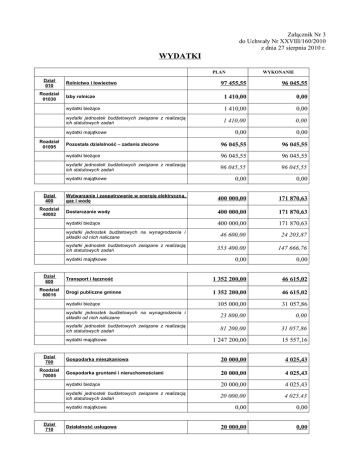 Załącznik Nr 3 do Uchwały Nr XXVIII/160/2010 z dnia 27 sierpnia 2010 r. WYDATKI PLAN Dział 010 Rozdział 01030 97 455,55 96 045,55 Izby rolnicze 1 410,00 0,00 wydatki bieżące 1 410,00 0,00 wydatki jednostek budżetowych związane z realizacją ich statutowych zadań 1 410,00 0,00 0,00 0,00 Pozostała działalność – zadania zlecone 96 045,55 96 045,55 wydatki bieżące 96 045,55 96 045,55 wydatki jednostek budżetowych związane z realizacją ich statutowych zadań 96 045,55 96 045,55 0,00 0,00 Wytwarzanie i zaopatrywanie w energię elektryczną, gaz i wodę 400 000,00 171 870,63 Dostarczanie wody 400 000,00 171 870,63 wydatki bieżące 400 000,00 171 870,63 wydatki jednostek budżetowych na wynagrodzenia i składki od nich naliczane 46 600,00 24 203,87 wydatki jednostek budżetowych związane z realizacją ich statutowych zadań 353 400,00 147 666,76 0,00 0,00 Transport i łączność 1 352 200,00 46 615,02 Drogi publiczne gminne 1 352 200,00 46 615,02 105 000,00 31 057,86 wydatki jednostek budżetowych na wynagrodzenia i składki od nich naliczane 23 800,00 0,00 wydatki jednostek budżetowych związane z realizacją ich statutowych zadań 81 200,00 31 057,86 1 247 200,00 15 557,16 Gospodarka mieszkaniowa 20 000,00 4 025,43 Gospodarka gruntami i nieruchomościami 20 000,00 4 025,43 wydatki bieżące 20 000,00 4 025,43 wydatki jednostek budżetowych związane z realizacją ich statutowych zadań 20 000,00 4 025,43 0,00 0,00 20 000,00 0,00 Rolnictwo i łowiectwo wydatki majątkowe Rozdział 01095 wydatki majątkowe Dział 400 Rozdział 40002 wydatki majątkowe Dział 600 Rozdział 60016 wydatki bieżące wydatki majątkowe Dział 700 Rozdział 70005 wydatki majątkowe Dział 710 WYKONANIE Działalność usługowa Rozdział 71004 Plany zagospodarowania przestrzennego 20 000,00 0,00 wydatki bieżące 20 000,00 0,00 wydatki jednostek budżetowych związane z realizacją ich statutowych zadań 20 000,00 0,00 0,00 0,00 1 605 967,00 775 463,56 Urzędy wojewódzkie – zadania zlecone 72 486,00 39 032,00 wydatki bieżące 72 486,00 39 032,00 wydatki jednostek budżetowych na wynagrodzenia i składki od nich naliczane 69 486,00 37 532,00 wydatki jednostek budżetowych związane z realizacją ich statutowych zadań 3 000,00 1 500,00 0,00 0,00 Starostwa powiatowe 10 000,00 0,00 wydatki bieżące 10 000,00 0,00 dotacje na zadania bieżące 10 000,00 0,00 0,00 0,00 Rady gmin (miast i miast na prawach powiatu) 65 000,00 30 572,60 wydatki bieżące 65 000,00 30 572,60 3 000,00 557,60 62 000,00 30 015,00 0,00 0,00 Urzędy gmin (miast i miast na prawach powiatu) 1 411 110,00 670 528,76 wydatki bieżące 1 411 110,00 670 528,76 wydatki jednostek budżetowych na wynagrodzenia i składki od nich naliczane 1 169 150,00 537 322,95 wydatki jednostek budżetowych związane z realizacją ich statutowych zadań 241 960,00 133 205,81 0,00 0,00 Promocja jednostek samorządu terytorialnego 30 036,00 19 418,30 wydatki bieżące 30 036,00 19 418,30 wydatki jednostek budżetowych związane z realizacją ich statutowych zadań 30 036,00 19 418,30 0,00 0,00 17 335,00 15 911,90 wydatki bieżące 2 530,00 1 107,20 świadczenia na rzecz osób fizycznych 2 530,00 1 107,20 wydatki majątkowe 14 805,00 14 804,70 Urzędy naczelnych organów władzy państwowej, kontroli i ochrony prawa oraz sądownictwa 12 957,00 5 904,81 wydatki majątkowe Dział 750 Rozdział 75011 Administracja publiczna wydatki majątkowe Rozdział 75020 wydatki majątkowe Rozdział 75022 wydatki jednostek budżetowych związane z realizacją ich statutowych zadań świadczenia na rzecz osób fizycznych wydatki majątkowe Rozdział 75023 wydatki majątkowe Rozdział 75075 wydatki majątkowe Rozdział 75095 Dział 751 Pozostała działalność Rozdział 75101 Urzędy naczelnych organów władzy państwowej, kontroli i ochrony prawa – zadania zlecone 744,00 372,00 wydatki bieżące 744,00 372,00 wydatki jednostek budżetowych na wynagrodzenia i składki od nich naliczane 744,00 372,00 0,00 0,00 Wybory Prezydenta Rzeczypospolitej Polskiej – zadania zlecone 12 213,00 5 532,81 wydatki bieżące wydatki majątkowe Rozdział 75107 12 213,00 5 532,81 wydatki jednostek budżetowych na wynagrodzenia i składki od nich naliczane 2 140,83 0,00 wydatki jednostek budżetowych związane z realizacją ich statutowych zadań 3 322,17 2 157,81 świadczenia na rzecz osób fizycznych 6 750,00 3 375,00 0,00 0,00 Bezpieczeństwo publiczne i ochrona przeciwpożarowa 210 200,00 126 677,61 Ochotnicze straże pożarne 198 900,00 126 677,61 wydatki bieżące 138 900,00 77 187,43 wydatki jednostek budżetowych na wynagrodzenia i składki od nich naliczane 33 000,00 16 857,46 wydatki jednostek budżetowych związane z realizacją ich statutowych zadań 105 900,00 60 329,97 60 000,00 49 490,18 Obrona cywilna – zadania zlecone 1 300,00 0,00 wydatki bieżące 1 300,00 0,00 wydatki jednostek budżetowych związane z realizacją ich statutowych zadań 1 300,00 0,00 0,00 0,00 Zarządzanie kryzysowe 10 000,00 0,00 wydatki bieżące 10 000,00 0,00 wydatki jednostek budżetowych związane z realizacją ich statutowych zadań 10 000,00 0,00 0,00 0,00 Dochody od osób prawnych, od osób fizycznych i od innych jednostek nieposiadających osobowości prawnej oraz wydatki związane z ich poborem 16 000,00 7 934,00 Pobór podatków, opłat i niepodatkowych należności budżetowych 16 000,00 7 934,00 wydatki bieżące 16 000,00 7 934,00 wydatki jednostek budżetowych na wynagrodzenia i składki od nich naliczane 16 000,00 7 934,00 0,00 0,00 Obsługa długu publicznego 60 000,00 21 096,52 Obsługa papierów wartościowych, kredytów i pożyczek jednostek samorządu terytorialnego 60 000,00 21 096,52 wydatki majątkowe Dział 754 Rozdział 75412 wydatki majątkowe Rozdział 75414 wydatki majątkowe Rozdział 75421 wydatki majątkowe Dział 756 Rozdział 75647 wydatki majątkowe Dział 757 Rozdział 75702 Dział 758 Rozdział 75818 wydatki bieżące 60 000,00 21 096,52 obsługa długu 60 