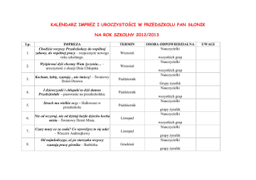 KALENDARZ IMPREZ I UROCZYSTOŚCI W PRZEDSZKOLU PAN SŁONIK NA ROK SZKOLNY 2012/2013 Lp. 1. 2. 3. 4. 5. 6. 7. 8. IMPREZA Chodźcie wszyscy Przedszkolacy do wspólnej zabawy, do wspólnej pracy – rozpoczęcie nowego roku szkolnego. TERMIN Wrzesień wszystkich grup Nauczycielki Wyśpiewać dziś chcemy Wam życzenia… – uroczystość z okazji Dnia Chłopaka Wrzesień Kocham, lubię, szanuję…nie śmiecę! – Światowy Dzień Drzewa Październik I dziewczynki i chłopaki to dziś dumne Przedszkolaki - pasowanie na przedszkolaka. Październik Strach ma wielkie oczy – Halloween w przedszkolu Październik Nie od wczoraj, nie od dzisiaj każde dziecko kocha misia – Światowy Dzień Misia. Listopad Czary mary co za cuda? Co wywróżysz to się uda! – Wieczór Andrzejkowy Listopad Od najmłodszego, aż po starszaka wszyscy szanują pracę górnika – Barbórka OSOBA ODPOWIEDZIALNA Nauczycielki wszystkich grup Nauczycielki Grypy żyrafek Nauczycielki wszystkich grup Nauczycielki grupy żyrafek Nauczycielki wszystkich grup Nauczycielki grupy żyrafek Nauczycielki Grudzień grupy żyrafek UWAGI 9. 10. 11. 12. 13. 14. 15. 16. 17. 18. Nauczycielki Idą Mikołajki, będą prezenty jak z bajki – Mikołajki Grudzień Hej kolęda, kolęda – jasełka, świąteczne spotkanie z rodzicami, Grudzień Prócz Mamusi i tatusia kocham Babcie i Dziadziusia - Dzień Babci i Dziadka Styczeń Karnawałowy czas do zabaw zaprasza nas- bal karnawałowy Luty Za oknami biało i zimowo, u nas smacznie i pączkowo – pieczemy pączki Luty Mamy dzisiaj Walentynki – święto chłopca i dziewczynki - uroczystość walentynkowa Luty I na narty i na sanki śpieszą zimowe bałwanki ZIMOWISKO Luty Kwiatek dla Agatki – święto dziewczynek Marzec Wszystkich grup Nauczycielki wszystkich grup Nauczycielki wszystkich grup Nauczycielki Wszystkich grup Nauczycielki Grupy żyrafek Nauczycielki wszystkich grup Nauczycielki wszystkich grup Nauczycielki wszystkich grup Nauczycielki Już odeszła Zima zła, więc krzyknijmy Hura! Hura! – pożegnanie zimy i powitanie wiosny Marzec O zdrowie dbam - Światowy Dzień Zdrowia Kwiecień wszystkich grup Nauczycielki Grupy żyrafek 19. 20. 21. 22. 23. Nauczycielki Ziemię kochamy, więc o nią dbamy – Światowy Dzień Ziemi Kwiecień Swoje Mamy kochamy i życzenia im składamy – Święto Mamy i Taty Maj Do zabawy zapraszamy, bo my dzieci święto mamy –Dzień Dziecka Czerwiec Bo czasy miodowe, powoli kończą się i szkoła już do nas swe zaproszenie śle – uroczyste pożegnanie przedszkola Kto chce, kto chce bawić się z nami - do przedszkola zapraszamy – spotkania adaptacyjne dla nowo przyjętych dzieci i ich Rodziców Grupy żyrafek Nauczycielki wszystkich grup Nauczycielki wszystkich grup Nauczycielki Czerwiec Grupy żyrafek Nauczycielki Sierpień Grupy lwiątek Cały rok: - spotkania z ludźmi różnych zawodów - wycieczki i spacery po naszym mieście związane z realizacją planowanej tematyki kompleksowej organizowane wg miesięcznych planów pracy (do środowisk przyrodniczych, instytucji użyteczności publicznej - poznawanie dalszego otoczenia (szkoła podstawowa, biblioteka, urzędy i zakłady użyteczności publicznej, las, łąka, ogródki działkowe, muzea, sklepy, poczta, boisko, hala sportowa itp.) - spektakle teatralne na terenie przedszkola - spektakle teatralne i projekcje kinowe poza przedszkolem - wystawy - warsztaty - warsztaty z udziałem rodziców - konkursy - urodzinki dzieci