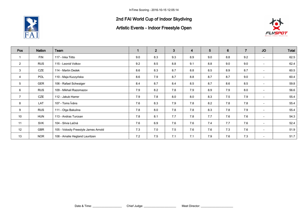 InTime Scoring - 2016-10-15 12:05:14 2nd FAI World Cup of Indoor Skydiving Artistic Events - Indoor Freestyle Open Pos Nation 1 FIN 2 Team 1 2 3 4 5 6 7 JO Total 117 - Inka Tiitto 9.0 8.3 9.3 8.9 9.0 8.8 9.2 - 62.5 RUS 115 - Leonid Volkov 9.2 8.5 8.8 9.1 8.8 9.0 9.0 - 62.4 3 CZE 114 - Martin Dedek 8.6 8.3 8.7 8.8 8.5 8.9 8.7 - 60.5 4 POL 110 - Maja Kuczyńska 8.6 7.9 8.7 8.8 8.7 8.7 9.0 - 60.4 5 GER 106 - Rafael Schwaiger 8.4 8.7 8.4 8.5 8.7 8.6 8.5 - 59.8 6 RUS 109 - Mikhail Razomazov 7.9 8.2 7.8 7.9 8.9 7.9 8.0 - 56.6 7 CZE 112 - Jakub Harrer 7.9 7.8 8.0 8.0 8.3 7.5 7.9 - 55.4 8 LAT 107 - Toms Īvāns 7.6 8.3 7.9 7.8 8.2 7.8 7.8 - 55.4 9 RUS 111 - Olga Bakulina 7.8 8.0 7.8 7.8 8.3 7.8 7.9 - 55.4 10 HUN 113 - Andras Turcsan 7.8 8.1 7.7 7.8 7.7 7.6 7.6 - 54.3 11 SVK 104 - Silvia Lačná 7.6 6.9 7.6 7.6 7.4 7.7 7.6 - 52.4 12 GBR 105 - Volosity Freestyle James Arnold 7.3 7.0 7.5 7.6 7.6 7.3 7.6 - 51.9 13 NOR 108 - Amalie Hegland Lauritzen 7.2 7.5 7.1 7.1 7.9 7.6 7.3 - 51.7 Date & Time: ____________________ Chief Judge: ______________________ Meet Director: ______________________
