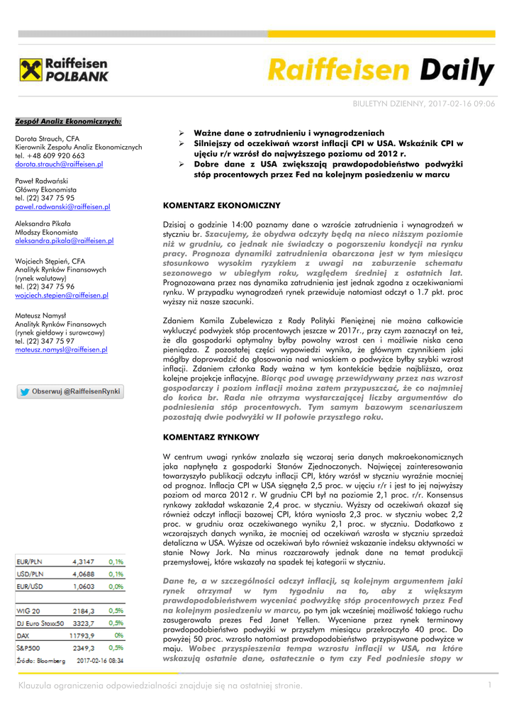 BIULETYN DZIENNY, 2017-02-16 09:06 Zespół Analiz Ekonomicznych: Dorota Strauch, CFA Kierownik Zespołu Analiz Ekonomicznych tel. +48 609 920 663 [email protected] Paweł Radwański Główny Ekonomista tel. (22) 347 75 95 [email protected] Aleksandra Pikała Młodszy Ekonomista [email protected] Wojciech Stępień, CFA Analityk Rynków Finansowych (rynek walutowy) tel. (22) 347 75 96 [email protected] Mateusz Namysł Analityk Rynków Finansowych (rynek giełdowy i surowcowy) tel. (22) 347 75 97 [email protected] Ważne dane o zatrudnieniu i wynagrodzeniach Silniejszy od oczekiwań wzorst inflacji CPI w USA. Wskaźnik CPI w ujęciu r/r wzrósł do najwyższego poziomu od 2012 r. Dobre dane z USA zwiększają prawdopodobieństwo podwyżki stóp procentowych przez Fed na kolejnym posiedzeniu w marcu KOMENTARZ EKONOMICZNY Dzisiaj o godzinie 14:00 poznamy dane o wzroście zatrudnienia i wynagrodzeń w styczniu br. Szacujemy, że obydwa odczyty będą na nieco niższym poziomie niż w grudniu, co jednak nie świadczy o pogorszeniu kondycji na rynku pracy. Prognoza dynamiki zatrudnienia obarczona jest w tym miesiącu stosunkowo wysokim ryzykiem z uwagi na zaburzenie schematu sezonowego w ubiegłym roku, względem średniej z ostatnich lat. Prognozowana przez nas dynamika zatrudnienia jest jednak zgodna z oczekiwaniami rynku. W przypadku wynagrodzeń rynek przewiduje natomiast odczyt o 1.7 pkt. proc wyższy niż nasze szacunki. Zdaniem Kamila Zubelewicza z Rady Polityki Pieniężnej nie można całkowicie wykluczyć podwyżek stóp procentowych jeszcze w 2017r., przy czym zaznaczył on też, że dla gospodarki optymalny byłby powolny wzrost cen i możliwie niska cena pieniądza. Z pozostałej części wypowiedzi wynika, że głównym czynnikiem jaki mógłby doprowadzić do głosowania nad wnioskiem o podwyżce byłby szybki wzrost inflacji. Zdaniem członka Rady ważna w tym kontekście będzie najbliższa, oraz kolejne projekcje inflacyjne. Biorąc pod uwagę przewidywany przez nas wzrost gospodarczy i poziom inflacji można zatem przypuszczać, że co najmniej do końca br. Rada nie otrzyma wystarczającej liczby argumentów do podniesienia stóp procentowych. Tym samym bazowym scenariuszem pozostają dwie podwyżki w II połowie przyszłego roku. KOMENTARZ RYNKOWY W centrum uwagi rynków znalazła się wczoraj seria danych makroekonomicznych jaka napłynęła z gospodarki Stanów Zjednoczonych. Najwięcej zainteresowania towarzyszyło publikacji odczytu inflacji CPI, który wzrósł w styczniu wyraźnie mocniej od prognoz. Inflacja CPI w USA sięgnęła 2,5 proc. w ujęciu r/r i jest to jej najwyższy poziom od marca 2012 r. W grudniu CPI był na poziomie 2,1 proc. r/r. Konsensus rynkowy zakładał wskazanie 2,4 proc. w styczniu. Wyższy od oczekiwań okazał się również odczyt inflacji bazowej CPI, która wyniosła 2,3 proc. w styczniu wobec 2,2 proc. w grudniu oraz oczekiwanego wyniku 2,1 proc. w styczniu. Dodatkowo z wczorajszych danych wynika, że mocniej od oczekiwań wzrosła w styczniu sprzedaż detaliczna w USA. Wyższe od oczekiwań było również wskazanie indeksu aktywności w stanie Nowy Jork. Na minus rozczarowały jednak dane na temat produkcji przemysłowej, które wskazały na spadek tej kategorii w styczniu. Dane te, a w szczególności odczyt inflacji, są kolejnym argumentem jaki rynek otrzymał w tym tygodniu na to, aby z większym prawdopodobieństwem wyceniać podwyżkę stóp procentowych przez Fed na kolejnym posiedzeniu w marcu, po tym jak wcześniej możliwość takiego ruchu zasugerowała prezes Fed Janet Yellen. Wyceniane przez rynek terminowy prawdopodobieństwo podwyżki w przyszłym miesiącu przekroczyło 40 proc. Do powyżej 50 proc. wzrosło natomiast prawdopodobieństwo przypisywane podwyżce w maju. Wobec przyspieszenia tempa wzrostu inflacji w USA, na które wskazują ostatnie dane, ostatecznie o tym czy Fed podniesie stopy w Klauzula ograniczenia odpowiedzialności znajduje się na ostatniej stronie. 1 BIULETYN DZIENNY, 16 lutego 2017, GODZ 9.10 marcu zdecydować może raport z rynku pracy za luty, którego publikacja zaplanowana jest przed zaplanowanym na połowę marca posiedzeniem Fed. Poprzedni raport za styczeń, wskazał na solidny wzrost zatrudnienia jednocześnie jednak rozczarował dynamiką wzrostu wynagrodzeń. Jeśli lutowe dane wskażą na większą poprawę w tej ostatniej kategorii, okazać mogą się decydującym czynnikiem, który przechyli szalę na korzyść marcowej podwyżki. Ważne będzie również to czy do kolejnego posiedzenia Fed w marcu administracja prezydencka w USA przedstawi plan zmian podatkowych, które pod koniec ubiegłego tygodnia zapowiedział prezydent D. Trump. Kształt i skala ewentualnych zmian podatkowych będzie również brana pod uwagę przy podejmowaniu decyzji przez Fed. W reakcji na wczorajsze publikacje makroekonomiczne wzrost zanotowały rentowności obligacji w USA. Rentowność 10-latki przejściowo przekroczyła 2,5 proc. Umocnił się również dolar. Kurs EURUSD zszedł wczoraj w trakcie sesji w okolice 1,052 i był najniżej od połowy stycznia. Później w trakcie sesji jednak dolar oddał to umocnienie i powrócił w okolicę poziomu 1,06. Argumentem za przeceną amerykańskiej waluty okazał się drugi dzień przesłuchania prezes Fed Janet Yellen w Kongresie USA. W jego trakcie powtórzyła ona, że Fed powinien podnosić stopy procentowe w najbliższym czasie, jednocześnie jednak w odpowiedzi na jedno z pytań stwierdziła, że tempo wzrostu gospodarczego w USA może rozczarowywać. Ponowny wzrost kursu EURUSD należy jednak również rozpatrywać w charakterze korekty technicznej wcześniejszego silnego umocnienia dolara, które dominuje od początku tego miesiąca. Dodatkowo do przeceny zachęcić mógł spadek EURUSD w okolice 1,052 – poziom ten z punktu analizy technicznej stanowi silne wsparcie. W tym otoczeniu stabilny pozostaje kurs EURPLN, który utrzymuje się w okolicy 4,3. 