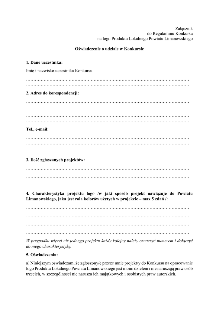 Załącznik do Regulaminu Konkursu na logo Produktu Lokalnego Powiatu Limanowskiego Oświadczenie o udziale w Konkursie 1. Dane uczestnika: Imię i nazwisko uczestnika Konkursu: ………………………………………………………………………………………………… ………………………………………………………………………………………………… 2. Adres do korespondencji: ………………………………………………………………………………………………… ………………………………………………………………………………………………… ………………………………………………………………………………………………… ………………………………………………………………………………………………… Tel., e-mail: ………………………………………………………………………………………………… ………………………………………………………………………………………………… 3. Ilość zgłaszanych projektów: ………………………………………………………………………………………………… ………………………………………………………………………………………………… 4. Charakterystyka projektu logo /w jaki sposób projekt nawiązuje do Powiatu Limanowskiego, jaka jest rola kolorów użytych w projekcie – max 5 zdań /: ………………………………………………………………………………………………… ………………………………………………………………………………………………… ………………………………………………………………………………………………… ………………………………………………………………………………………………… W przypadku więcej niż jednego projektu każdy kolejny należy oznaczyć numerem i dołączyć do niego charakterystykę. 5. Oświadczenia: a) Niniejszym oświadczam, że zgłoszony/e przeze mnie projekt/y do Konkursu na opracowanie logo Produktu Lokalnego Powiatu Limanowskiego jest moim dziełem i nie naruszają praw osób trzecich, w szczególności nie narusza ich majątkowych i osobistych praw autorskich. b) Oświadczam, również, że zapoznałem/am się z Regulaminem Konkursu na opracowanie logo Produktu Lokalnego Powiatu Limanowskiego, w szczególności z częścią dotyczącą przeniesienia praw autorskich, jego postanowienia przyjmuję bez zastrzeżeń. c) Wyrażam zgodę na przetwarzanie moich danych osobowych zawartych w Oświadczeniu dla potrzeb niezbędnych do realizacji konkursu (zgodnie z ustawą z dnia 29 sierpnia 1997 r. o ochronie danych osobowych Dz. U. z 2002 r., Nr 101, poz. 926 z późniejszymi zmianami). ………………………………………………………………………………………………… Data i czytelny podpis uczestnika/uczestników Konkursu ………………………………………………………………………………………………… Data i czytelny podpis przedstawiciela ustawowego niepełnoletniego uczestnika Konkursu – stopień pokrewieństwa
