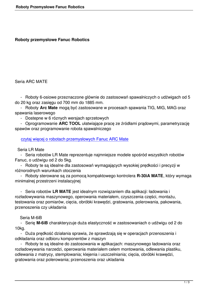 Roboty Przemysłowe Fanuc Robotics Roboty przemysłowe Fanuc Robotics Seria ARC MATE - Roboty 6-osiowe przeznaczone glównie do zastosowań spawalniczych o udźwigach od 5 do 20 kg oraz zasięgu od 700 mm do 1885 mm. - Roboty Arc Mate mogą być zastosowane w procesach spawania TIG, MIG, MAG oraz spawania laserowego - Dostepne w 6 róznych wersjach sprzetowych - Oprogramowanie ARC TOOL ułatwiające pracę ze źródłami prądowymi, parametryzację spawów oraz programowanie robota spawalniczego czytaj więcej o robotach przemysłowych Fanuc ARC Mate Seria LR Mate - Seria robotów LR Mate reprezentuje najmniejsze modele spośród wszystkich robotów Fanuc, o udźwigu od 2 do 5kg. - Roboty te są idealne dla zastosowań wymagających wysokiej prędkości i precyzji w różnorodnych warunkach otoczenia - Roboty sterowane są za pomocą kompaktowego kontrolera R-30iA MATE, który wymaga minimalnej przestrzeni instalacyjnej - Seria robotów LR MATE jest idealnym rozwiązaniem dla aplikacji: ładowania i rozładowywania maszynowego, operowania materiałem, czyszczenia części, montażu, testowania oraz pomiarów, cięcia, obróbki krawędzi, gratowania, polerowania, pakowania, przenoszenia czy układania Seria M-6iB - Serię M-6iB charakteryzuje duża elastyczność w zastosowaniach o udźwigu od 2 do 10kg. - Duża prędkość działania sprawia, że sprawdzają się w operacjach przenoszenia i odkładania oraz odbioru komponentów z maszyn - Roboty te są idealne do zastosowania w aplikacjach: maszynowego ładowania oraz rozładowywania narzedzi, operowania materiałem celem montowania, odlewania plastiku, odlewania z matrycy, stemplowania; klejenia i uszczelniania; cięcia, obróbki krawędzi, gratowania oraz polerowania; przenoszenia oraz ukladania 1/3 Roboty Przemysłowe Fanuc Robotics Seria M-10iA - Serię M-10iA charakteryzuje duża elastyczność w zastosowaniach przy ciężarze ładunku do 10kg. - Idealne do stosowania w aplikacjach: maszynowego ładowania oraz rozładowywania narzędzi; operowania materiałem w celu montowania, odlewania tworzyw sztucznych; klejenia i uszczelniania; cięcia, obróbki krawędzi, gratowania oraz polerowania; opakowywania i pakowania Seria M-16iB - Serię M-16iB charakteryzuje duża elastyczność w zastosowaniach przy ciężarze ładunku od 10 do 20kg. - Znajdują zastosowanie w aplikacjach: maszynowego ładowania i rozładowywania elementów; przenoszenia materiałów; montażu; klejenia i uszczelniania; cięcia, obróbki krawędzi, gratowania oraz polerowania Seria M-710iC - Innowacyjna seria robotów M-710iC została zaprojektowana do operowania średnimi ładunkami (od 20 do 70 kg). - Dzięki zastosowaniu wąskiej kiści, sztywnemu ramieniu, oraz małej podstawie, jest idealnym rozwiązaniem dla bardzo szerokiej gamy zastosowań. - Sprawdza się w aplikacjach: operowania materiałem; maszynowego ładowania i rozładowywania narzędzi; obsługi maszyn; przekazywania części; montazu, cięcia, obróbki krawędzi, gratowania, polerowania; odbioru elementów odlewanych dzięki opcji klasy ochrony IP67; spawania łukowego ciężkich oraz długich części - Posiadają najwyższą bezwladność kiści w swojej klasie zapeniającą mozliwość operowania narzędziami przy duzych prędkościach Seria R-2000iB - Seria R-2000iB posiada szeroki zakres udźwigów (od 100 do 210 kg) - Roboty przemysłowe tej serii mogą być stosowane do: zgrzewania punktowego w przemysle samochodowym; operowania komponentami; cięcia i gratowania; paletyzacji i depaletyzacji; ładowania i rozładowywania maszyn; operowania odlewkami; montażu, uszczelniania i klejenia - Posiadają możliwość operowania większym chwytakiem lub z dużym obciążeniem przy dużej prędkości zapewniając większą przepustowość stanowiska Seria M-900iA - 6-osiowe roboty posiadające jedne z najwyższych udźwigów dostępnych na rynku - Zaprojektowane do operowania bardzo ciężkimi lub złożonymi elementami (udźwig od 260 do 700kg) - Kompaktowa kiść: brak serwonapędów oraz klasa ochrony przez zanieczyszczeniami IP67 - Większy dozwolony moment mechaniczny kiści oraz bezwładność 2/3 Roboty Przemysłowe Fanuc Robotics Seria M-410iB - Roboty 4-osiowe dedykowane do paletyzowania o udźwigach w zakresie 160 - 450 kg - Posiadają zoptymalizowaną konstrukcję pod kątem paletyzowania - Podstawa robota zintegrowana z kontrolerem 3/3