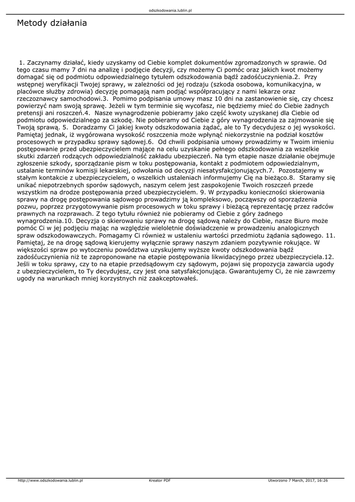 odszkodowania.lublin.pl Metody działania 1. Zaczynamy działać, kiedy uzyskamy od Ciebie komplet dokumentów zgromadzonych w sprawie. Od tego czasu mamy 7 dni na analizę i podjęcie decyzji, czy możemy Ci pomóc oraz jakich kwot możemy domagać się od podmiotu odpowiedzialnego tytułem odszkodowania bądź zadośćuczynienia.2. Przy wstępnej weryfikacji Twojej sprawy, w zależności od jej rodzaju (szkoda osobowa, komunikacyjna, w placówce służby zdrowia) decyzję pomagają nam podjąć współpracujący z nami lekarze oraz rzeczoznawcy samochodowi.3. Pomimo podpisania umowy masz 10 dni na zastanowienie się, czy chcesz powierzyć nam swoją sprawę. Jeżeli w tym terminie się wycofasz, nie będziemy mieć do Ciebie żadnych pretensji ani roszczeń.4. Nasze wynagrodzenie pobieramy jako część kwoty uzyskanej dla Ciebie od podmiotu odpowiedzialnego za szkodę. Nie pobieramy od Ciebie z góry wynagrodzenia za zajmowanie się Twoją sprawą. 5. Doradzamy Ci jakiej kwoty odszkodowania żądać, ale to Ty decydujesz o jej wysokości. Pamiętaj jednak, iż wygórowana wysokość roszczenia może wpłynąć niekorzystnie na podział kosztów procesowych w przypadku sprawy sądowej.6. Od chwili podpisania umowy prowadzimy w Twoim imieniu postępowanie przed ubezpieczycielem mające na celu uzyskanie pełnego odszkodowania za wszelkie skutki zdarzeń rodzących odpowiedzialność zakładu ubezpieczeń. Na tym etapie nasze działanie obejmuje zgłoszenie szkody, sporządzanie pism w toku postępowania, kontakt z podmiotem odpowiedzialnym, ustalanie terminów komisji lekarskiej, odwołania od decyzji niesatysfakcjonujących.7. Pozostajemy w stałym kontakcie z ubezpieczycielem, o wszelkich ustaleniach informujemy Cię na bieżąco.8. Staramy się unikać niepotrzebnych sporów sądowych, naszym celem jest zaspokojenie Twoich roszczeń przede wszystkim na drodze postępowania przed ubezpieczycielem. 9. W przypadku konieczności skierowania sprawy na drogę postępowania sądowego prowadzimy ją kompleksowo, począwszy od sporządzenia pozwu, poprzez przygotowywanie pism procesowych w toku sprawy i bieżącą reprezentację przez radców prawnych na rozprawach. Z tego tytułu również nie pobieramy od Ciebie z góry żadnego wynagrodzenia.10. Decyzja o skierowaniu sprawy na drogę sądową należy do Ciebie, nasze Biuro może pomóc Ci w jej podjęciu mając na względzie wieloletnie doświadczenie w prowadzeniu analogicznych spraw odszkodowawczych. Pomagamy Ci również w ustaleniu wartości przedmiotu żądania sądowego. 11. Pamiętaj, że na drogę sądową kierujemy wyłącznie sprawy naszym zdaniem pozytywnie rokujące. W większości spraw po wytoczeniu powództwa uzyskujemy wyższe kwoty odszkodowania bądź zadośćuczynienia niż te zaproponowane na etapie postępowania likwidacyjnego przez ubezpieczyciela.12. Jeśli w toku sprawy, czy to na etapie przedsądowym czy sądowym, pojawi się propozycja zawarcia ugody z ubezpieczycielem, to Ty decydujesz, czy jest ona satysfakcjonująca. Gwarantujemy Ci, że nie zawrzemy ugody na warunkach mniej korzystnych niż zaakceptowałeś. http://www.odszkodowania.lublin.pl Kreator PDF Utworzono 7 March, 2017, 16:26