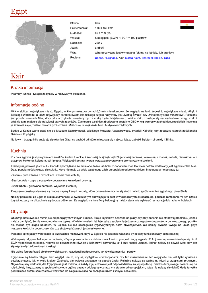 Egipt Stolica: Kair Powierzchnia: 1 001 450 km² Ludność: 80 471,9 tys. Waluta: funt egipski (EGP), 1 EGP = 100 piastrów Napięcie: 220 V Język: arabski Wiza: wiza turystyczna jest wymagana (płatna na lotnisku lub granicy) Regiony: Dahab, Hurghada, Kair, Marsa Alam, Sharm el Sheikh, Taba Kair Krótka informacja Piramidy, Sfinks i tysiące zabytków w niezwykłym otoczeniu. Informacje ogólne Kair – stolica i największe miasto Egiptu, w którym mieszka ponad 6,5 mln mieszkańców. Ze względu na fakt, że jest to największe miasto Afryki i Bliskiego Wschodu, a także największy ośrodek świata islamskiego często nazywany jest „Matką Świata” czy „Miastem tysiąca minaretów”. Położony jest po obu stronach Nilu, który od starożytności uważany był za rzekę życia. Najstarsza dzielnica Kairu znajduje się na wschodnim brzegu rzeki i właśnie tam znajduje się najwięcej starych zabytków. Zachodnie dzielnice zbudowane zostały w XIX w. wg wzorców zachodnioeuropejskich i cechują je szerokie aleje, zieleń i otwarte przestrzenie. Mieści się tu większość biur i budynków rządowych. Będąc w Kairze warto udać się do Muzeum Starożytności, Wielkiego Meczetu Alabastrowego, cytadeli Kairskiej czy zobaczyć starochrześcijańską Dzielnice Koptyjską. Na lewym brzegu Nilu znajduje się również Giza, na zachód od której mieszczą się najważniejsze zabytki Egiptu – piramidy i Sfinks. Kuchnia Kuchnia egipska jest połączeniem smaków kuchni tureckiej i arabskiej. Najczęściej króluje w niej baranina, wołowina, czosnek, cebula, pietruszka, a z przypraw kurkuma, kolendra, sól i pieprz. Większość potraw tworzą warzywa przyprawiane aromatycznymi ziołami. Tradycyjną potrawą jest Foul – klopsiki sporządzane ze zmielonej fasoli lub bobu z dodatkiem ziół. Do wielu potraw dodawany jest egipski chleb Aisz. Dużą popularnością cieszą się sałatki, które nie mają za wiele wspólnego z ich europejskim odpowiednikiem. Inne popularne potrawy to: -Bisara – pure z fasoli z czosnkiem i zasmażana cebulą, -Szurbet Ads – zupa z soczewicy doprawiana kminkiem i cytryną, -Szisz Kbab – grilowana baranina, wątróbka z cebulą. Z napojów często podawane są mocne napary kawy i herbaty, które przeważnie mocno się słodzi. Warto spróbować też egipskiego piwa Stella. Należy pamiętać, że Egipt to kraj muzułmański i w związku z tym obowiązuje tu post w wyznaczonych okresach, np. podczas ramadanu. W tym czasie turyści jedzący na ulicach nie są dobrze odbierani. Ze względu na inna florę bakteryjną należy starannie wybierać restauracje lub jadać w hotelach. Obyczaje Obyczaje hotelowe nie różnią się od panujących w innych krajach. Stroje kąpielowe noszone na plaży czy przy basenie nie stanowią problemu, jednak należy pamiętać, że nie wolno opalać się toples. W wielu hotelach istnieje zakaz zabierania jedzenia cz napojów do pokoju, a do wieczornego posiłku nie można być skąpo ubranym. W Egipcie nie ma szczególnie rygorystycznych norm obyczajowych, ale należy zwrócić uwagę na ubiór, gdyż noszenie krótkich spódnic, szortów czy strojów plażowych jest niestosowne. Personel sprzątający w hotelach to przeważnie mężczyźni, gdyż w Egipcie nie jest mile widziane by kobiety funkcjonowały poza rodziną. Ważną rolę odgrywa bakszysz – napiwek, który w porównaniem z niskimi zarobkami często jest drugą wypłatą. Pokojowemu przeważnie daje się ok. 5 EGP tygodniowo za osobę. Napiwki są powszechne również u kelnerów i barmanów jak i przy każdej usłudze, jednak należy go dawać tylko, gdy jest się naprawdę zadowolonym z usługi. Nie wolno fotografować obiektów wojskowych, rezydencji państwowych, jak również mostów i portów. Egipcjanie są bardzo religijni, bez względu na to, czy są koptyjskimi chrześcijanami, czy też muzułmanami. Ich religijność nie jest tylko rytualna i powierzchowna, jak w wielu krajach Zachodu, ale wpływa znacząco na sposób życia. Religijne nakazy są ważne na równi z przepisami prawnymi. Najważniejszą wartością dla Egipcjanina jest rodzina, a każdy z jej członków jest odpowiedzialny za jej reputację. Bardzo dużą uwagę zwraca się na rolę kobiety i mężczyzny w społeczeństwie, a ogólne zasady odbiegają w znacznym stopniu od europejskich, toteż nie należy się dziwić kiedy turystka podróżująca autobusem zostanie wezwana do zajęcia miejsca na początku razem z innymi kobietami. Wydruk ze strony Informacje przygotowane przez MerlinX Strona 1/2 Panom stanowczo odradza się flirtowanie czy nawet rozmowę z lokalnymi niewiastami – stanowi to poważne złamanie kodeksu moralnego. Ważne informacje MSZ Wydruk ze strony Informacje przygotowane przez MerlinX Powered by TCPDF (www.tcpdf.org) Strona 2/2